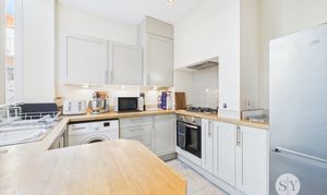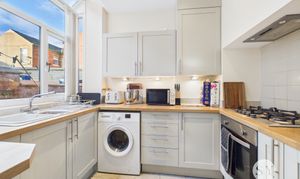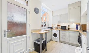 Range of fitted wall and base units and contrasting laminate work surfaces, under stairs cupboard, tiled flooring, eye level cupboards with downlights, uPVC double glazed window, vertical blinds, space for washing machine, space for fridge-freezer, integral oven, gas hob, panel radiator.