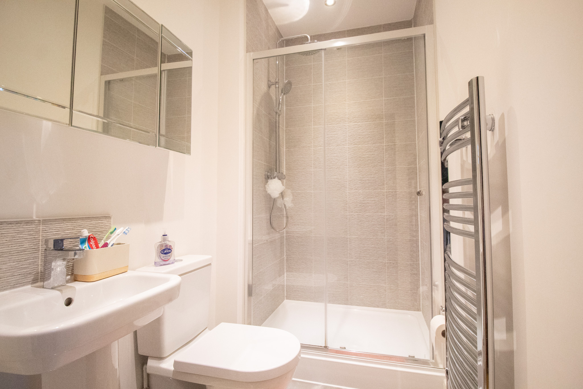 With tiled flooring, shower cubicle with tiled wall surround, toilet, wash basin on pedestal, and towel radiator.