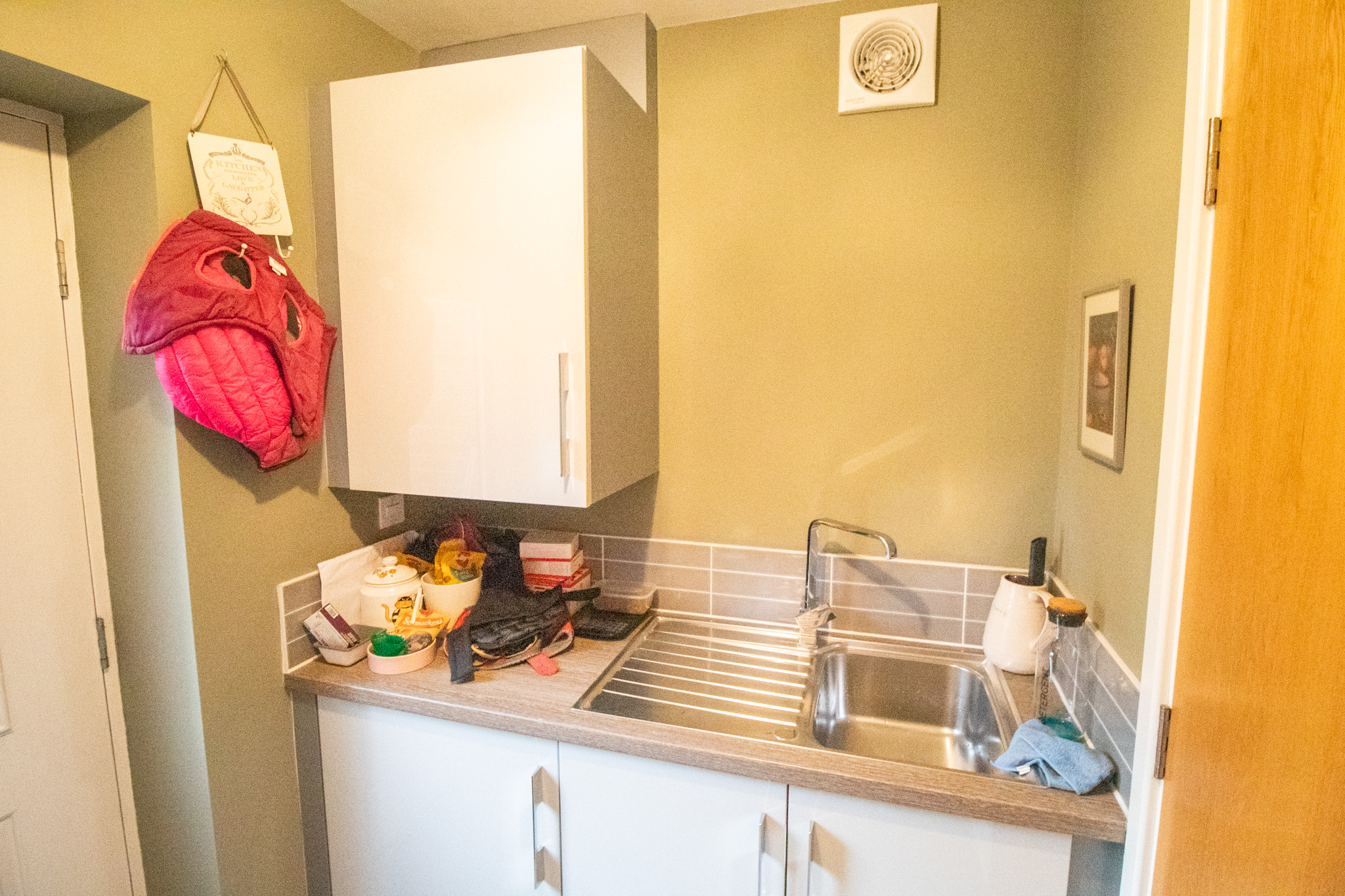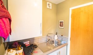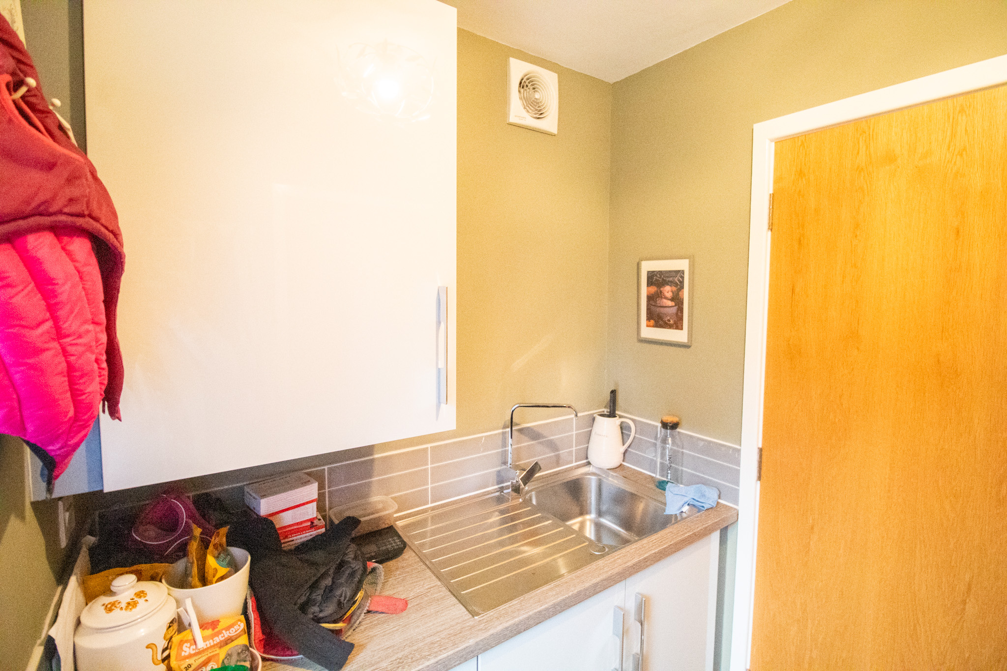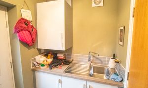 With tiled flooring, laminate worktop, slab units with handle, sink and tap, and door to the rear garden.