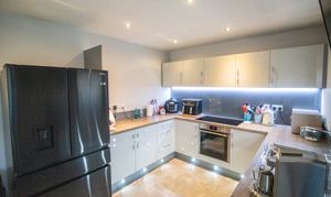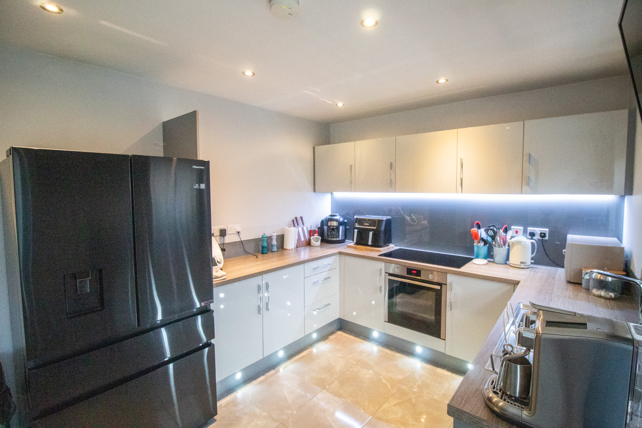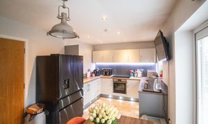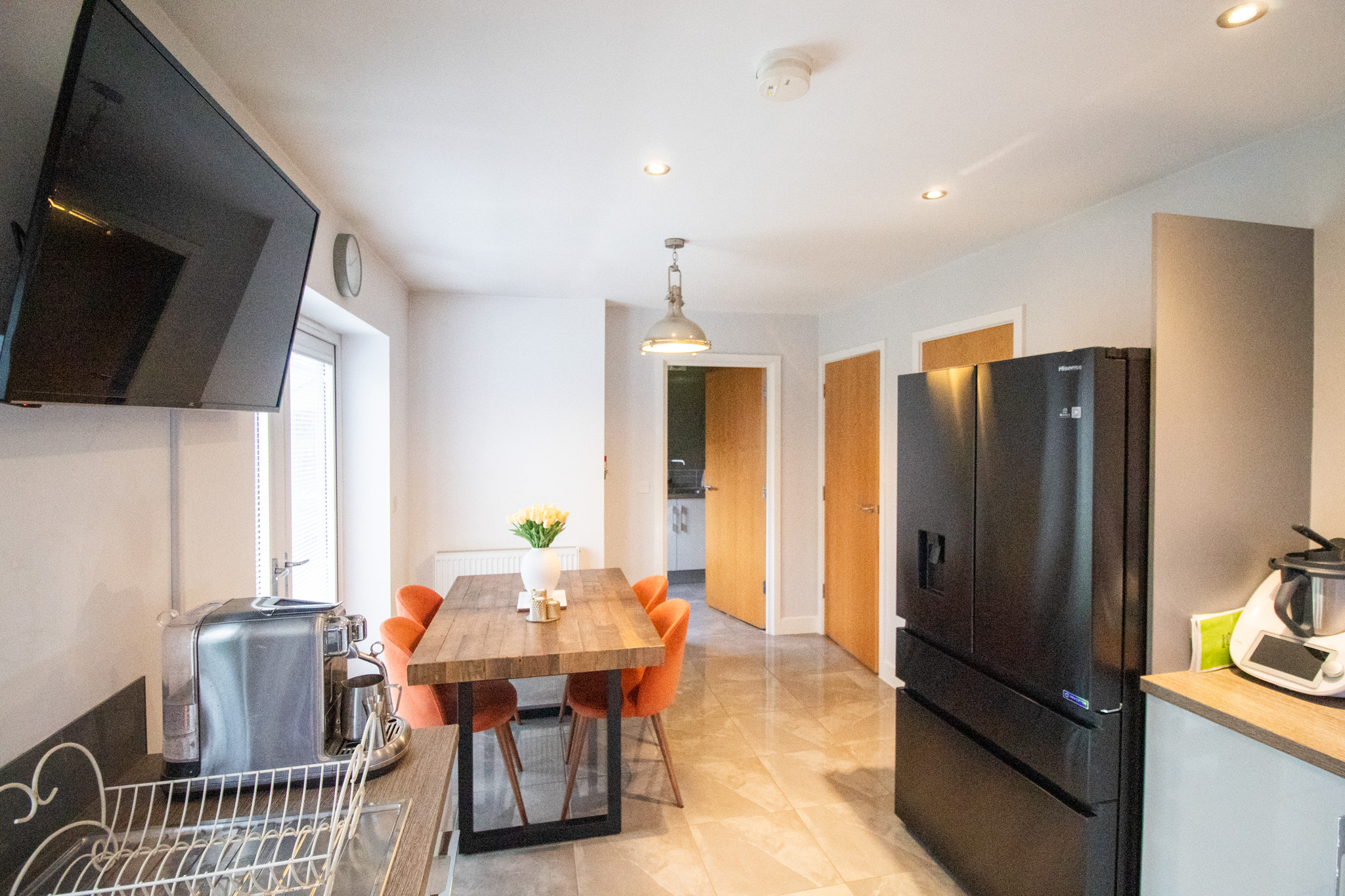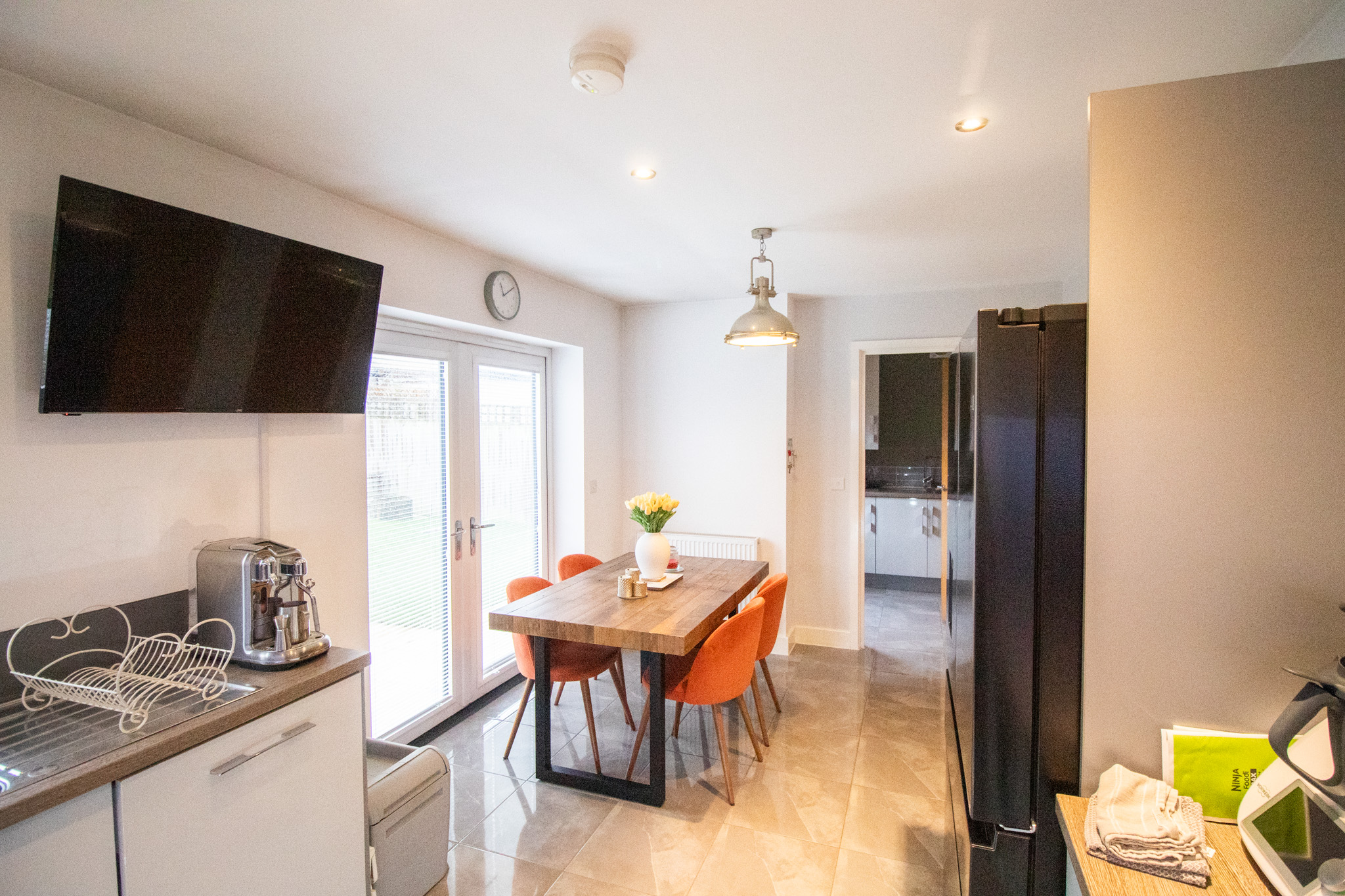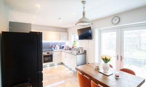 With tiled flooring, slab styled units, integrated appliances including 5 ring Siemens induction hob, oven, washing machine, dishwasher, space for American Fridge Freezer, radiator, French doors to the rear garden, and door to utility room.