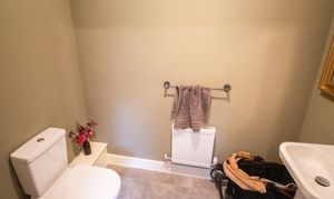 With tiled floor, toilet, wash basin on pedestal, and radiator.