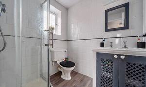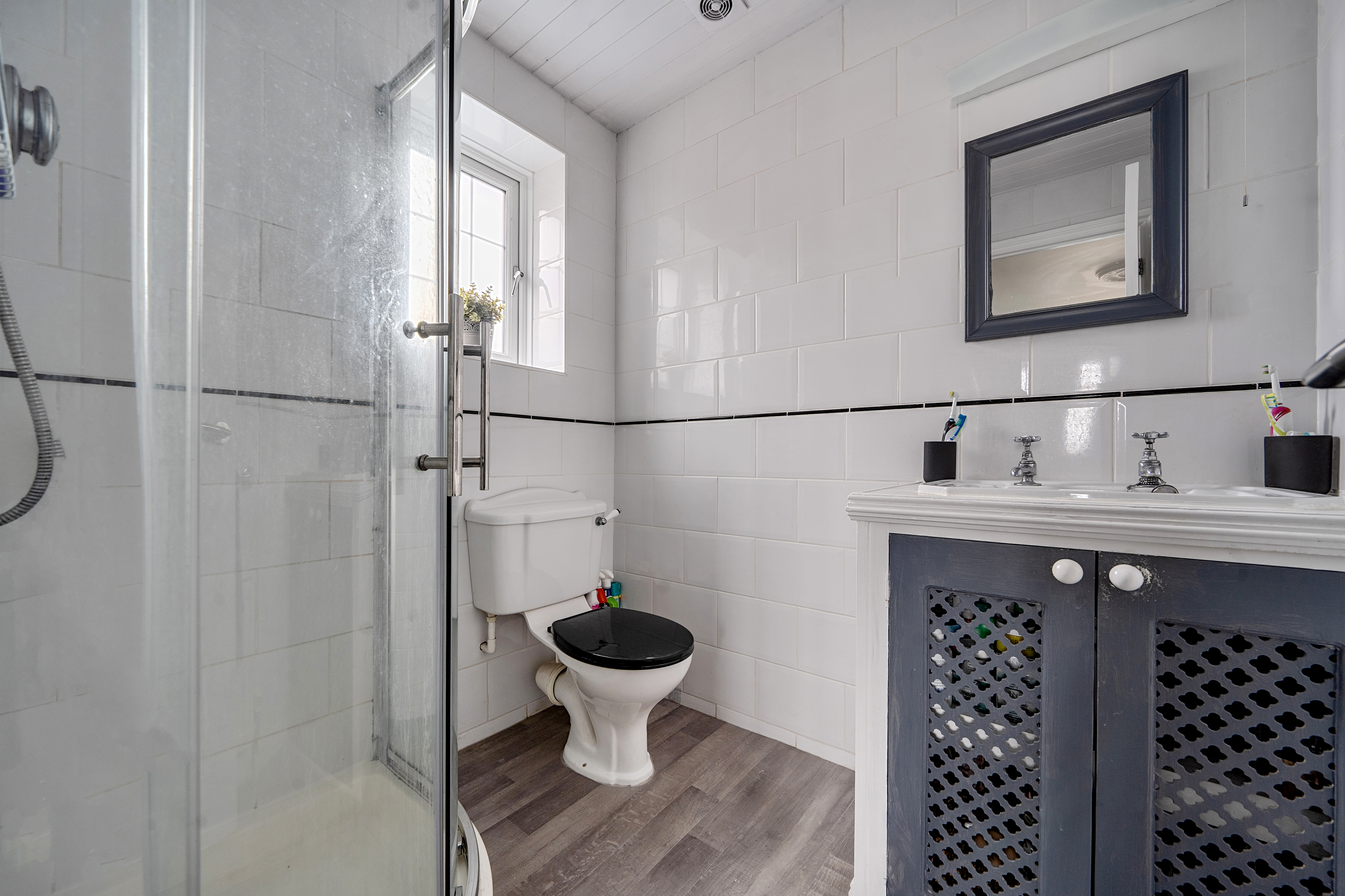 Laminate flooring, corner shower unit, low level WC, wash hand basin with storage below, double glazed window to side with obscured glass, radiator.