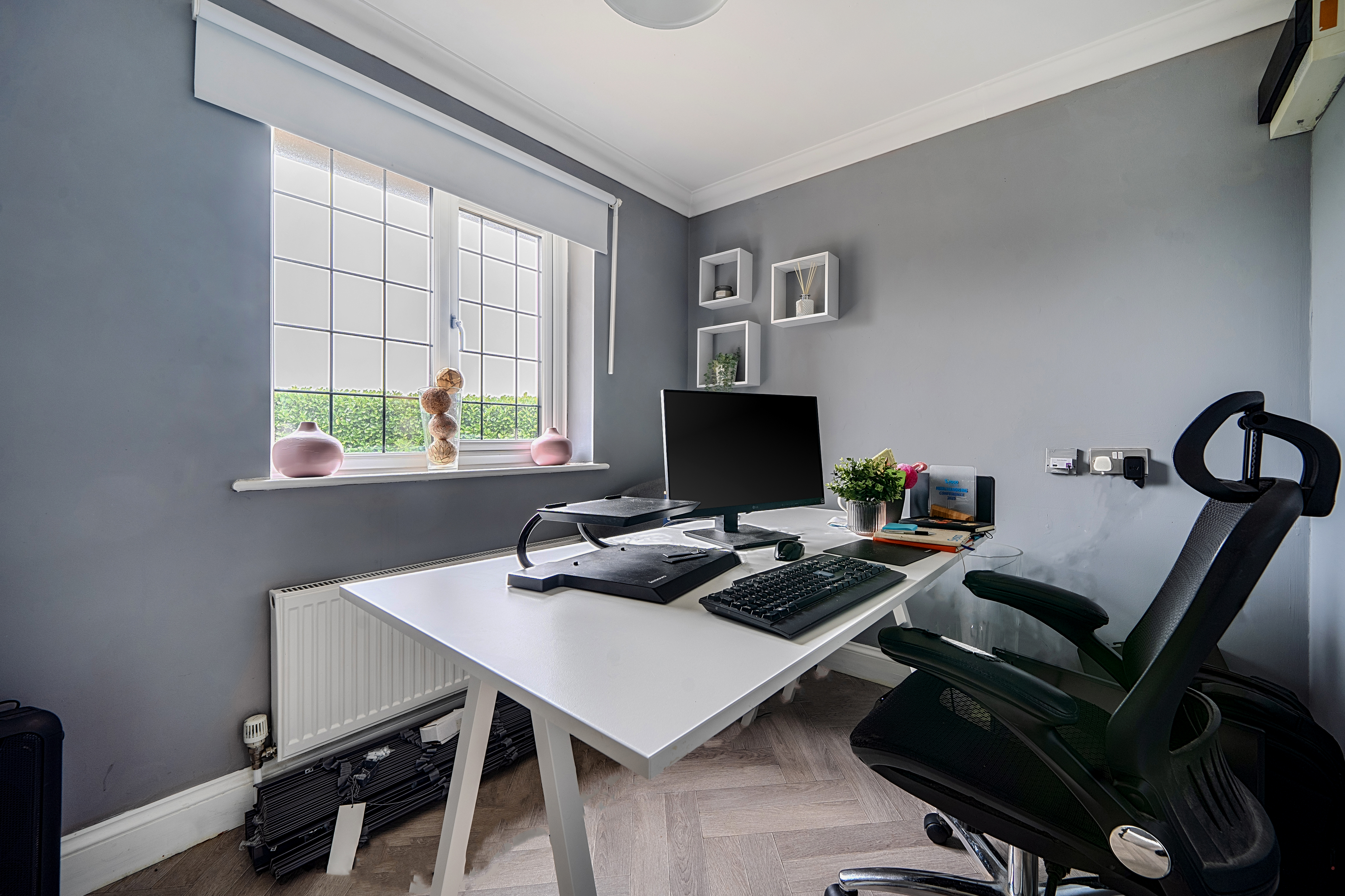 A galleried landing accessed via carpeted stairs, flows into an "S" shape with three double glazed windows, with one area suitable for a further working from home/office space. Carpeted, storage cupboard, airing cupboard. Doors to three bedrooms and family bathroom.