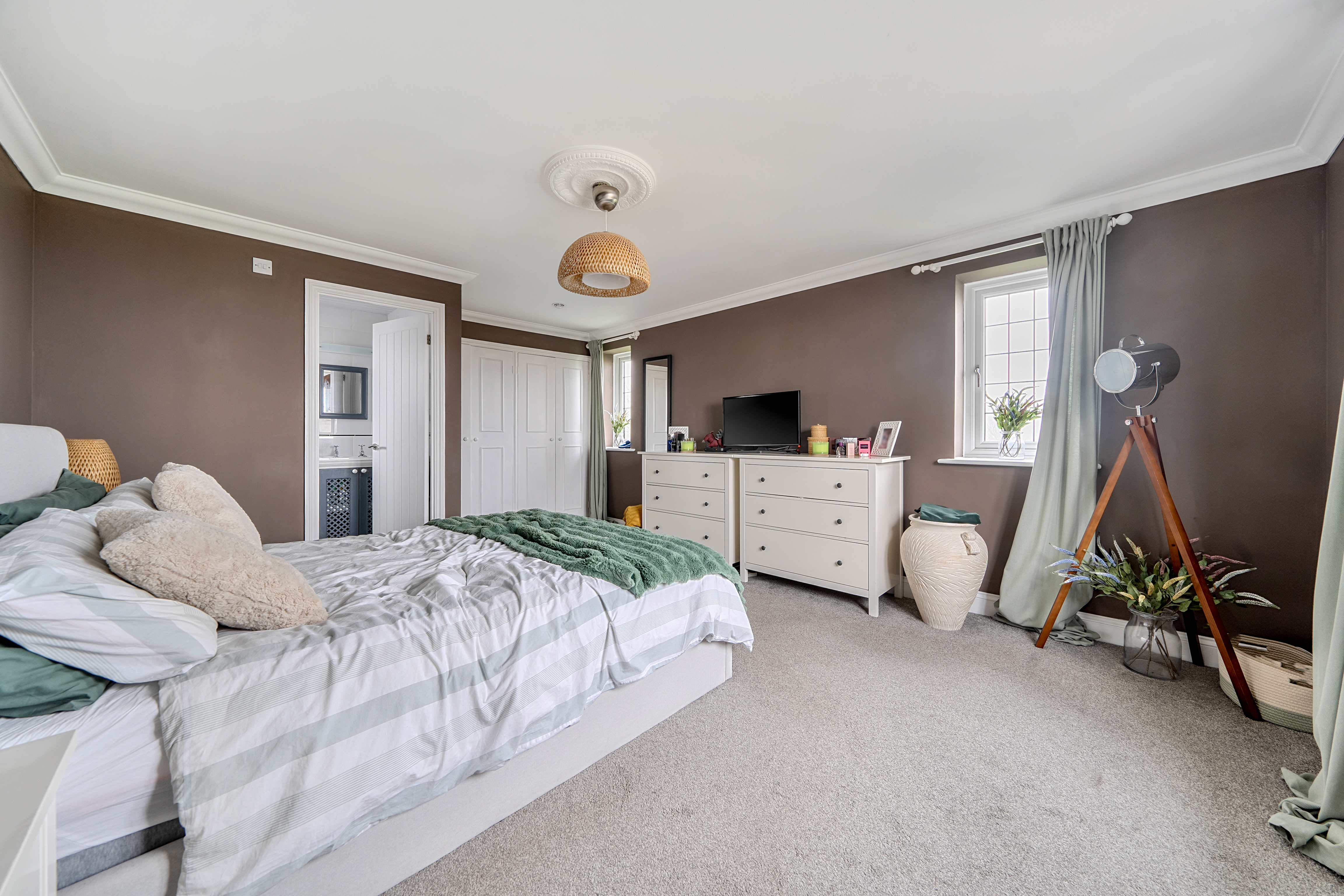 Dual aspect with two double glazed windows to side with views, further double glazed window to front, carpeted, two large wardrobes with hanging rail and shelving, radiator. Access to: