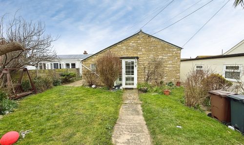 A large, South facing, wraparound garden primarily laid to lawn with laurel hedging to front and side, summerhouse, large shed.