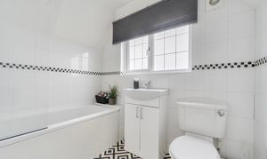 Laminate flooring, double glazed window to rear with obscured glass, bath with shower over, low level WC, wash hand basin with storage, radiator.