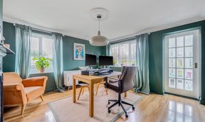 Brick built with laminate flooring, patio doors leading onto the garden, radiator. Door to dining room.