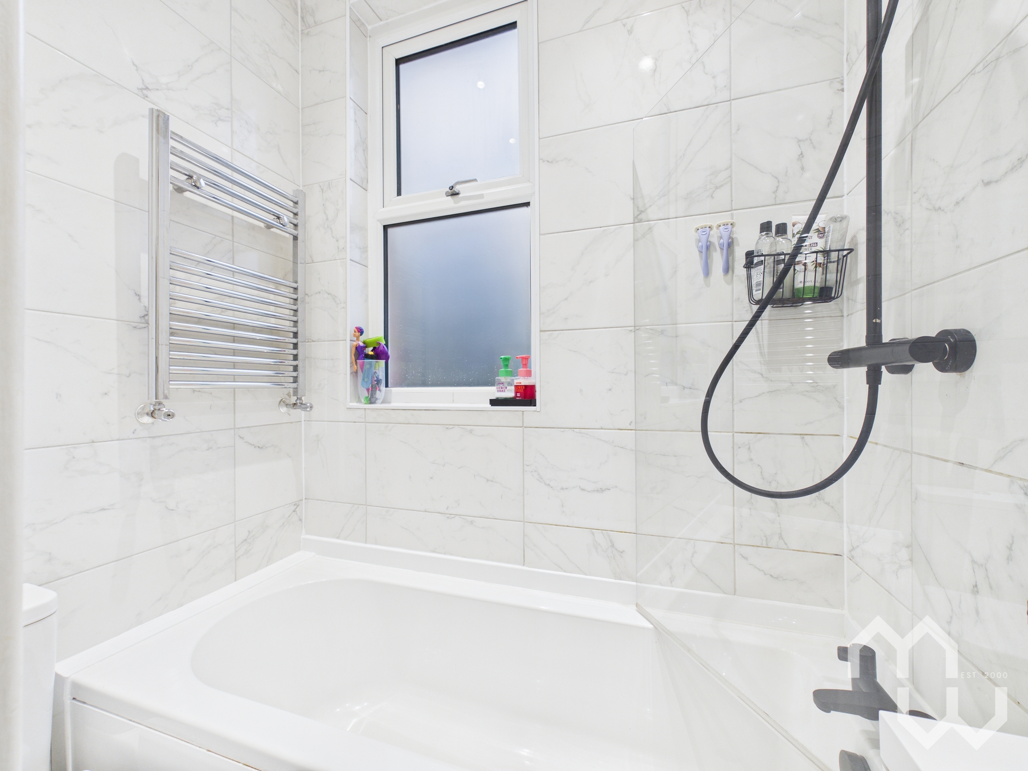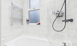 Three piece suite comprising panelled bath with over head shower, vanity wash hand basin & low level w.c. Feature heated towel rail. Fully tiled walls. Tiled flooring. Window to rear.