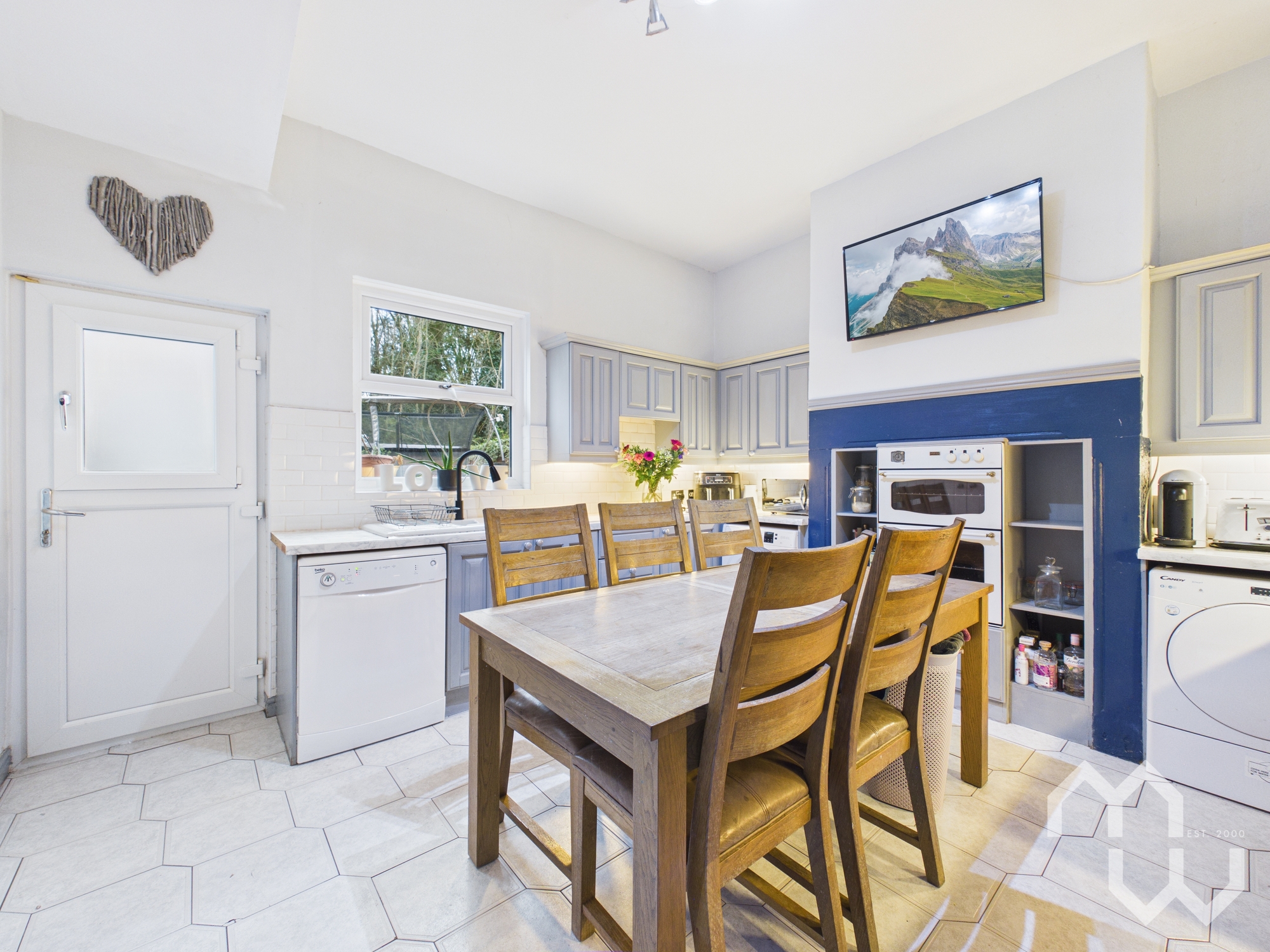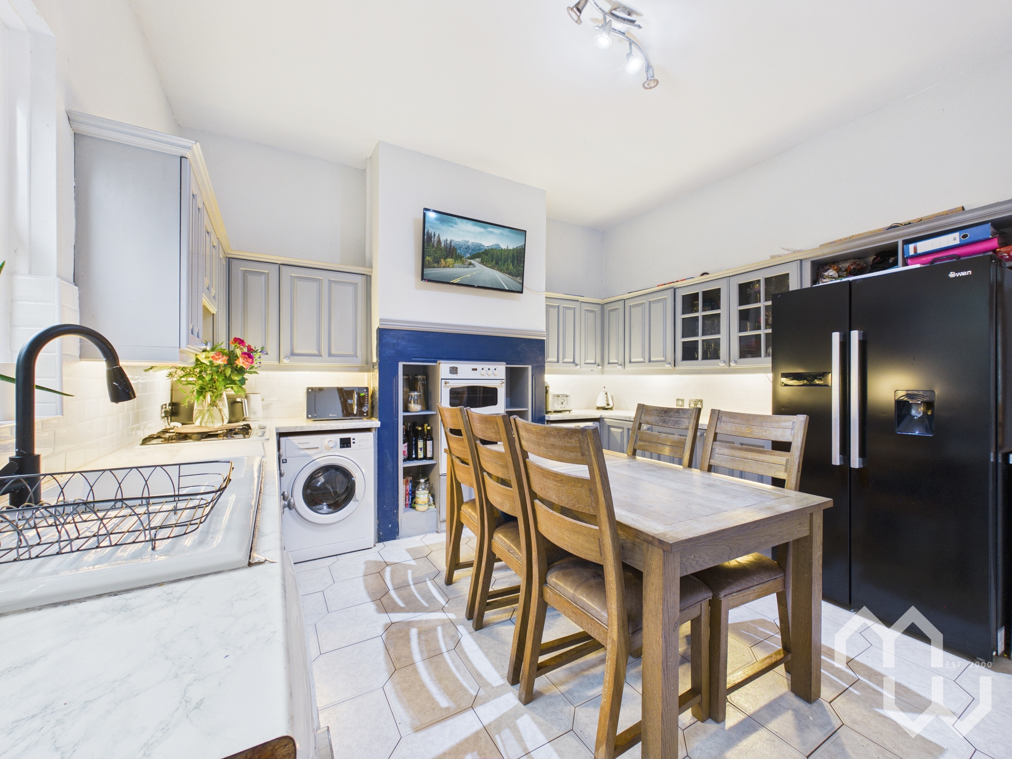 Excellent range of eye and low level units comprising 1 & 1/2 ceramic sink & drainer. Integrated appliances include electric double oven & four ring gas hob with over head extractor. Space for dishwasher, american fridge freezer, washing machine, and tumble dryer. Large walk-in pantry. Dining space. Partially tiled walls. Tiled flooring. Window to rear.