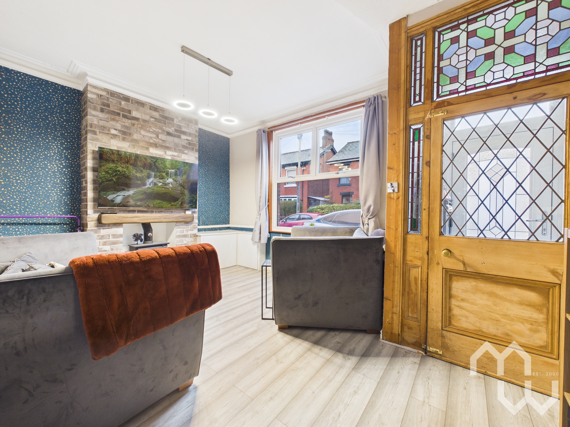 Porch area with internal glass stained door. Laminate flooring. Door to front.