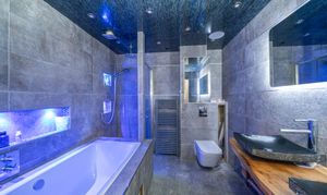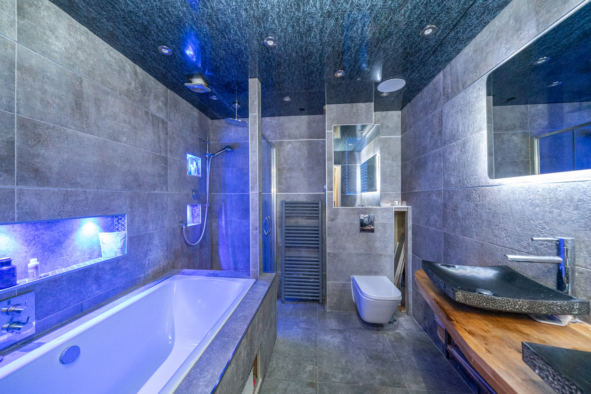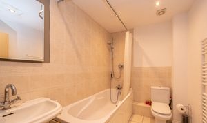 The first floor features two large double bedrooms alongside a recently fully refitted and modernised bathroom, finished with stone tiles, feature lighting, a separate bath and shower, and twin sinks. Upstairs, the second floor provides two further double bedrooms with a bathroom serving this level.