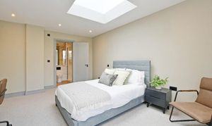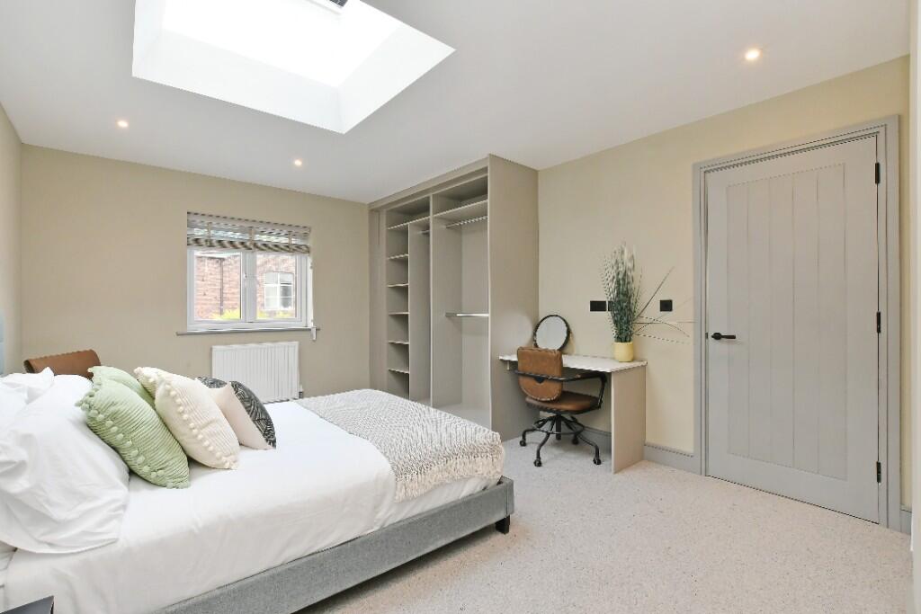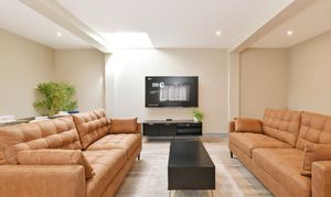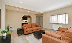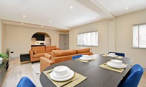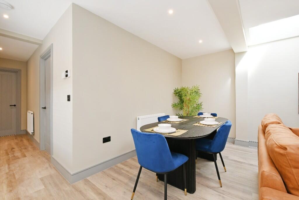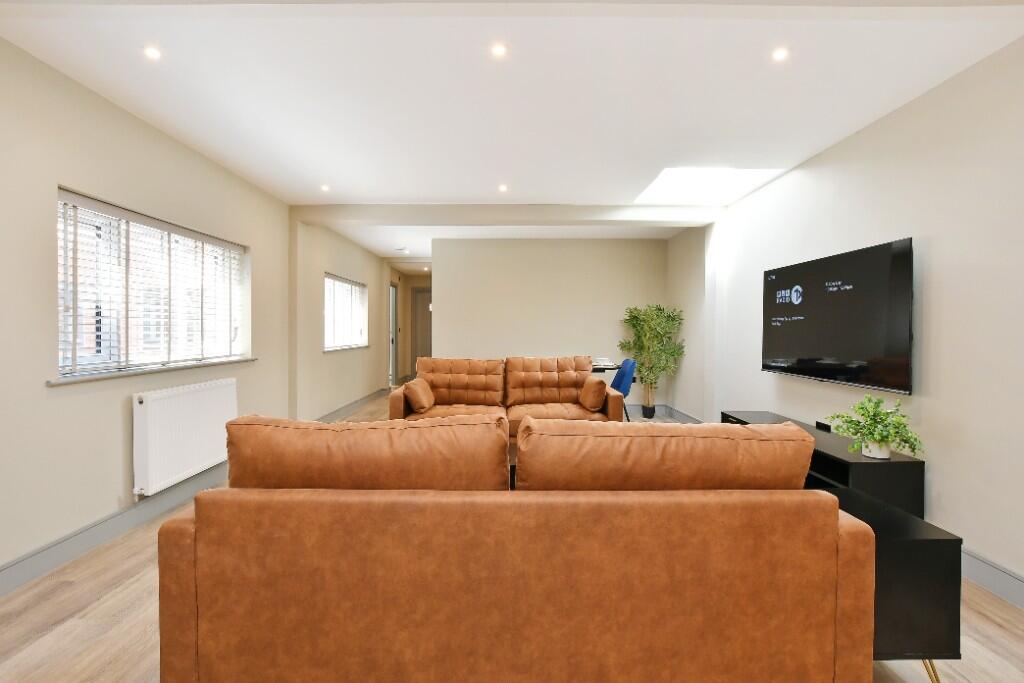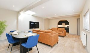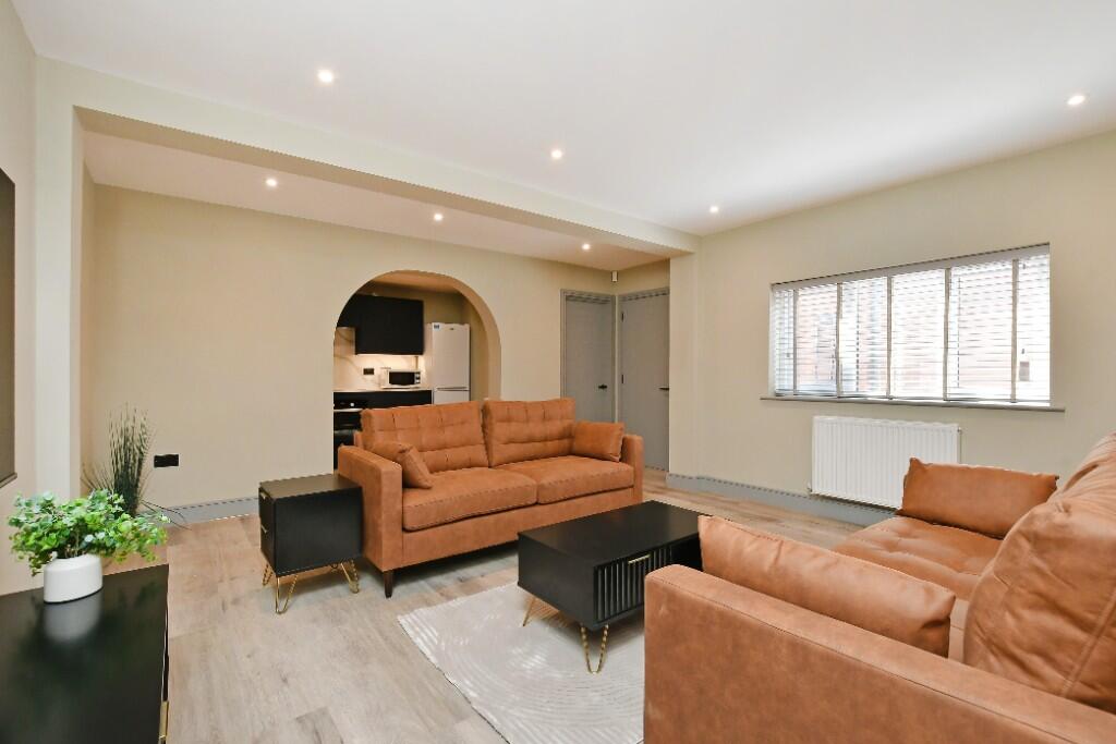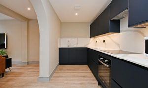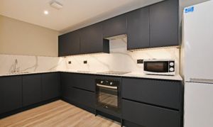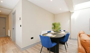 This recently redeveloped two-bedroom apartment offers high-quality, modern living in an unbeatable Sheffield City Centre location. Finished to an exceptional standard, the open-plan layout features a spacious living area with two comfortable sofas, a large wall-mounted 55-inch Smart TV, and a stylish designer kitchen complete with ink blue cabinetry, marble worktops, integrated appliances, and a generous breakfast island.
