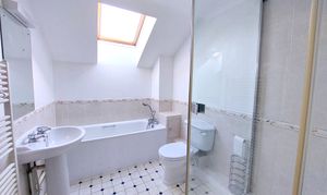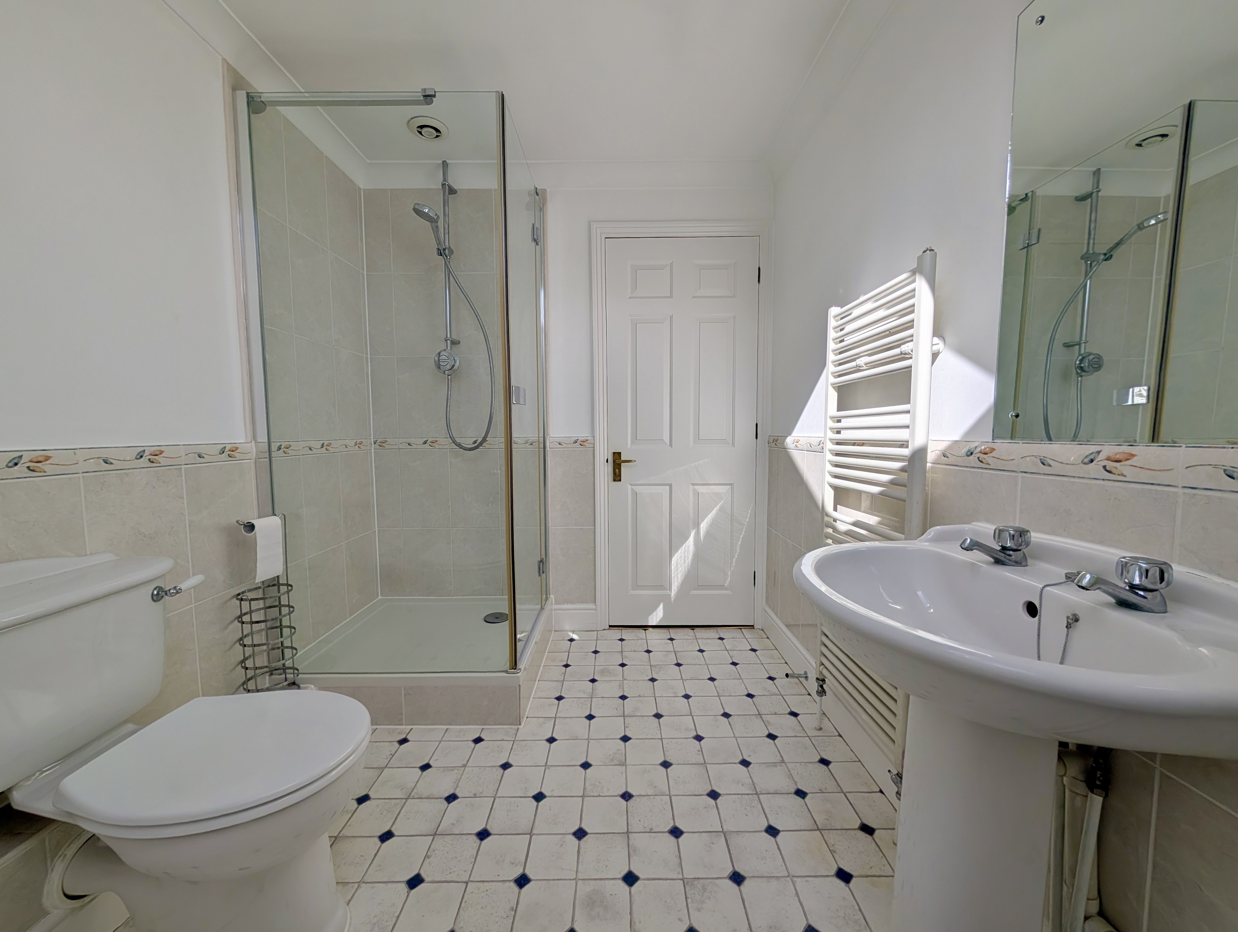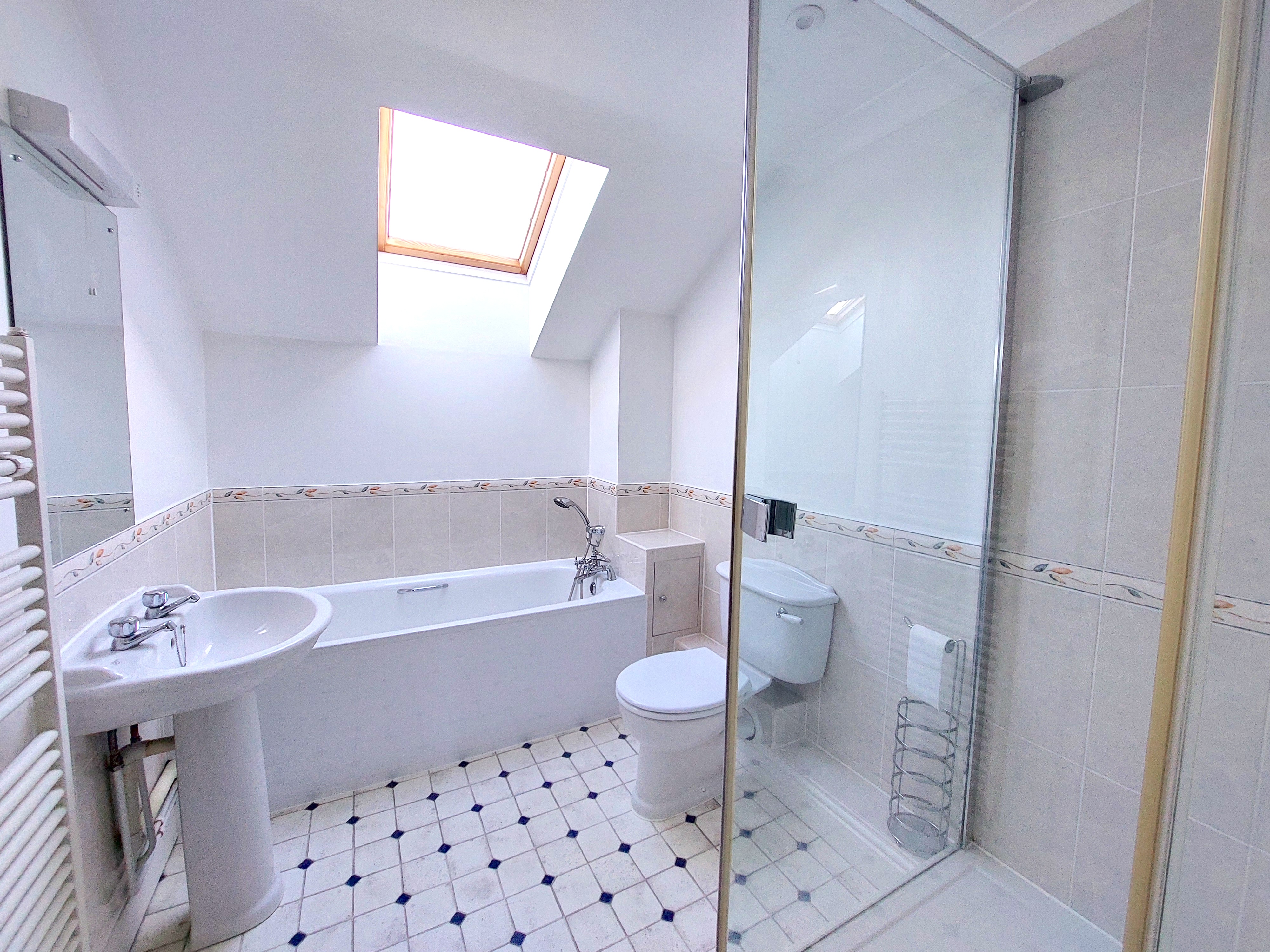 Upstairs, the property offers two double bedrooms (one with built-in storage), a third bedroom ideal as a study or single room, and a family bathroom complete with both a bath and separate shower cubicle.