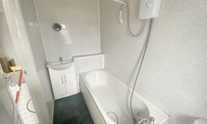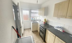 With vinyl flooring, laminate work surfaces, space for appliances, double glazed window, sink/drainer, doors leading to the rear yard and downstairs bathroom.