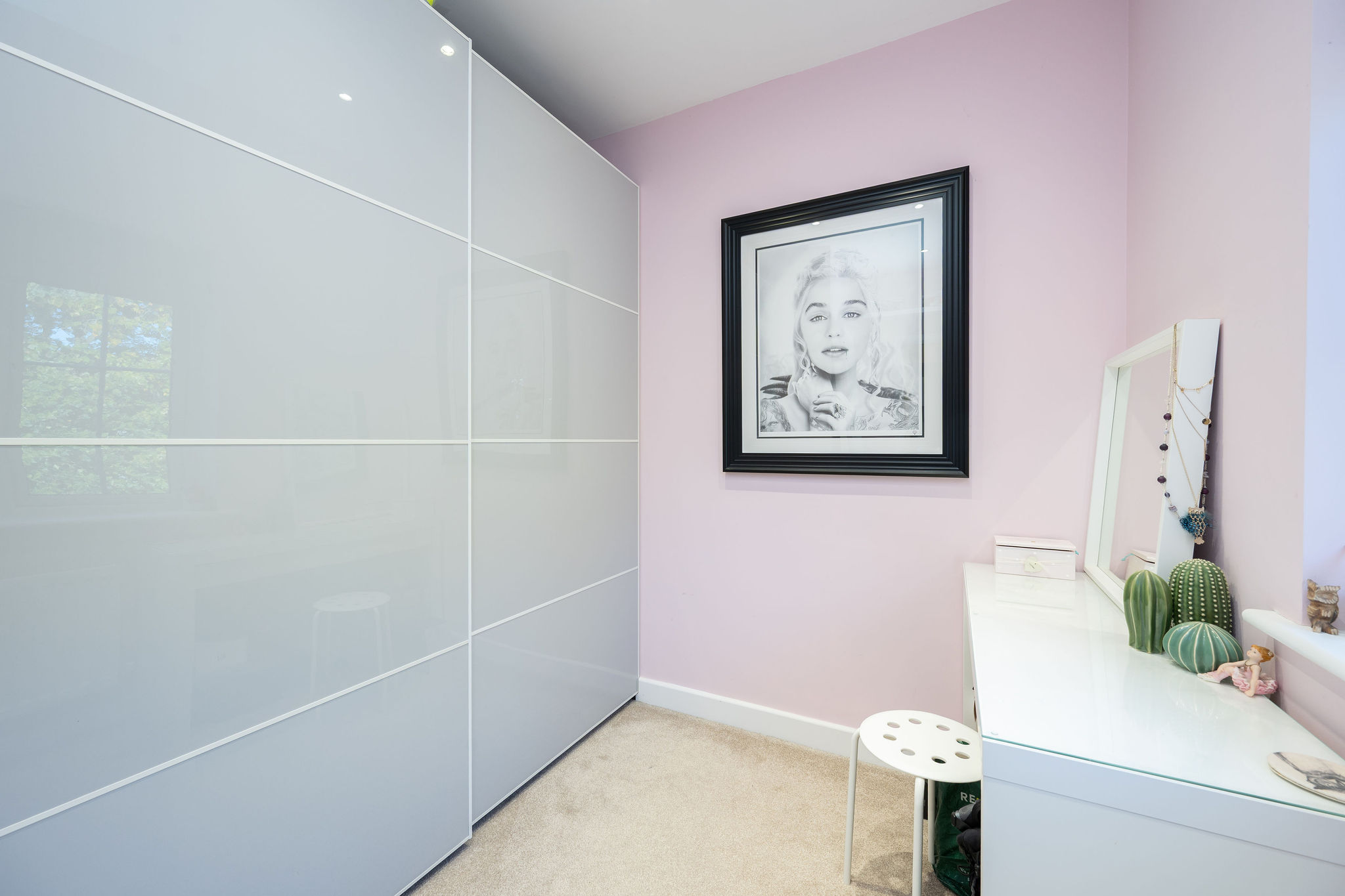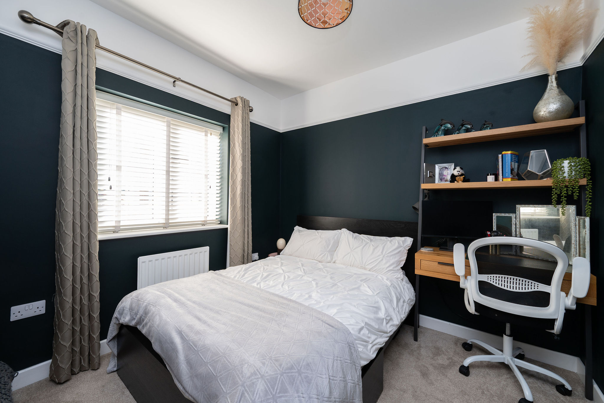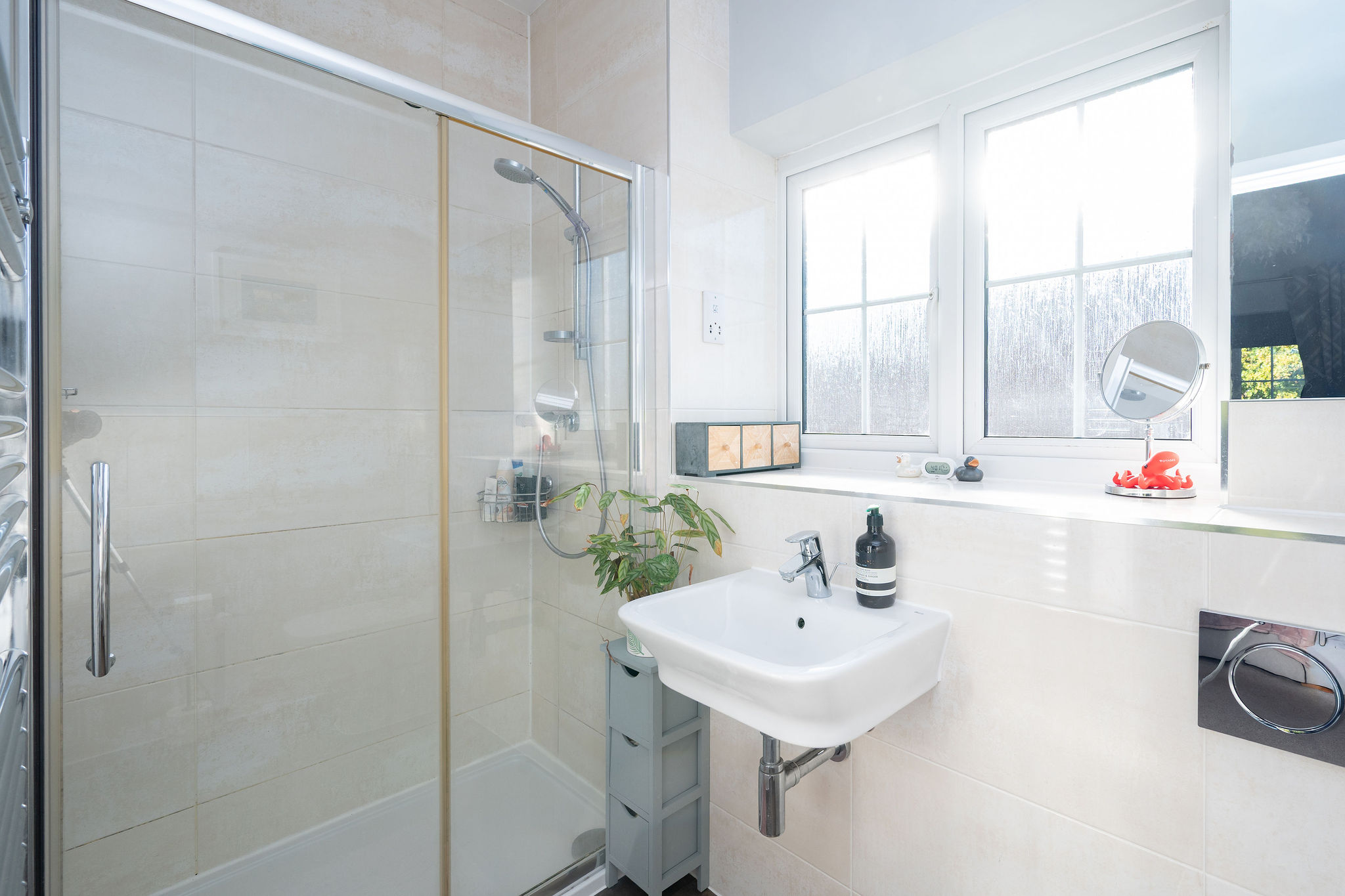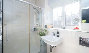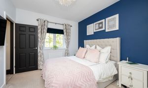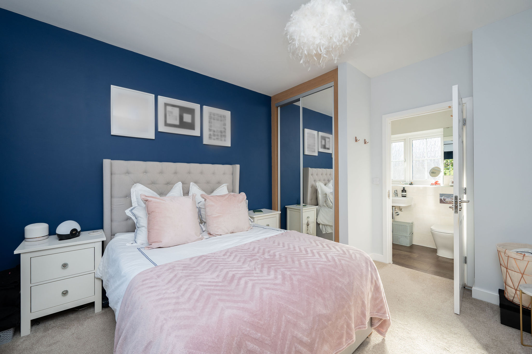 First FloorThe principal bedroom overlooks the rear garden and benefits from fitted wardrobes and a stylish en-suite shower room featuring a large walk-in shower, wash hand basin, and low-level WC, all finished with quality chrome fittings.