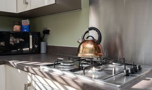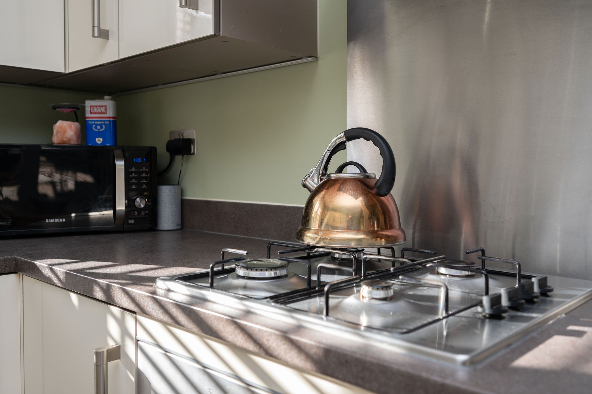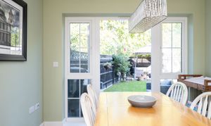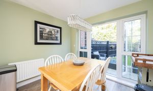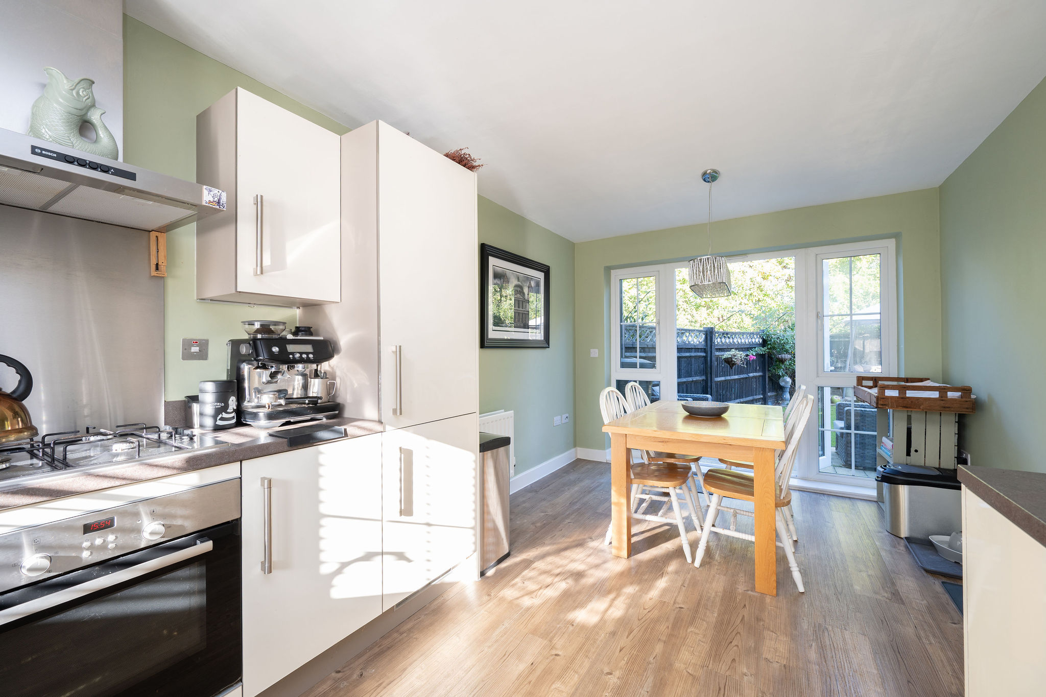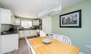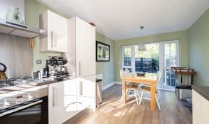 The kitchen/dining room is a sociable space designed with both practicality and style in mind, also offering direct access to the rear garden. It features a range of modern wall and base units with contrasting worktops, complemented by high-quality integrated appliances including an oven, hob, fridge/freezer, dishwasher, and washing machine.