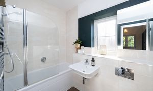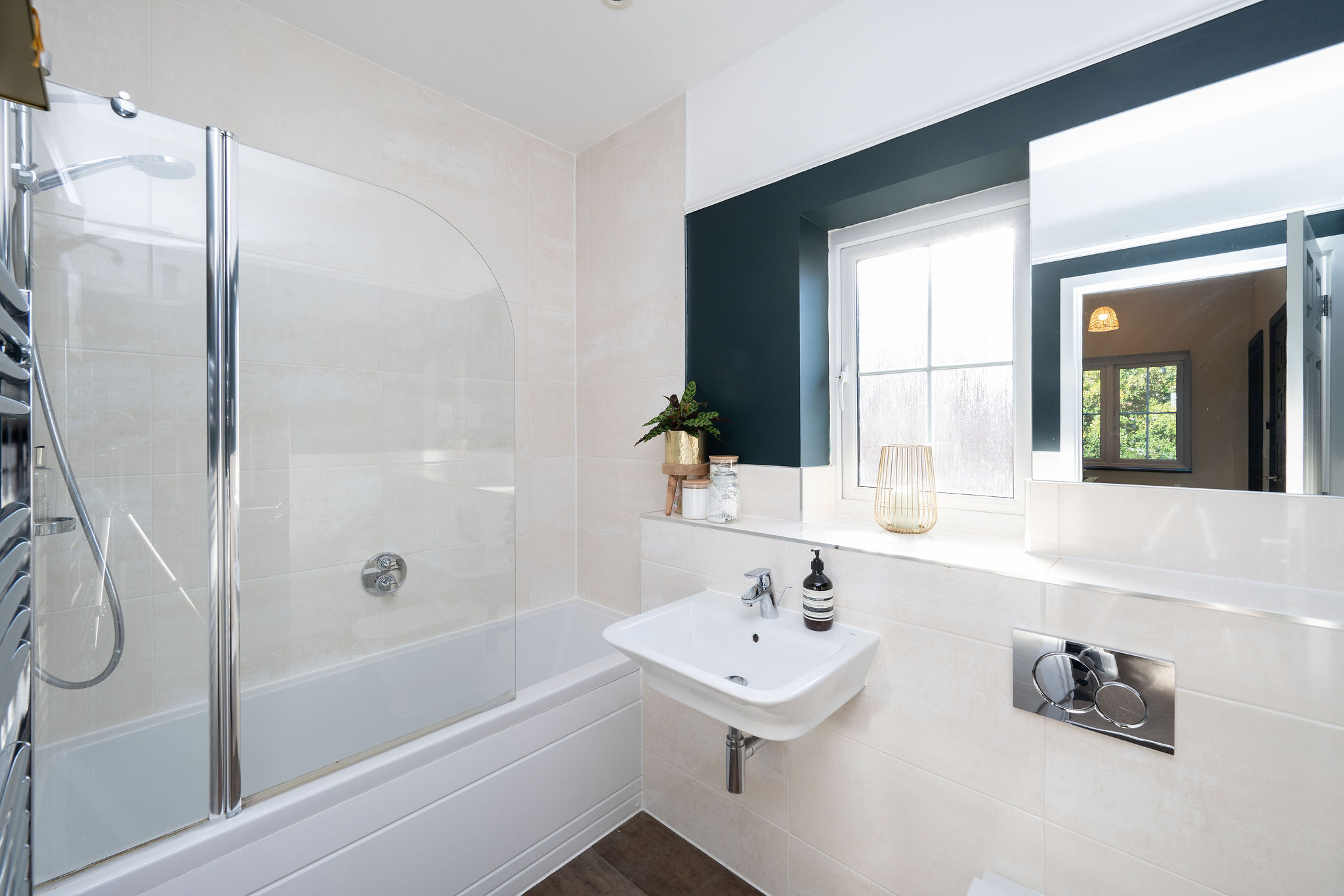 There are two further bedrooms, both served by the family bathroom, which includes a bath with wall-mounted shower, wash hand basin, and low-level WC.