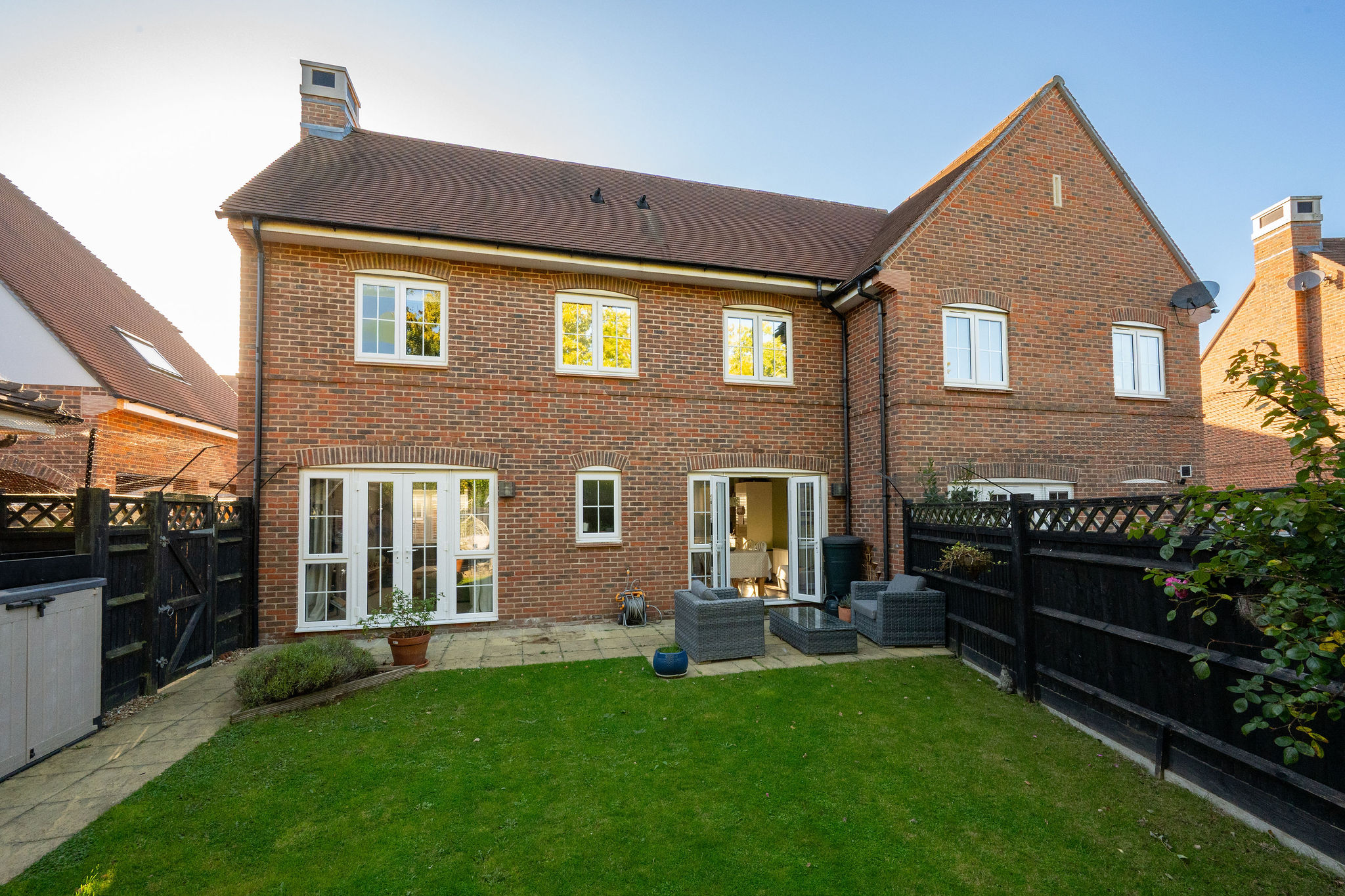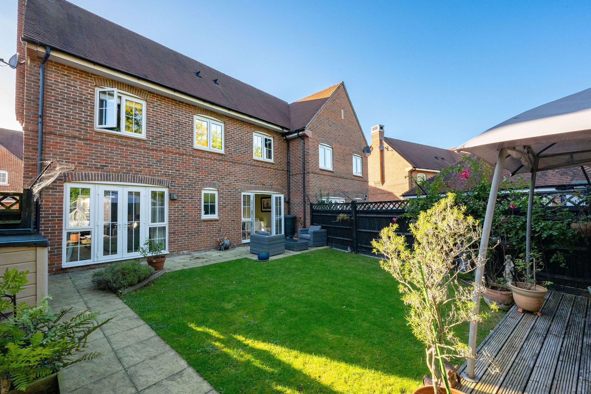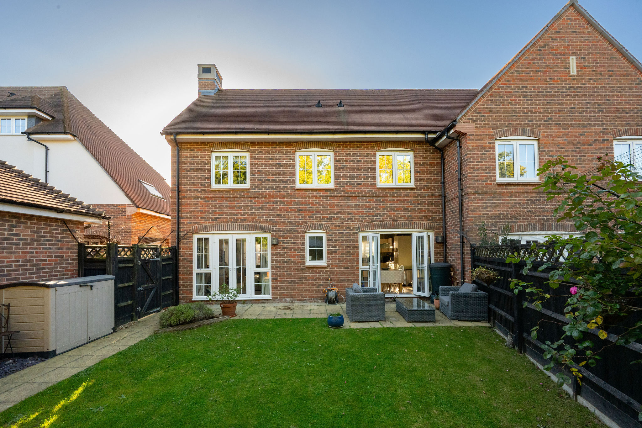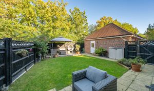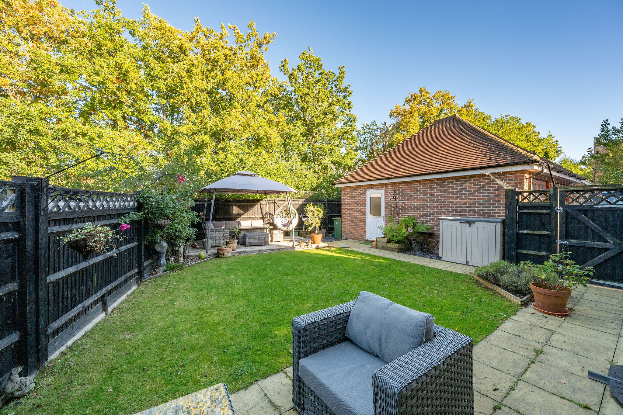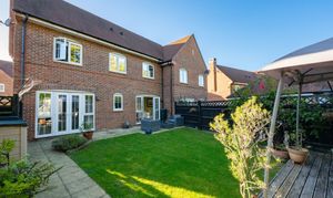 The rear garden is mainly laid to lawn and includes a timber decked terrace, perfect for outdoor dining and entertaining during the summer months. There is also a paved patio area, along with well-stocked shrub borders and a side gate providing direct access to the driveway.
