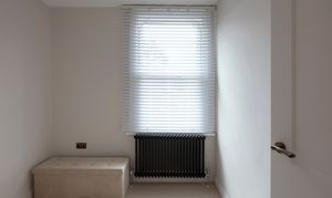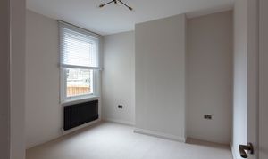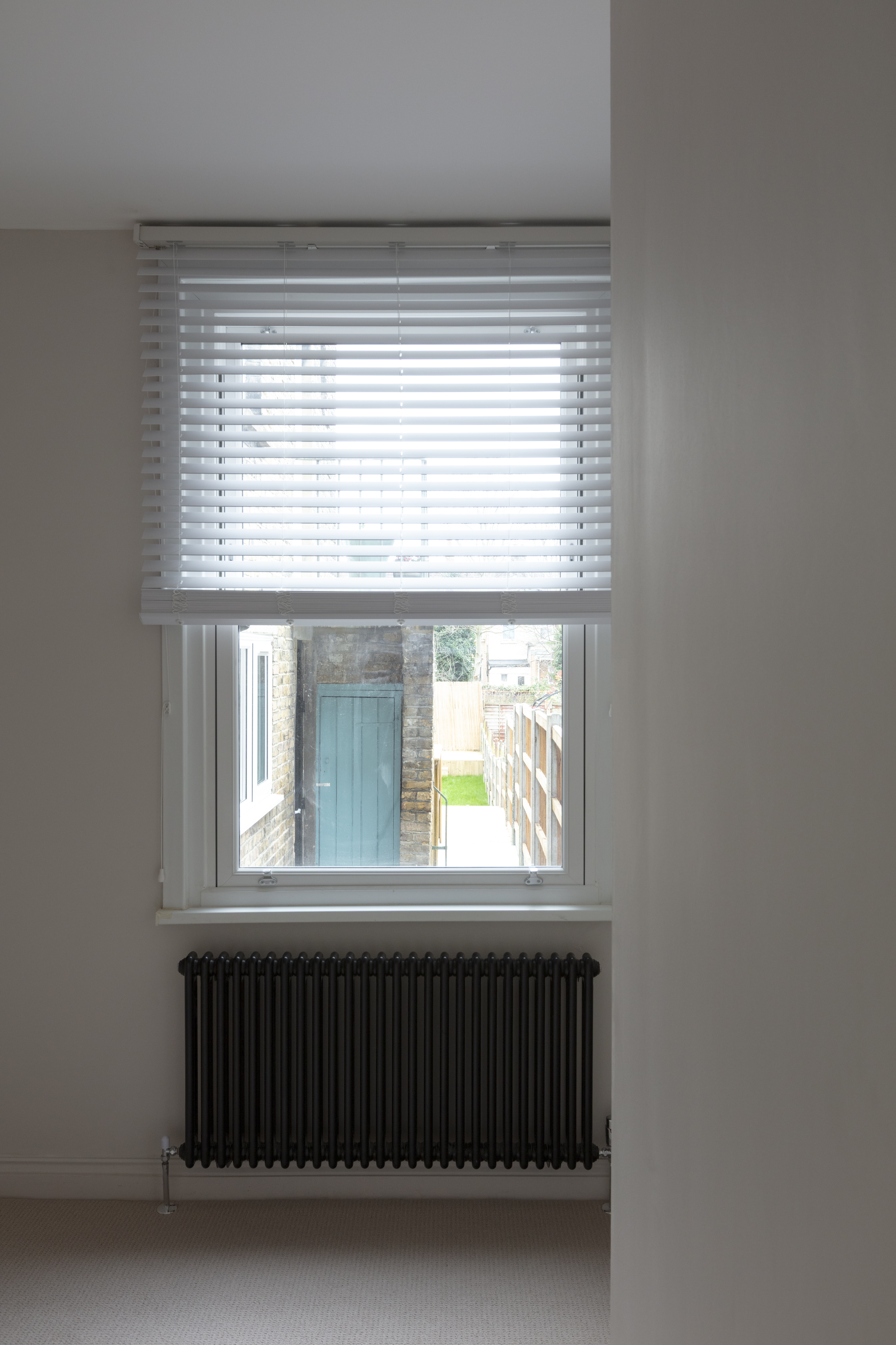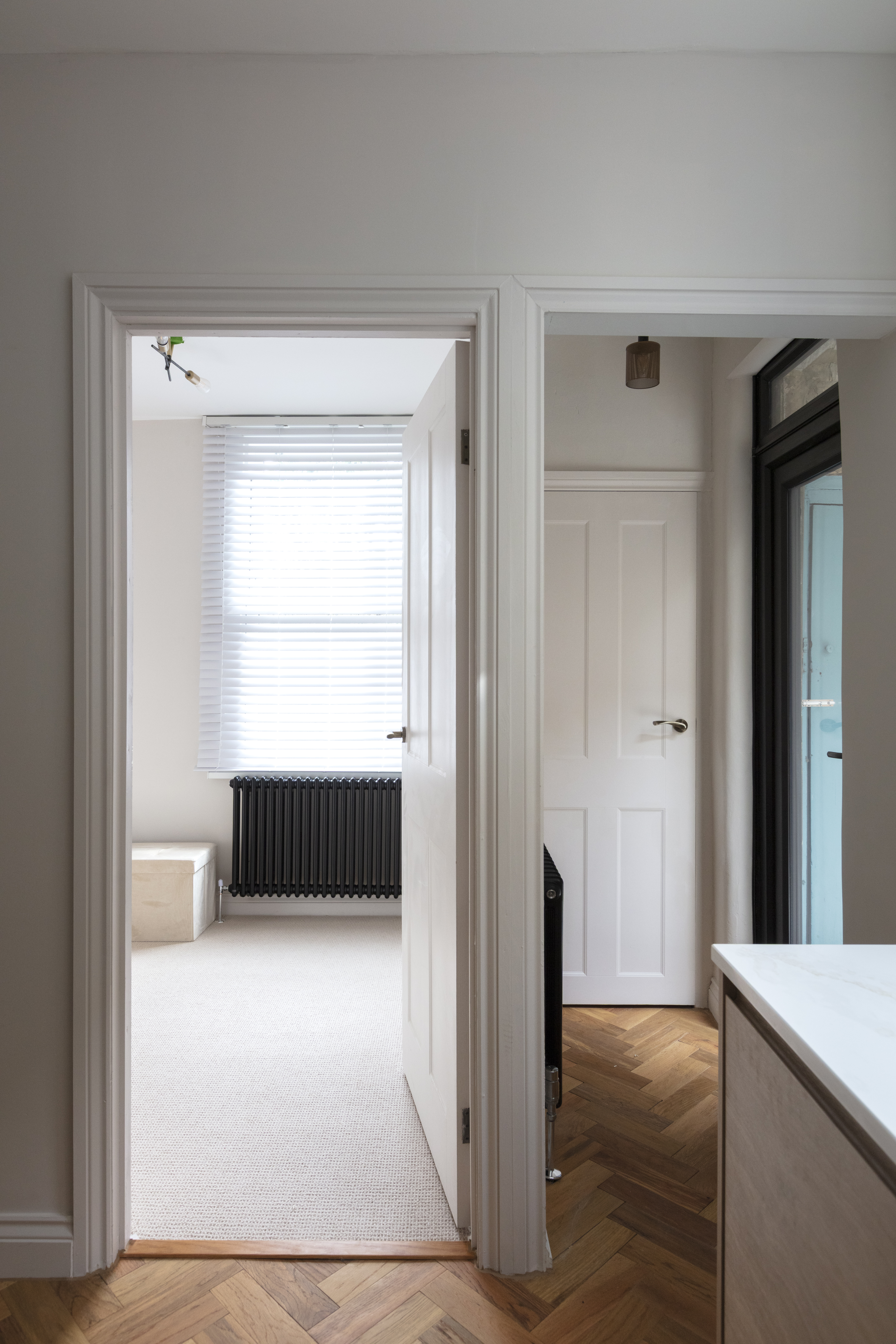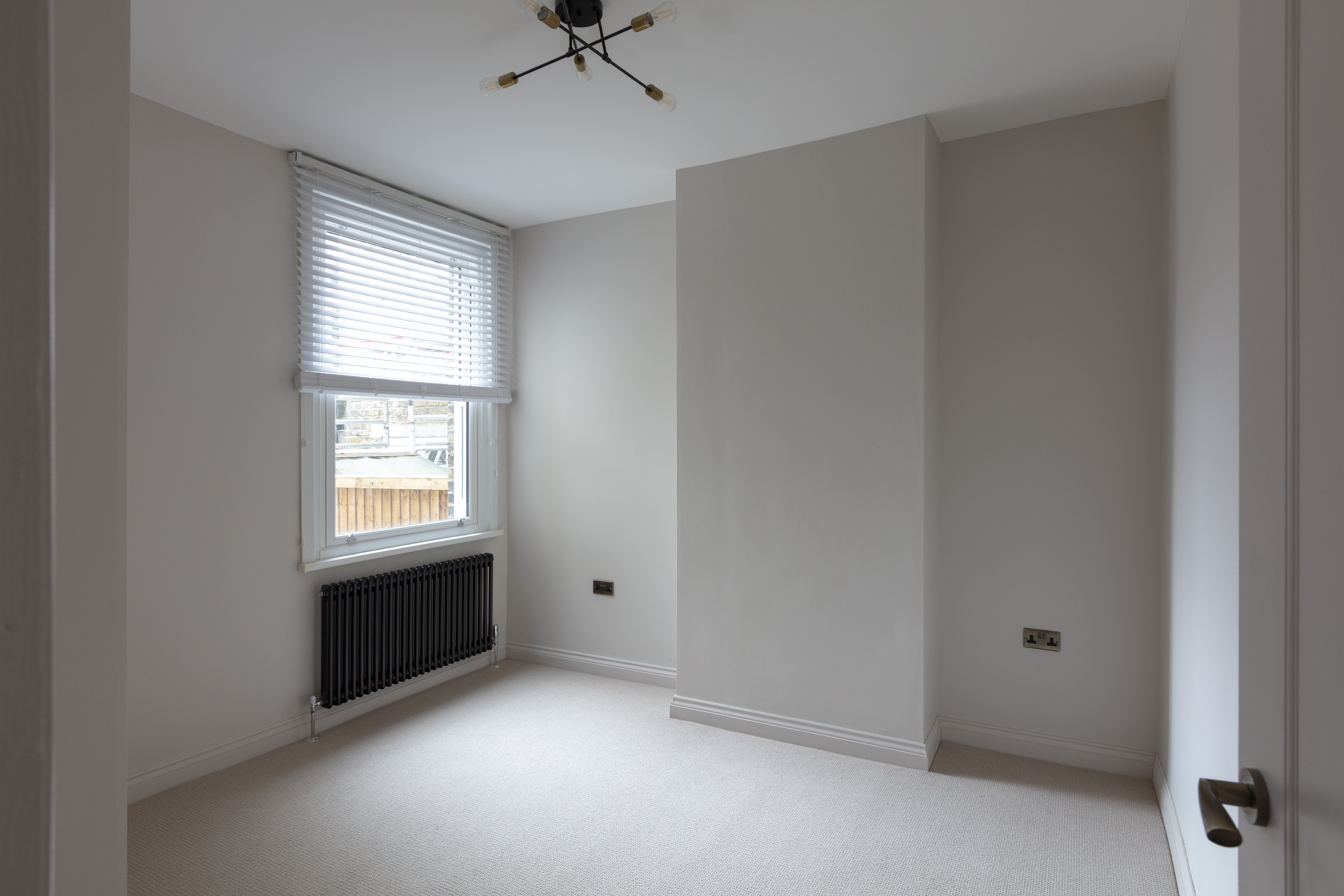 Beyond, you’ll find the primary bedroom overlooking the side return courtyard – a quiet, calm and relaxing space with pale nutmeg painted walls and new neutral-toned carpet. A tall sash with white Venetian blinds makes the most of the morning sun, while there’s also a column-style radiator, a light to match the living room, and plenty of space for storage.