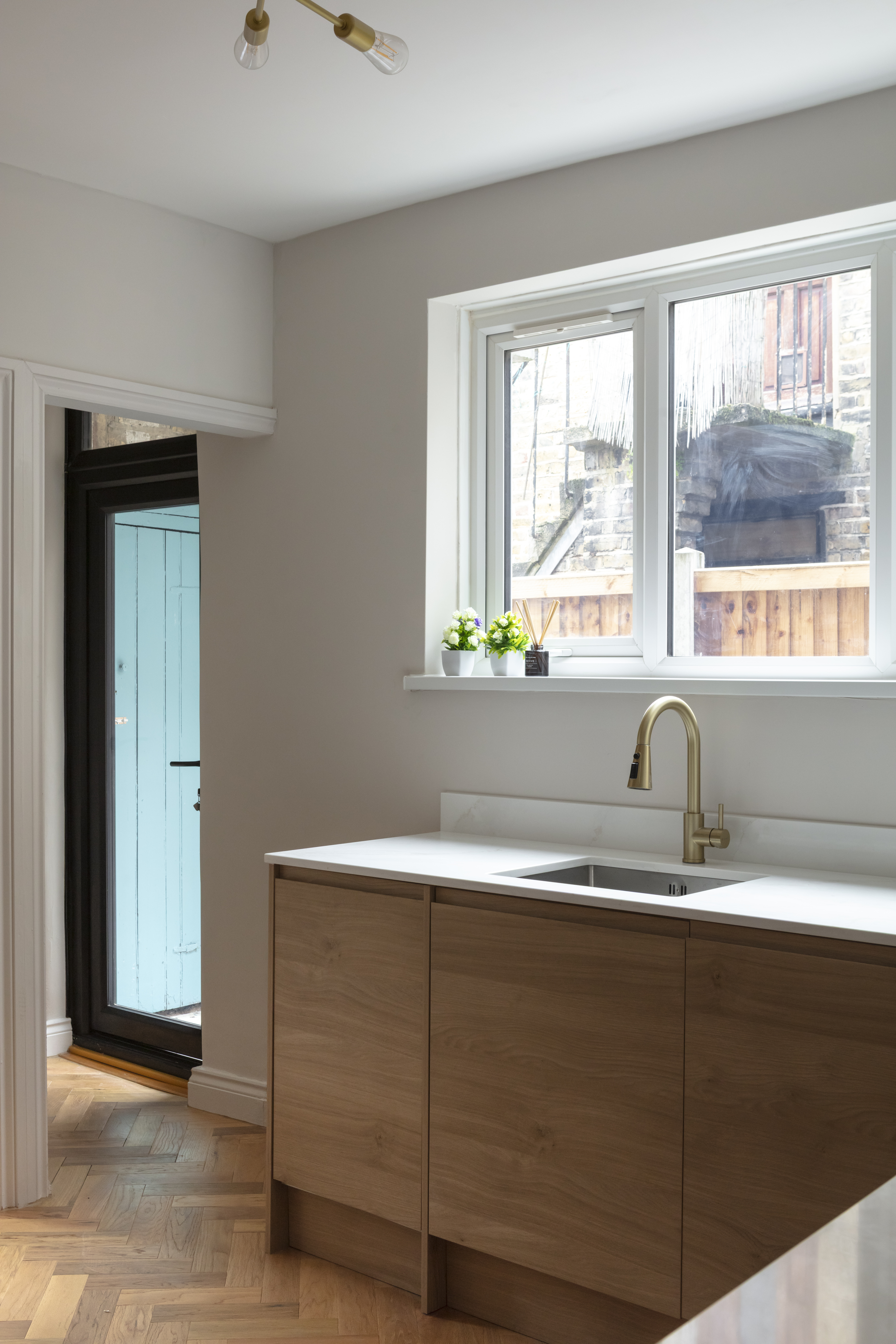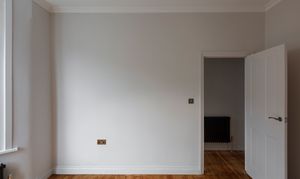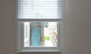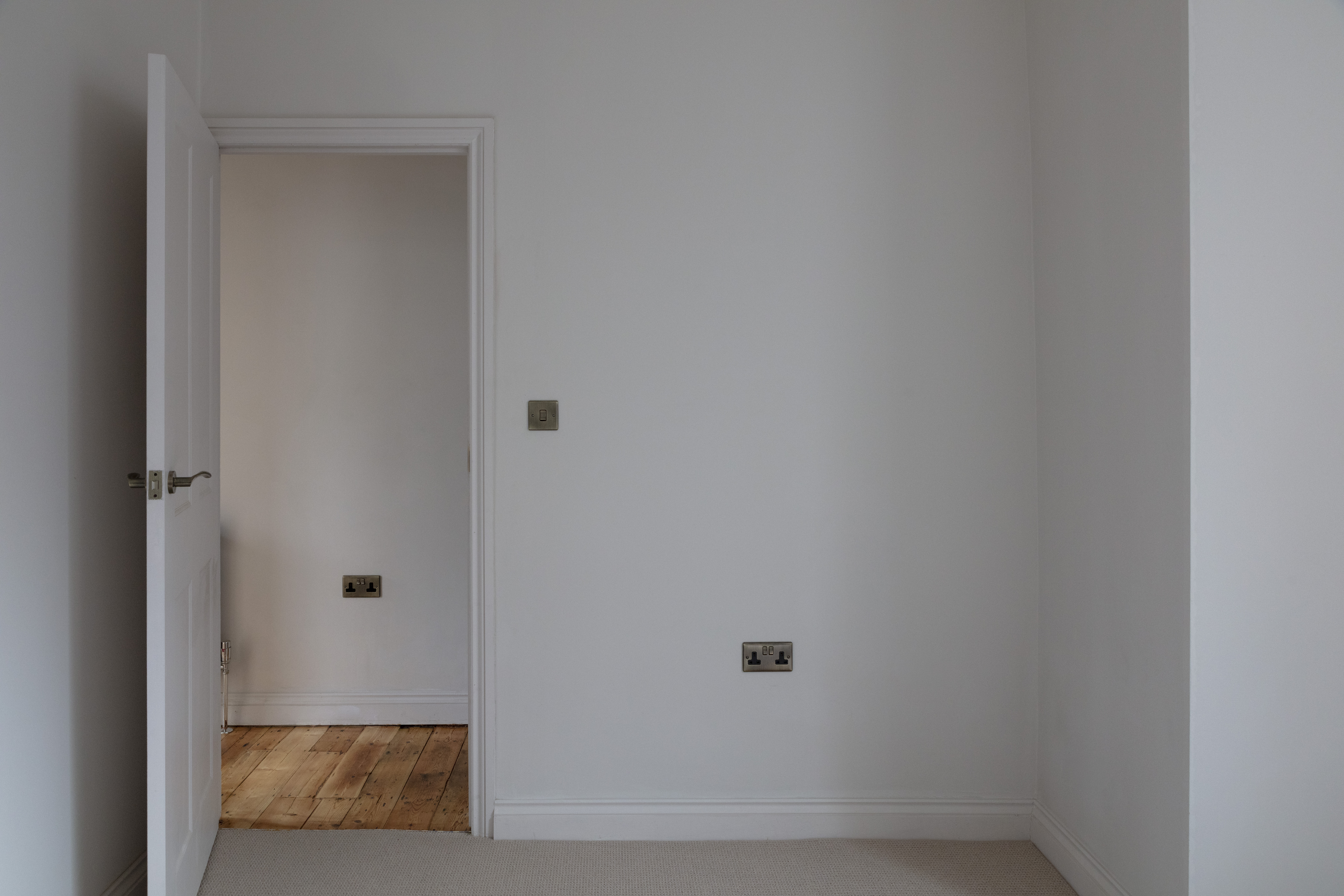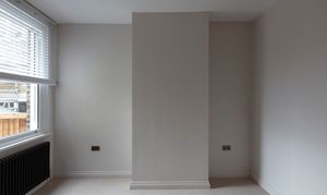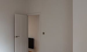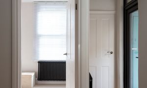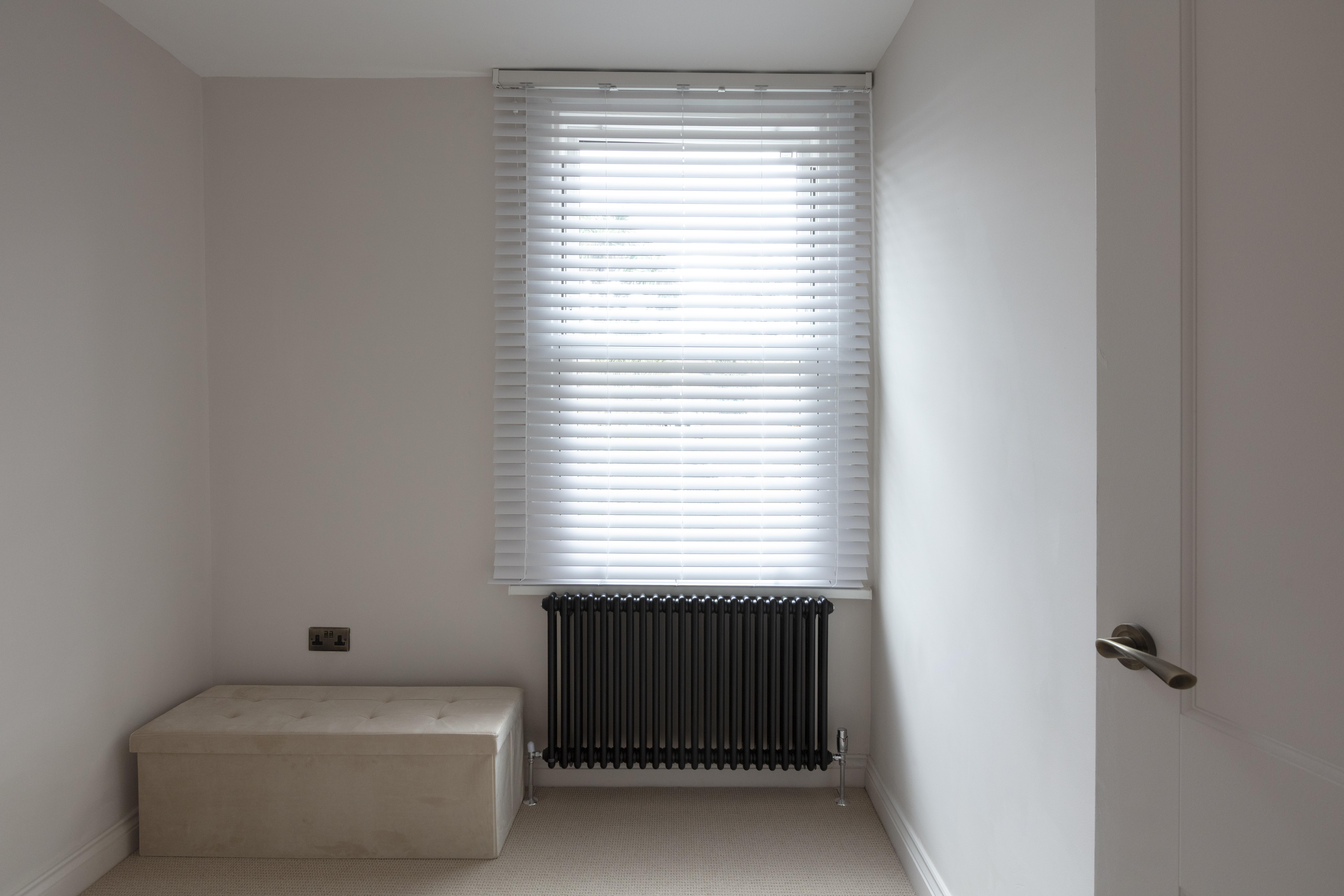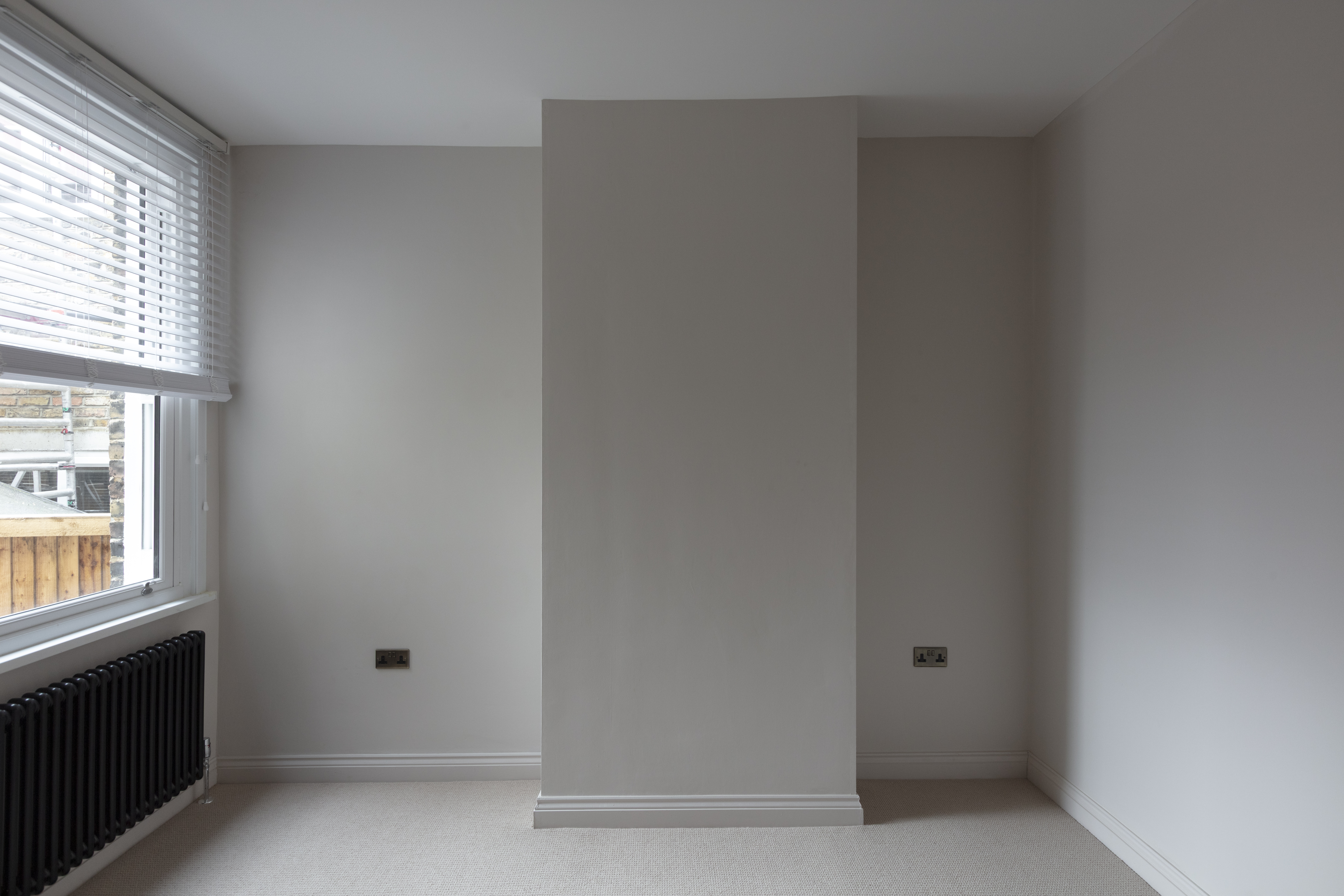 Beyond, you’ll find the primary bedroom overlooking the side return courtyard – a quiet, calm and relaxing space with pale nutmeg painted walls and new neutral-toned carpet. A tall sash with white Venetian blinds makes the most of the morning sun, while there’s also a column-style radiator, a light to match the living room, and plenty of space for storage.