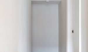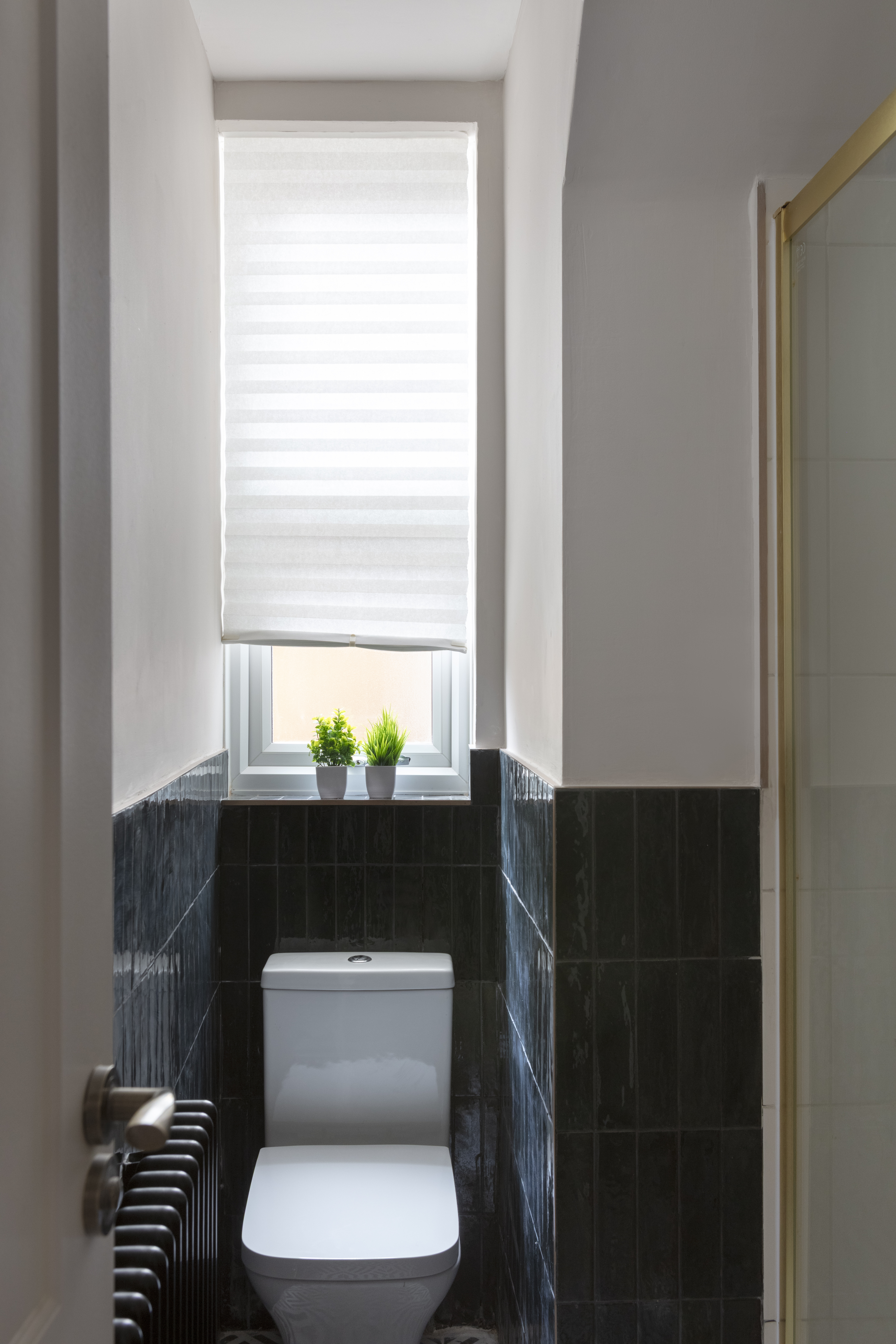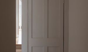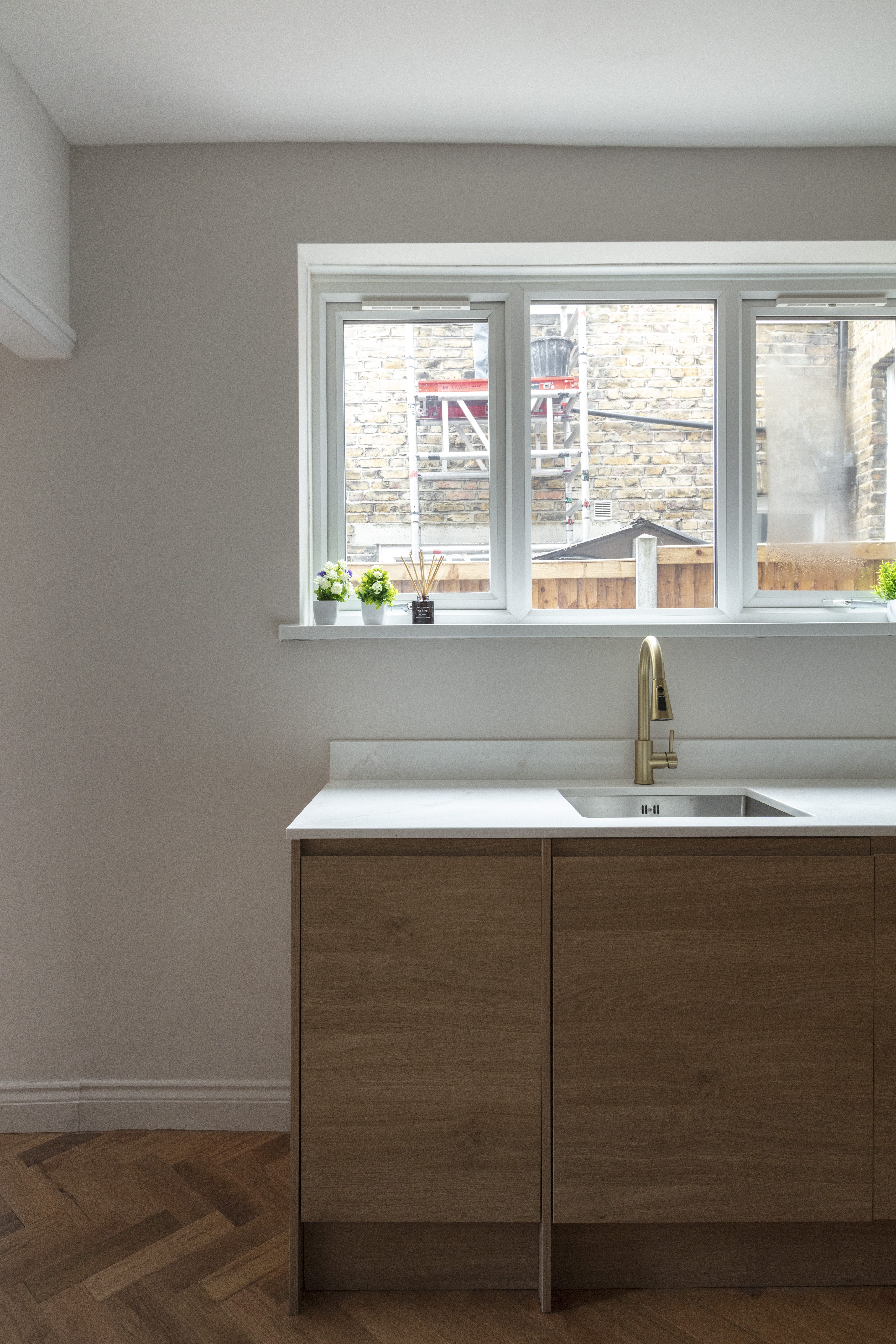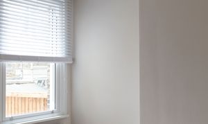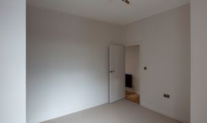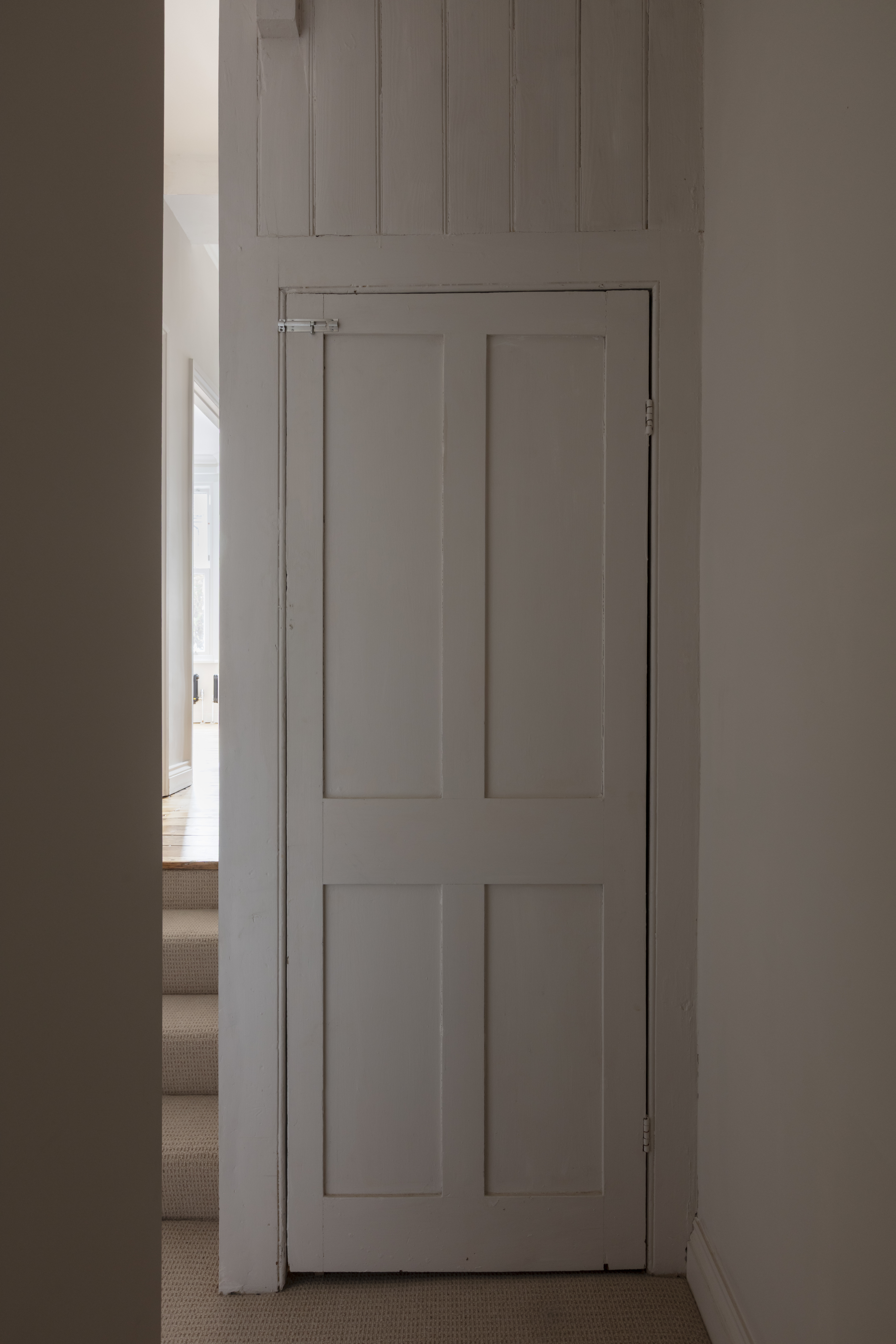 Beyond, you’ll find the primary bedroom overlooking the side return courtyard – a quiet, calm and relaxing space with pale nutmeg painted walls and new neutral-toned carpet. A tall sash with white Venetian blinds makes the most of the morning sun, while there’s also a column-style radiator, a light to match the living room, and plenty of space for storage.