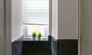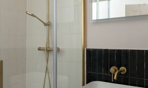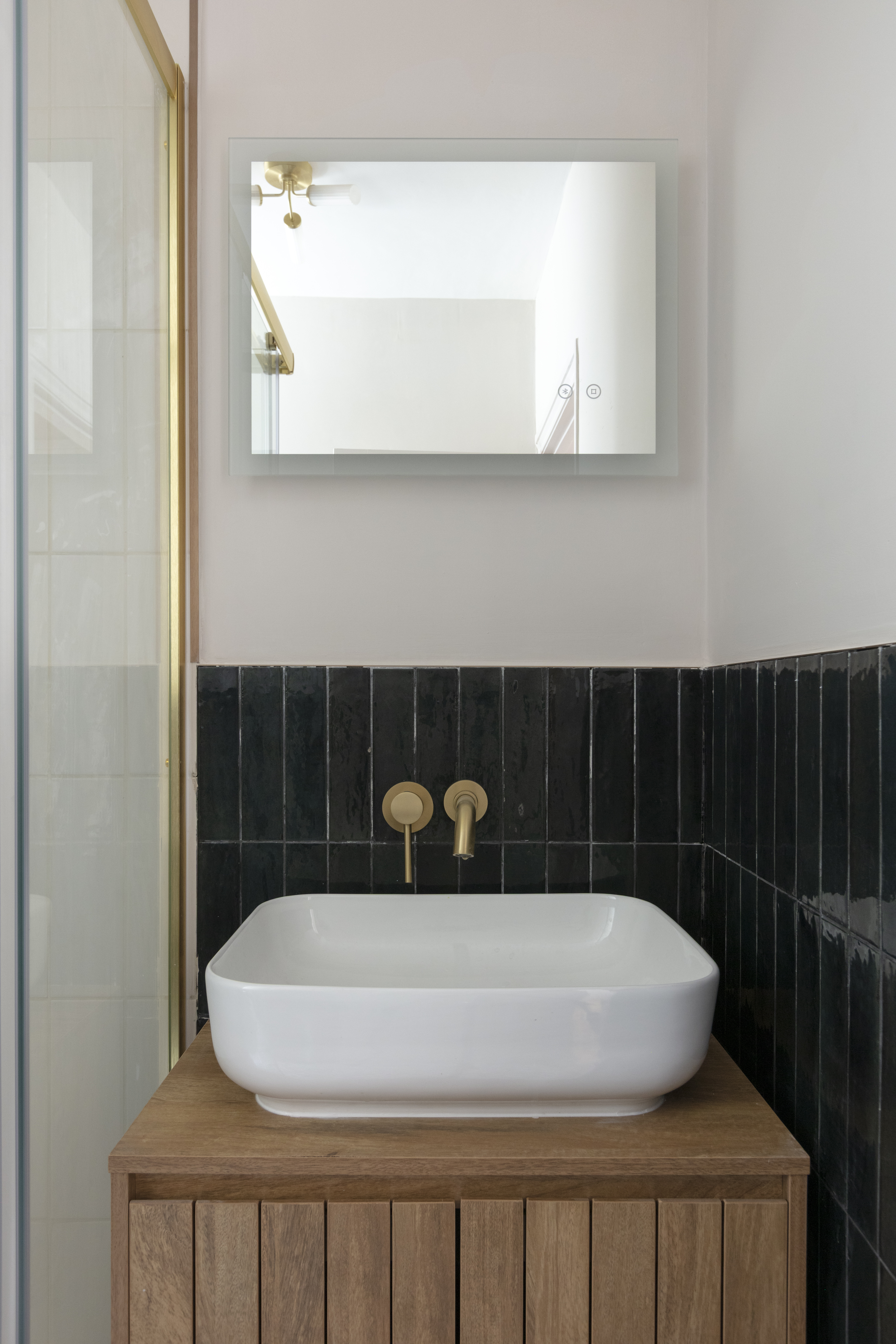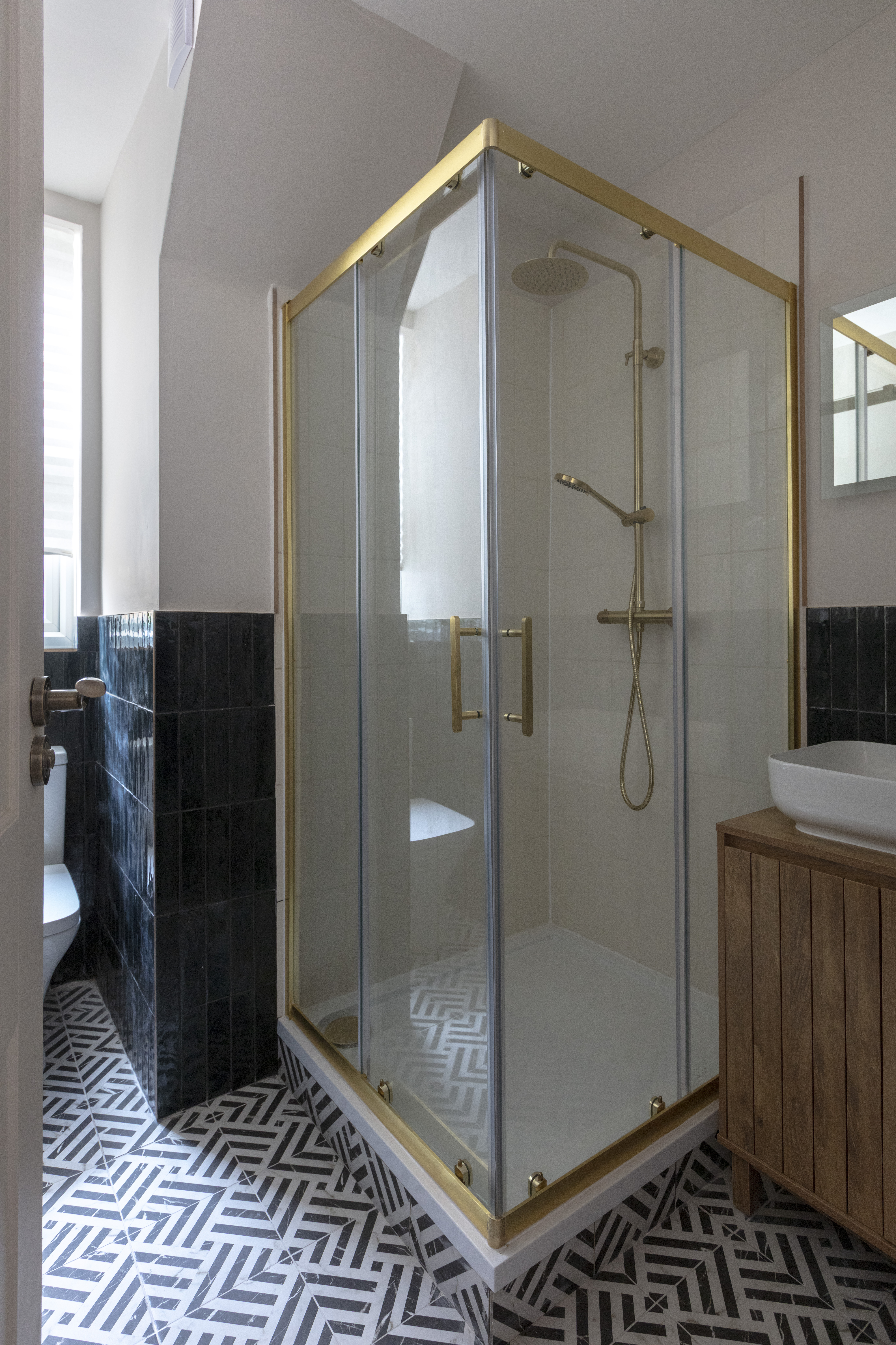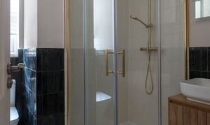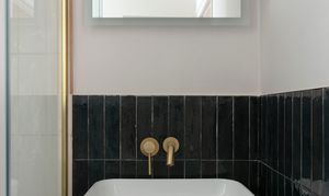 Continue along the hallway, stepping down past a useful coat and storage cupboard, to reach the bathroom. The elegant scheme pairs elongated white and black Zellica porcelain tiles to the walls with ‘Gatzby’ patterned floor tiles, all lit by a tall frosted casement window. There’s a rainfall shower with brushed brass-framed enclosure, as well as a wall-hung wooden vanity with countertop sink and brass wall-mounted tap; a close-coupled loo, and a black column-style radiator. For an additional luxe touch, the Smart LED mirror above the basin includes both de-misting and Bluetooth functions.