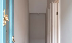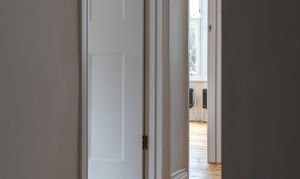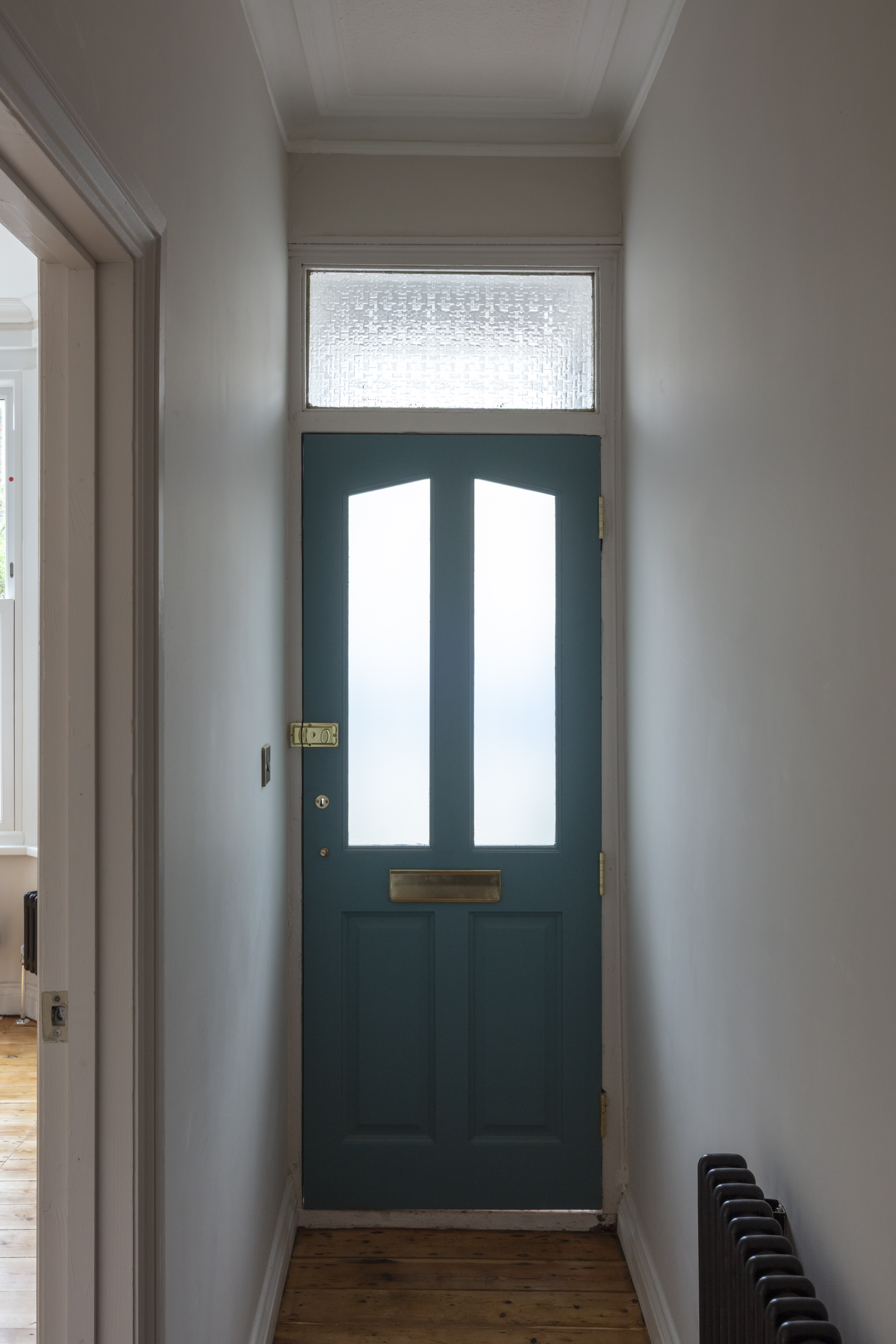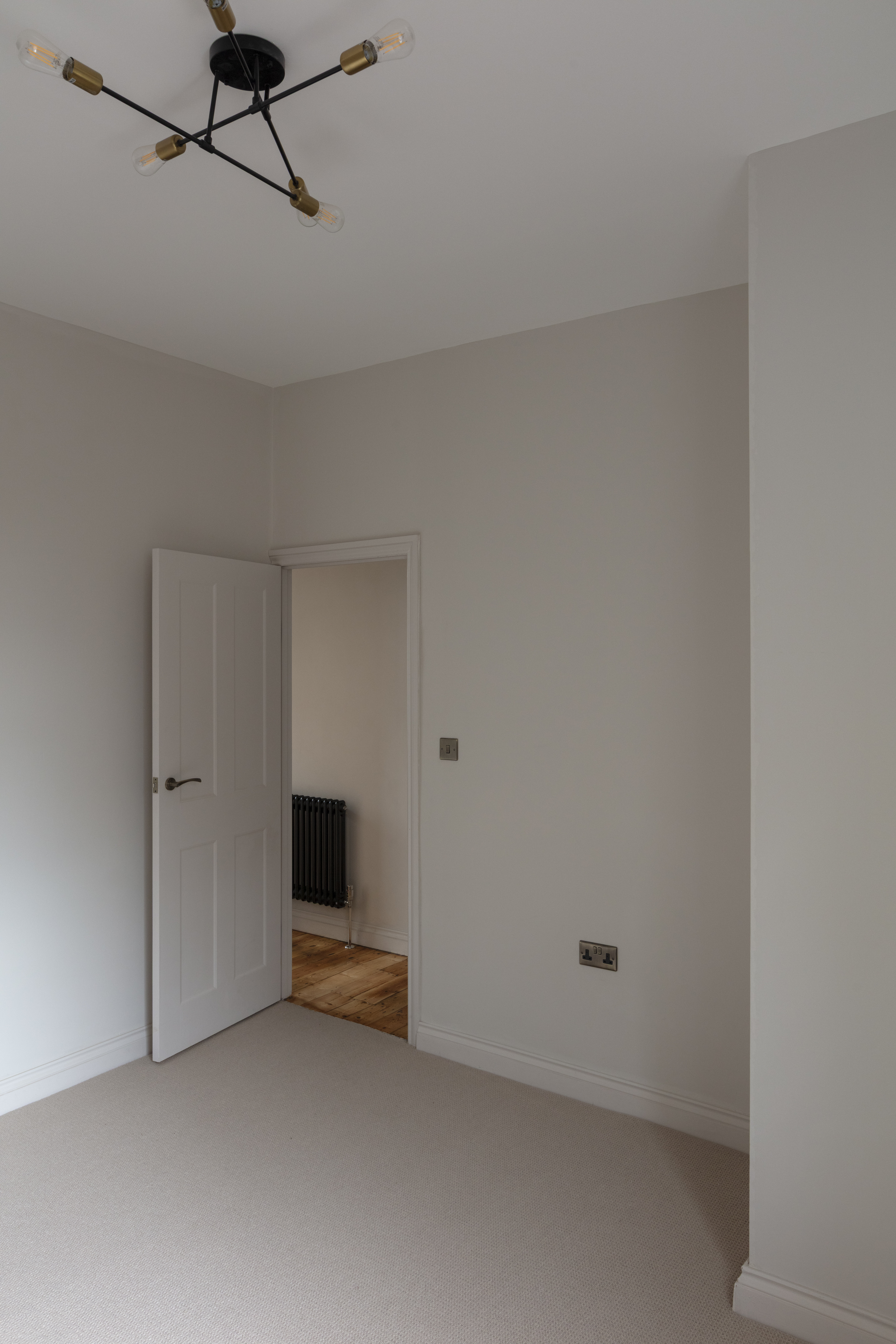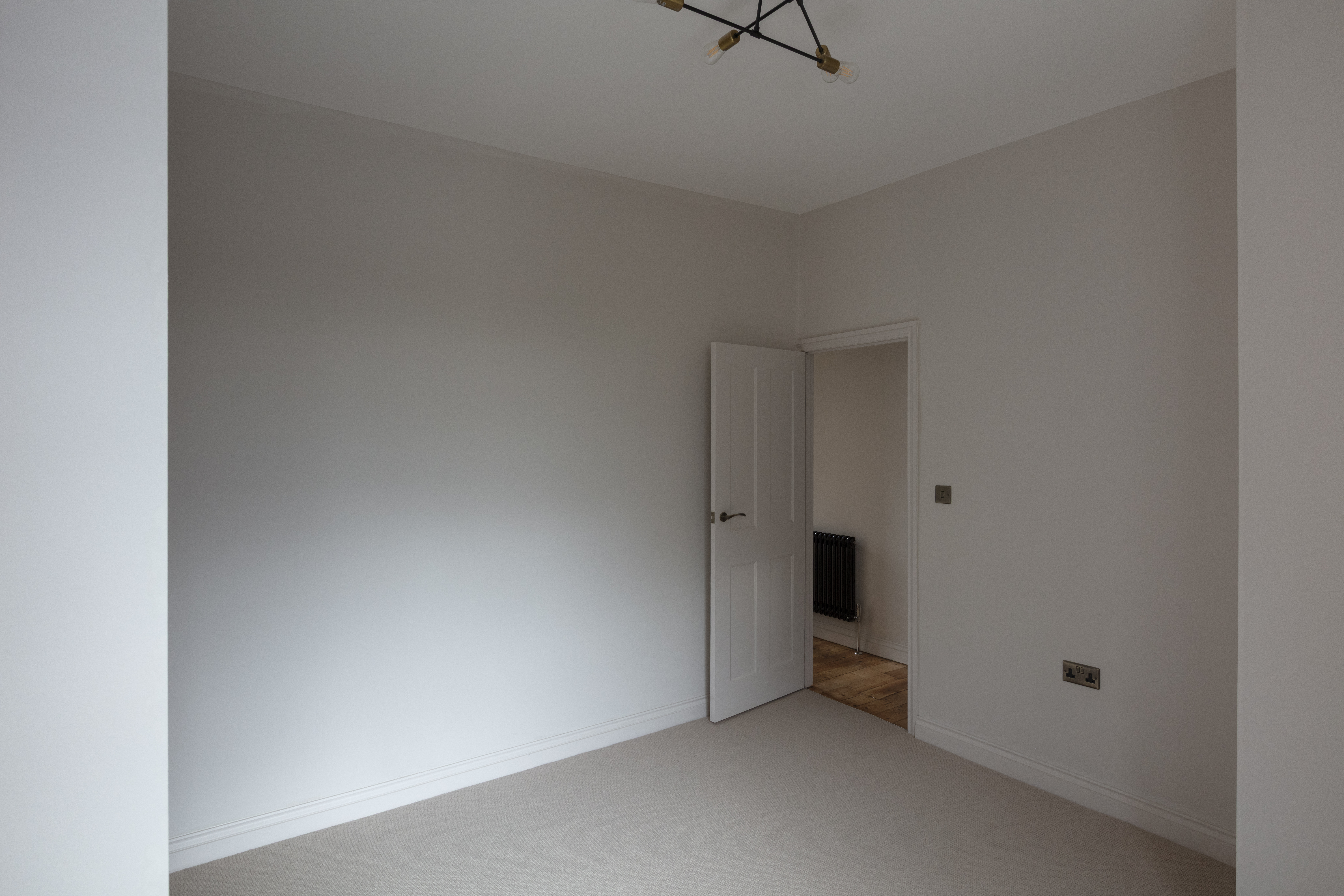 Step through into the hallway where the newly painted off-white walls are warmed by beautiful sanded and restored original floorboards. There’s a modern triple-flush light fitting, and a new black column-style radiator – a lovely detail seen throughout the property.