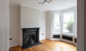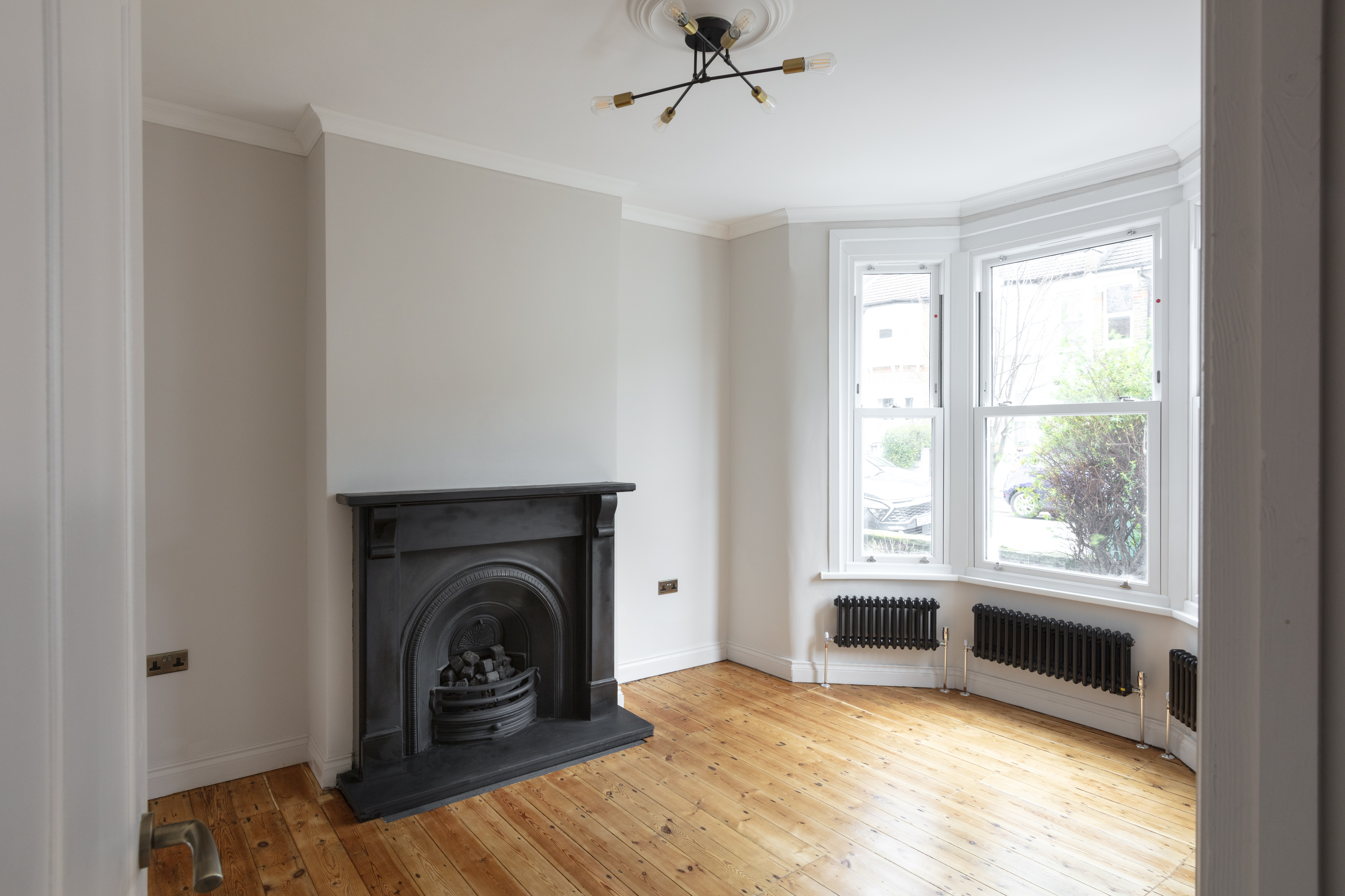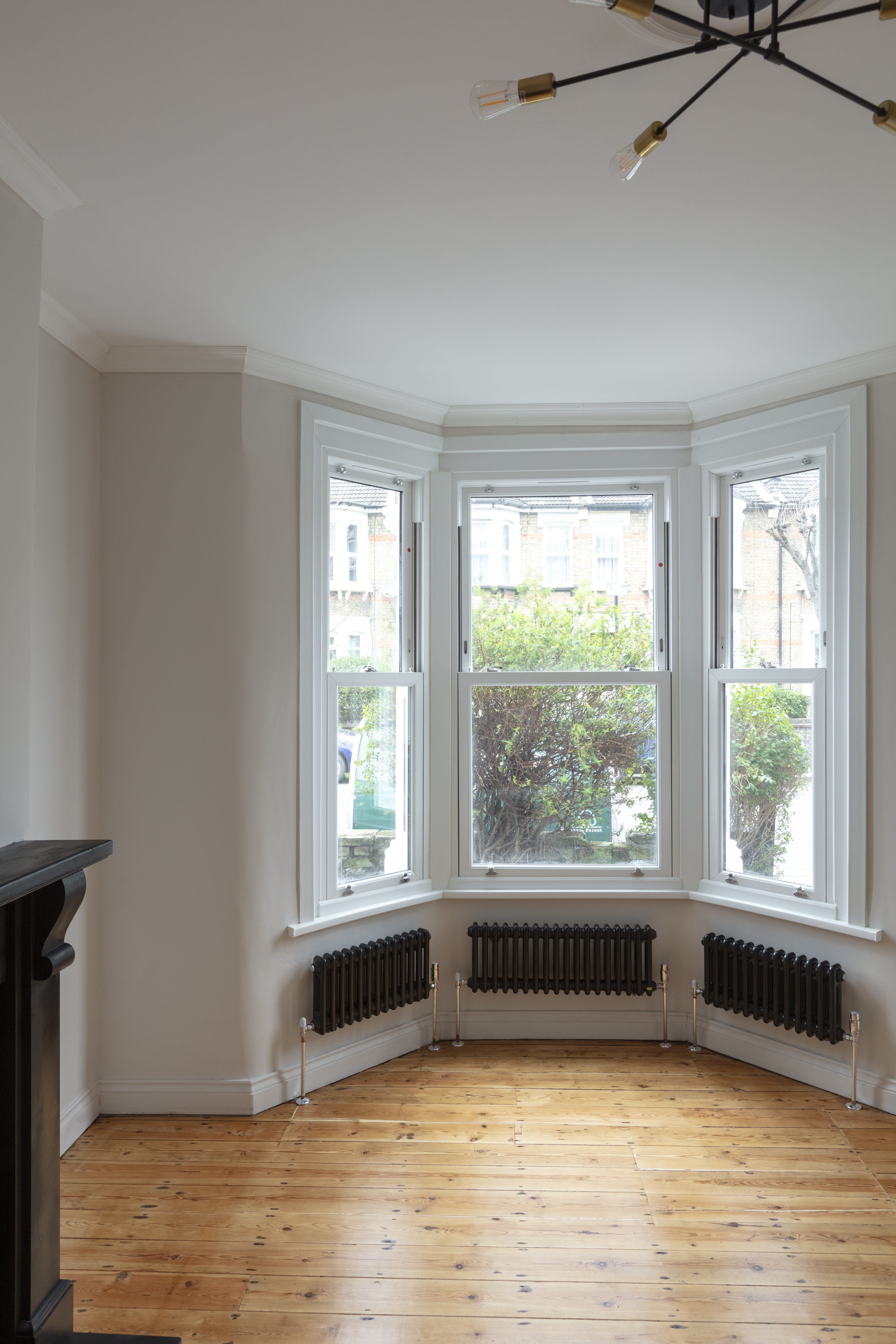 To your right, a new four-panelled door with antique brass handle opens to the living room, where the sanded floorboards continue. Bathed in light from a tall bay with UPVC sash windows, the focal point of the room is a restored fireplace with black stone surround and hearth. A trio of black column-style radiators add further cosiness in the bay, while the coved ceiling features a modern multi-arm chandelier.