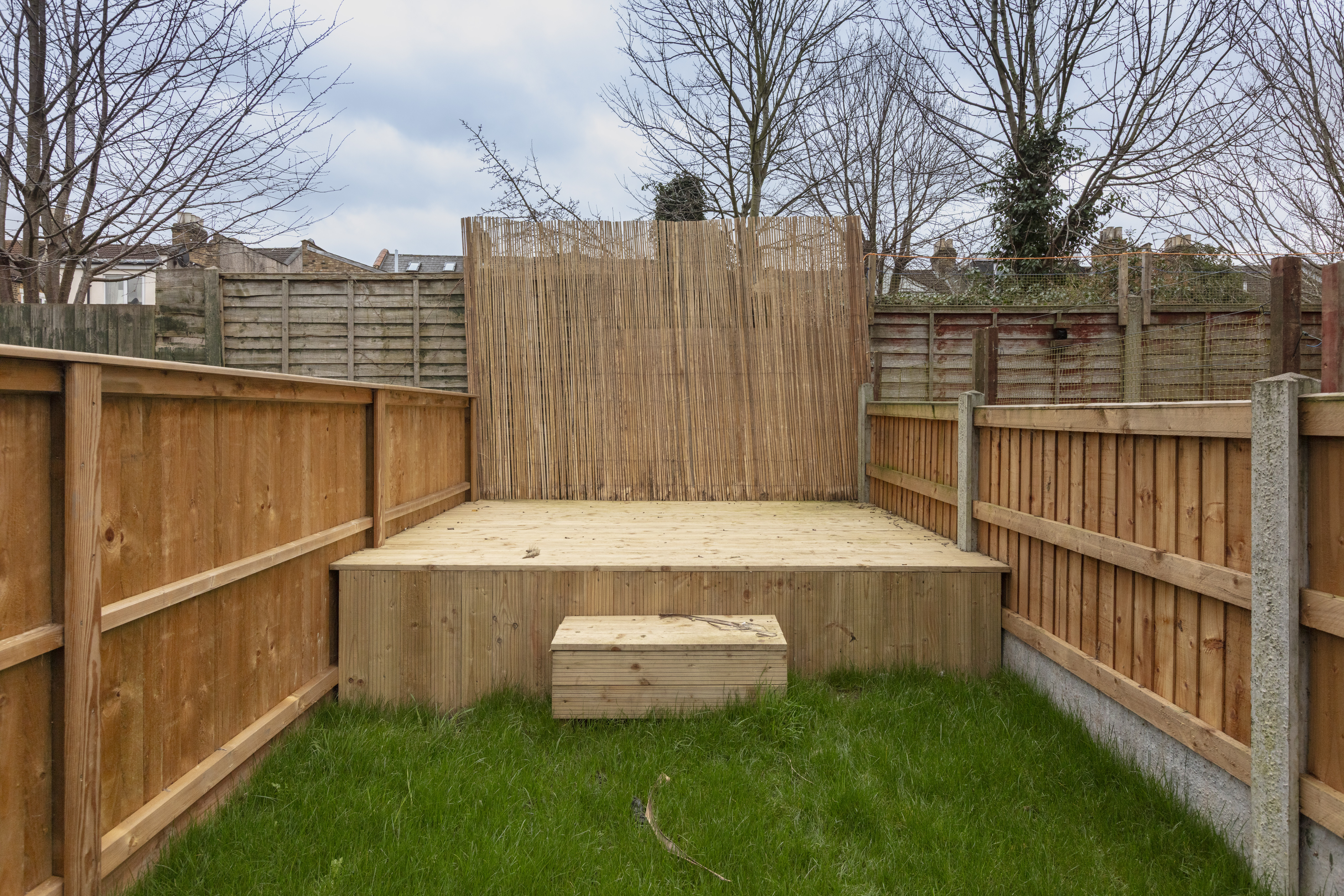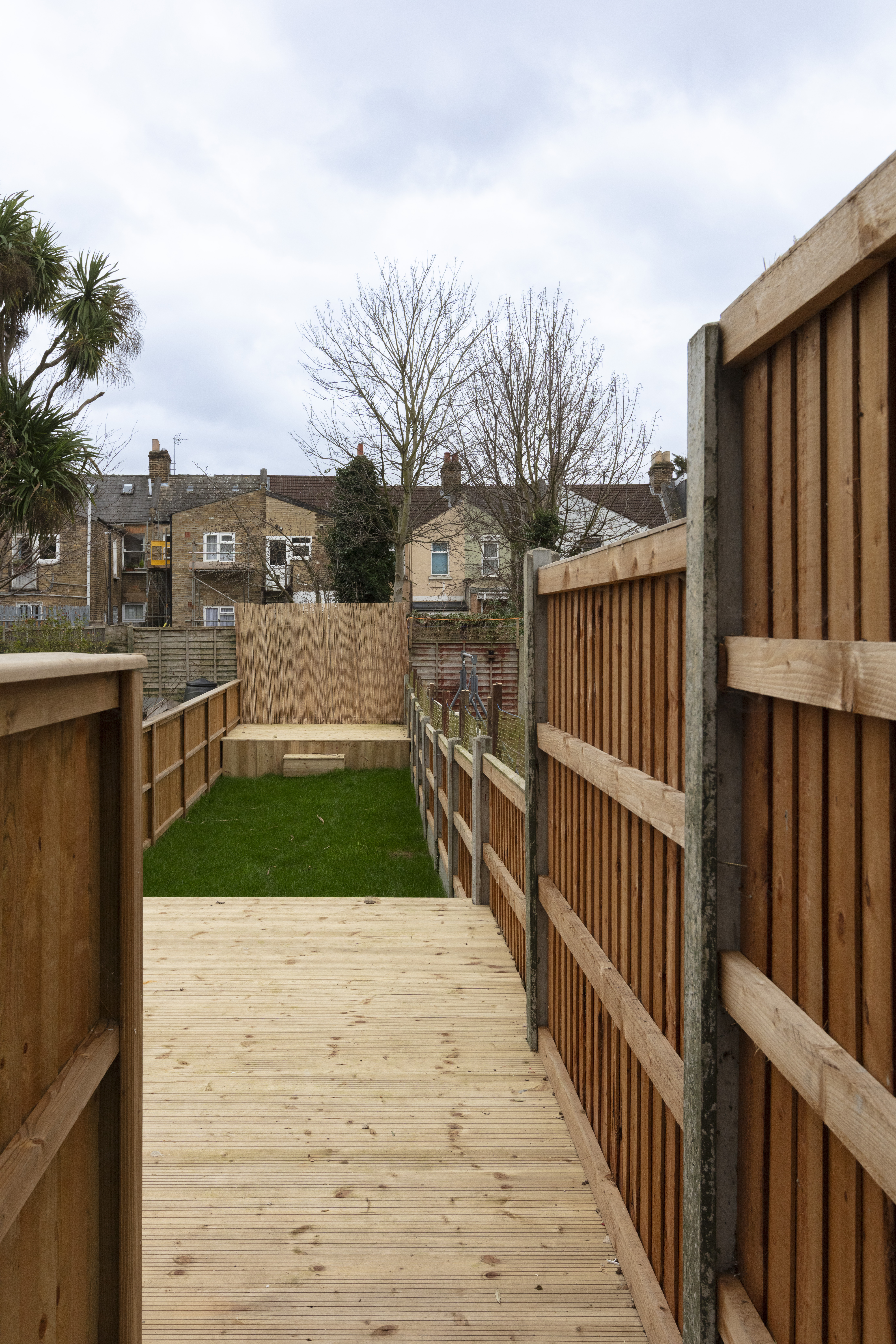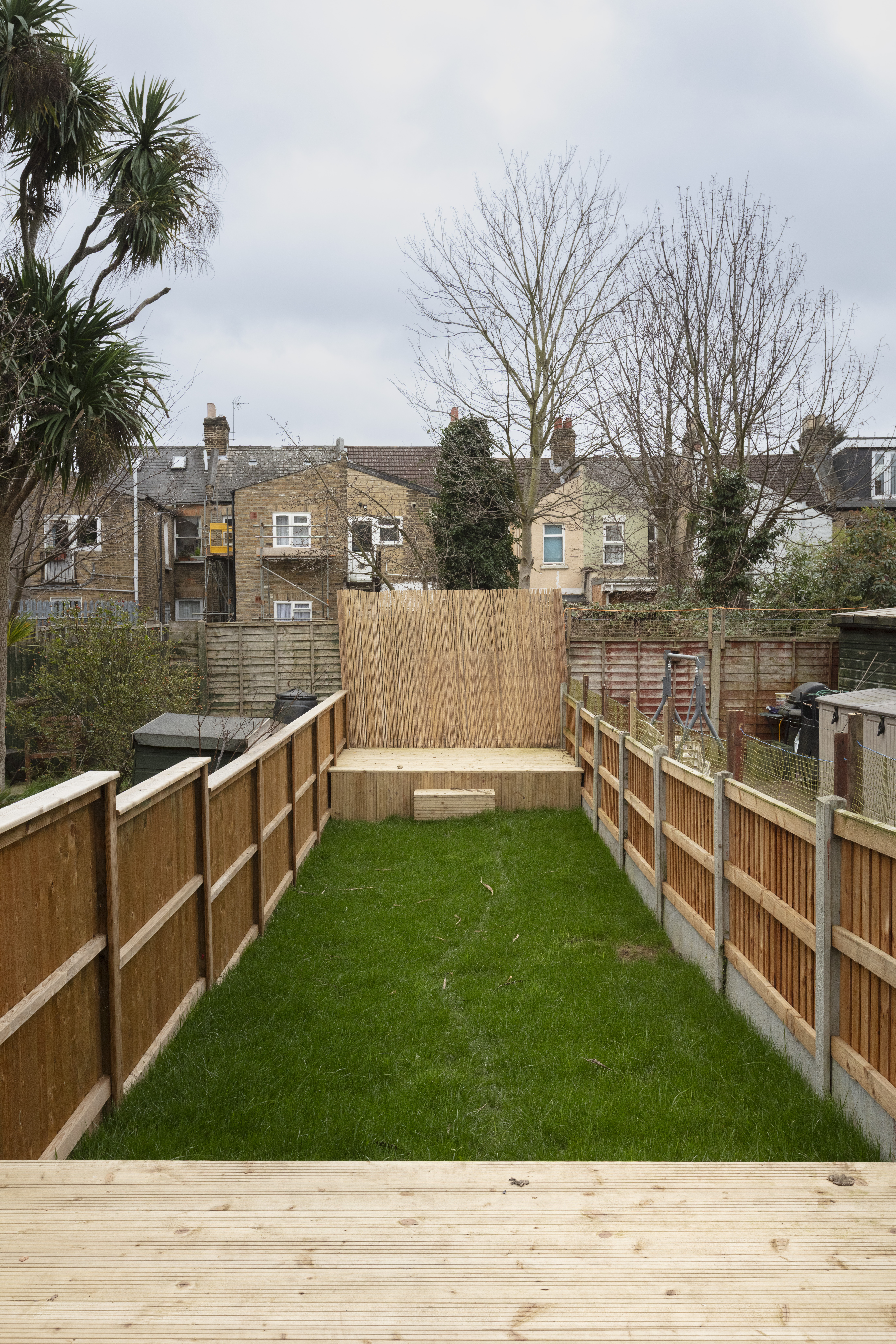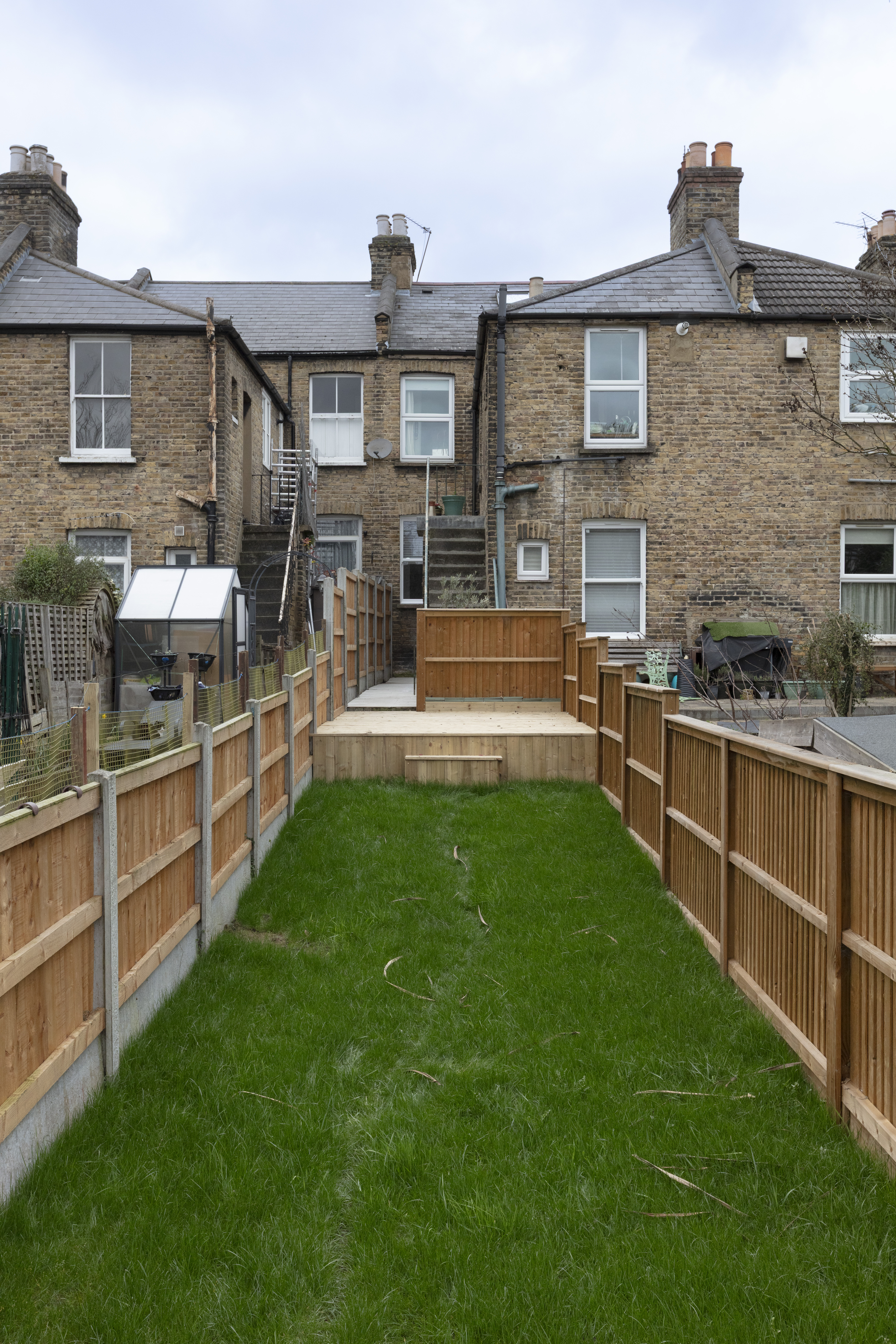 From the porcelain-tiled side return, walk past a useful brick storage shed (with teal-painted door to match the front of the house) to reach a raised sun deck, perfect for entertaining. Then, step down to a lush, newly laid grassy lawn; before arriving at a second raised decked area to the rear.