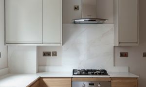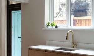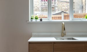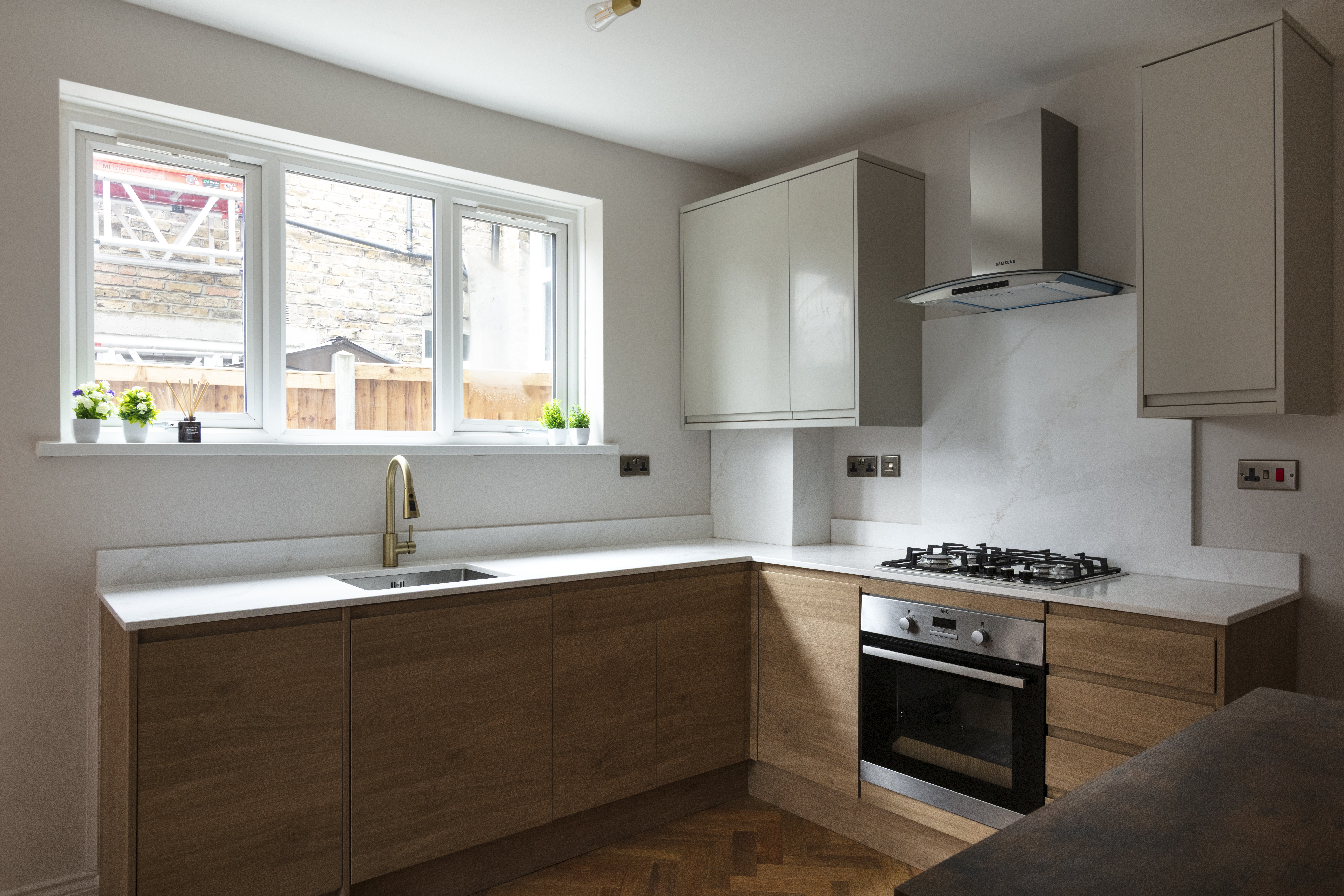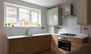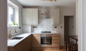 The dining kitchen (fitted in January this year) lies towards the rear. Lit by both a side-facing window and a glazed door to the garden, the two-toned scheme combines handleless cashmere wall cabinets with oak-look lower units, united by a veined quartz worktop and upstand.