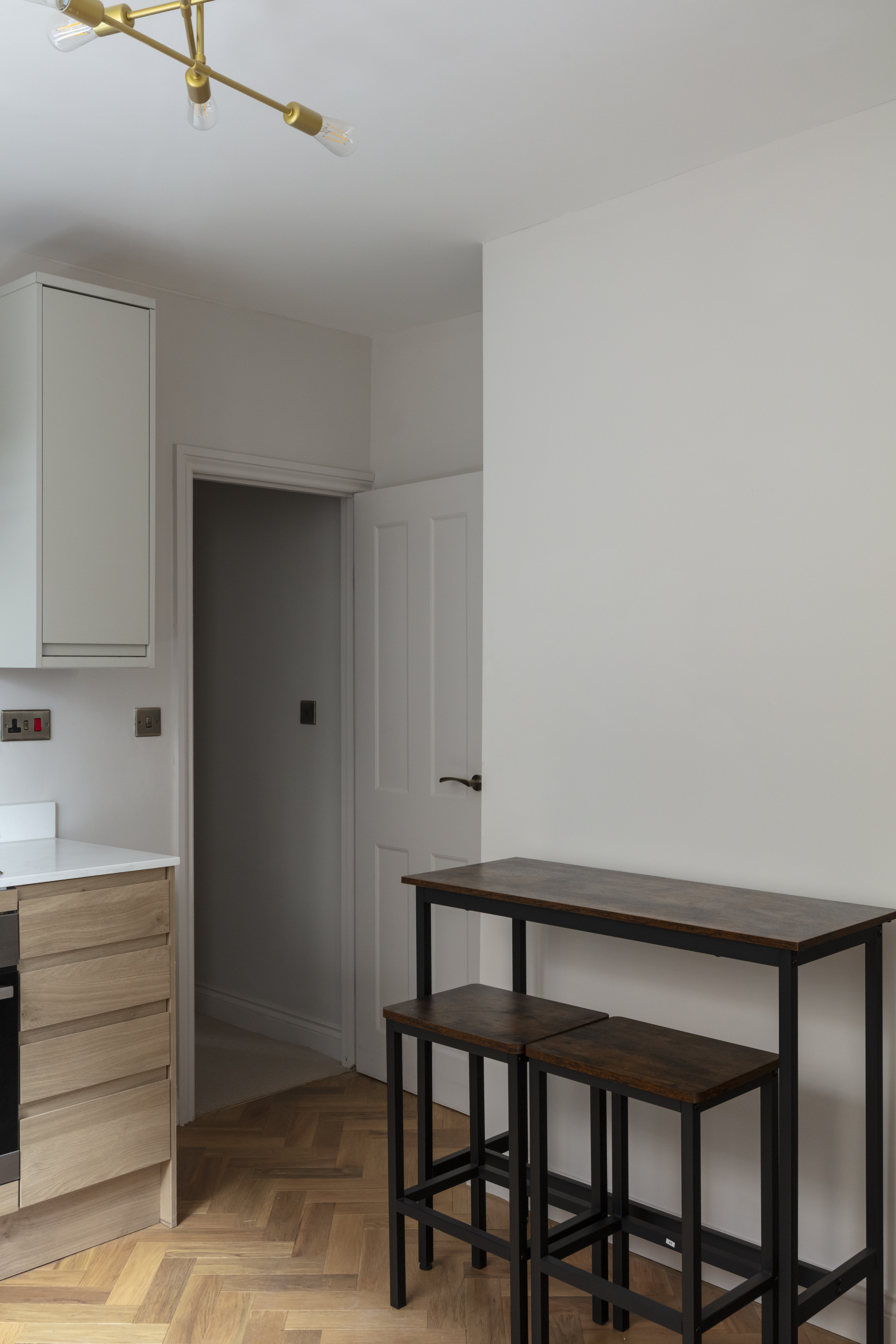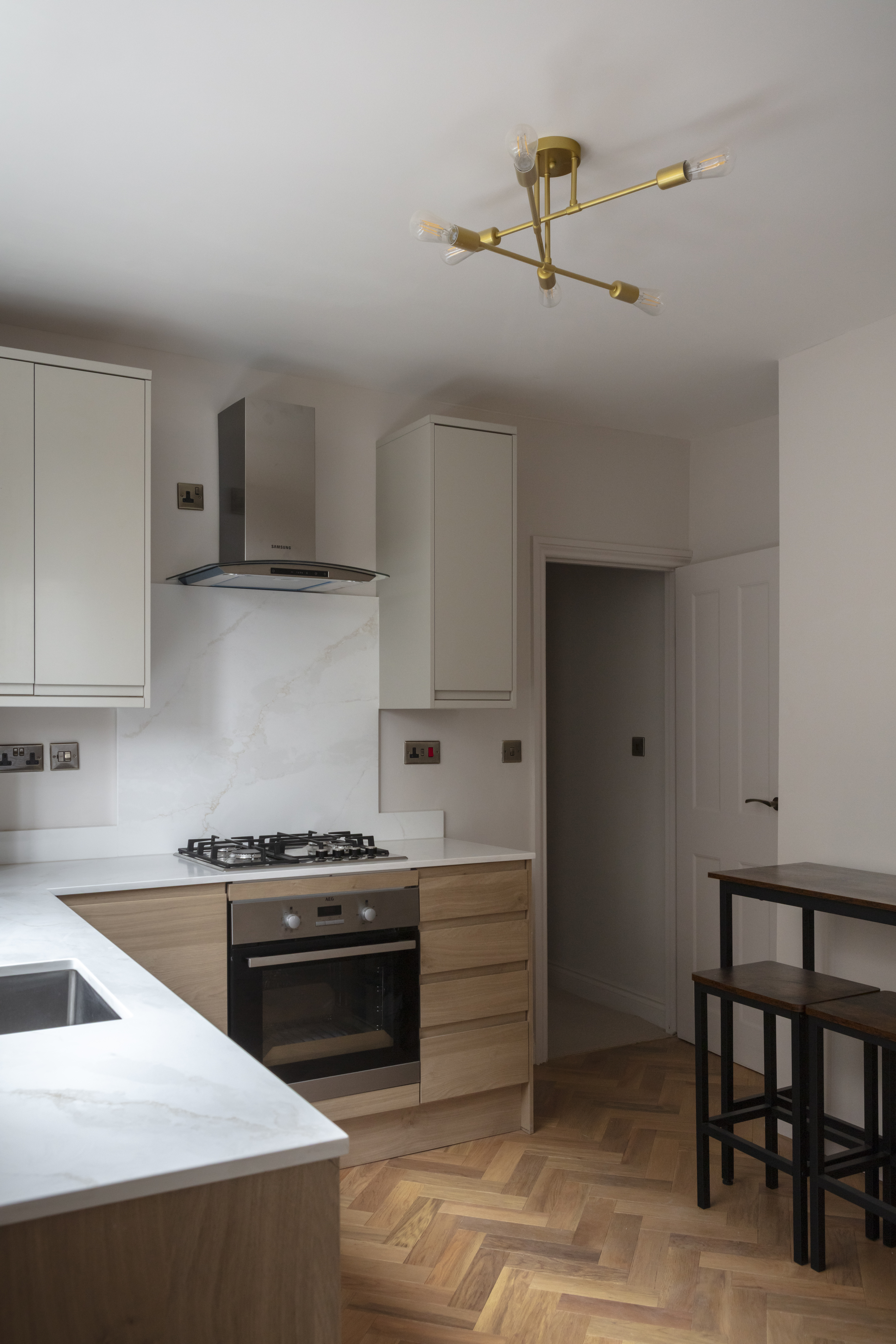 Integrated appliances include an AEG oven, four-ring gas hob and overhead stainless steel Samsung extractor, and dishwasher. There’s space for a freestanding fridge-freezer as well as a breakfast bar and stools, and the newly fitted boiler is also discreetly housed here. An undermounted sink with brass mixer tap sits beneath the window, while there’s also a black column-style radiator and brass multi-arm chandelier.