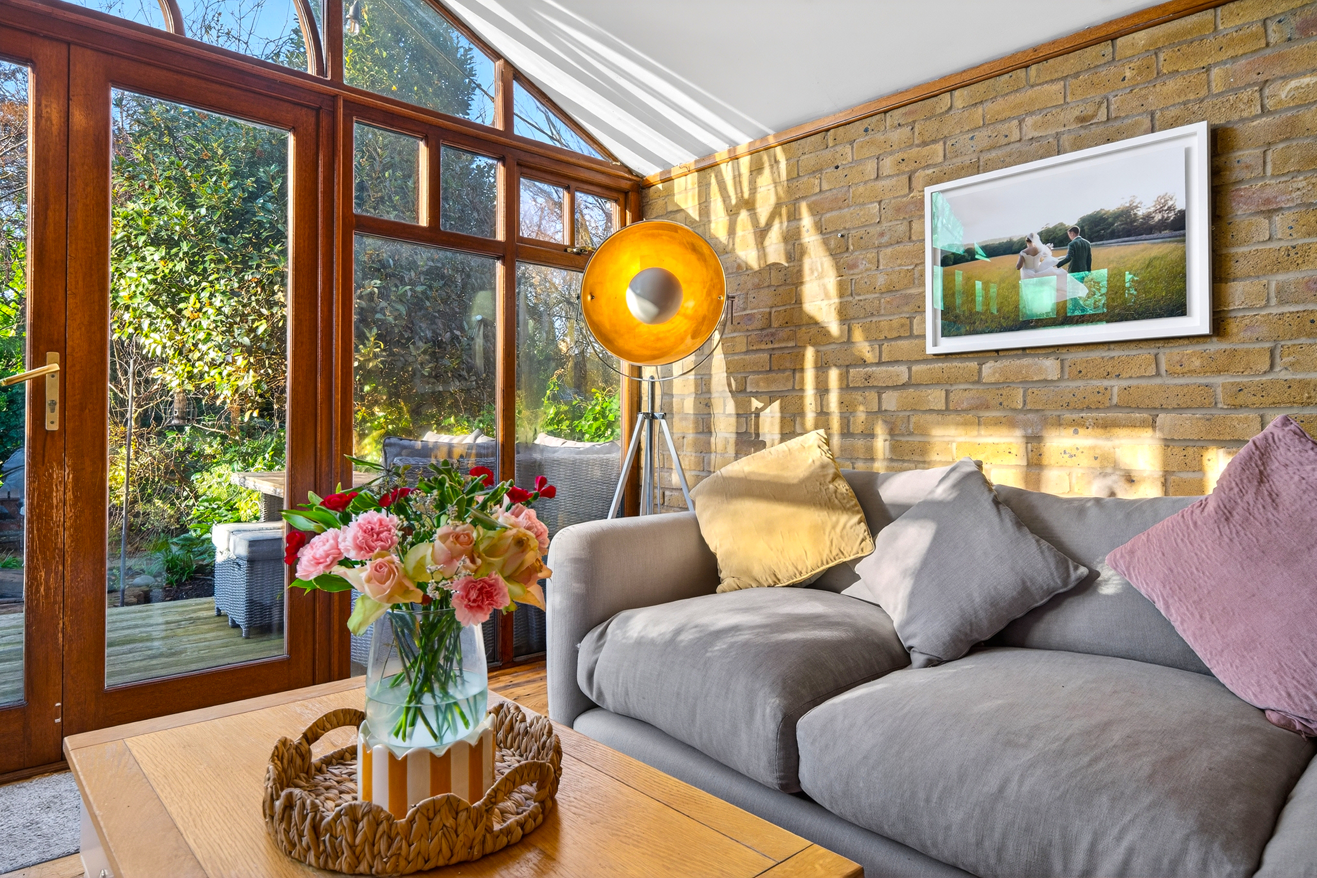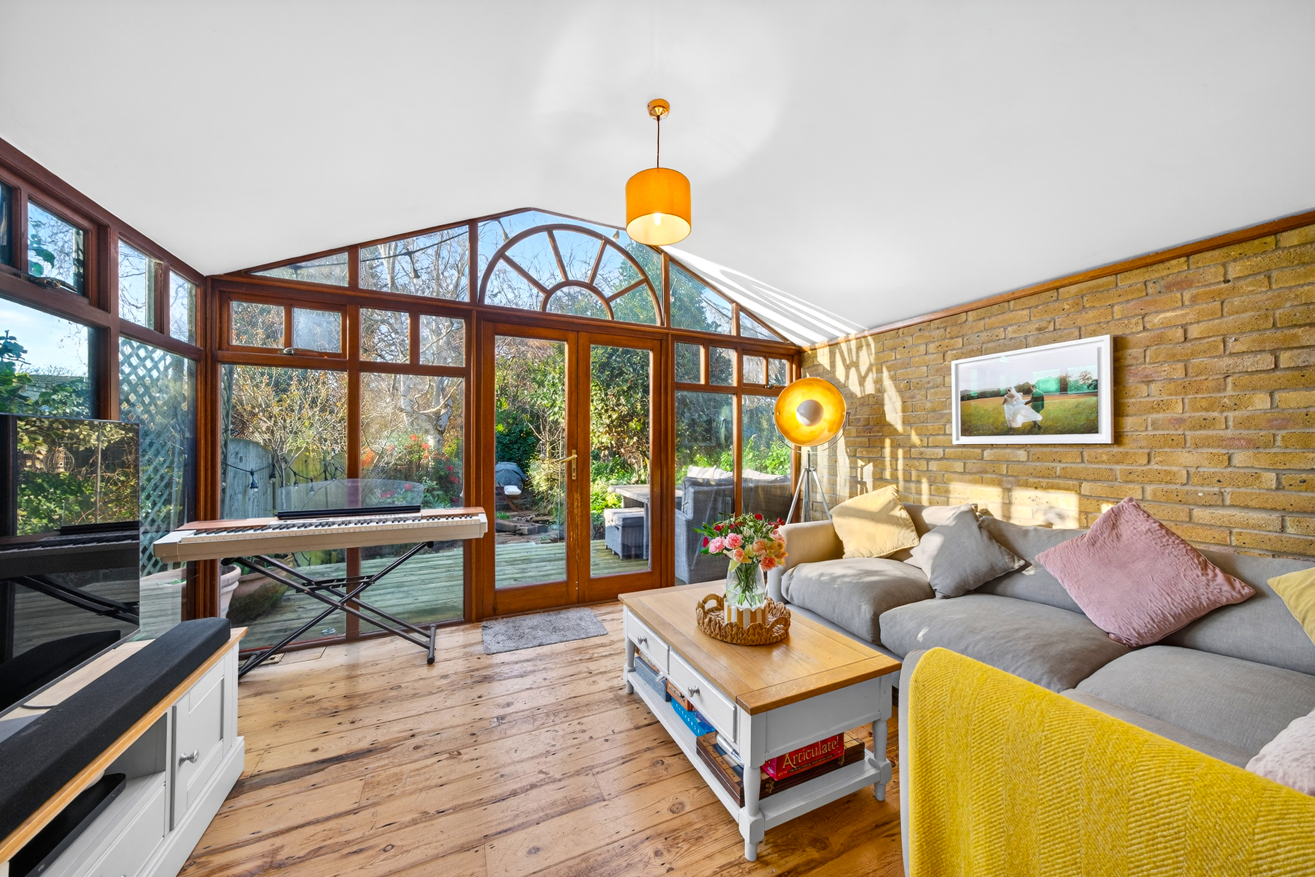 - Decked outdoor seating area, accessed via French doors from the living room
