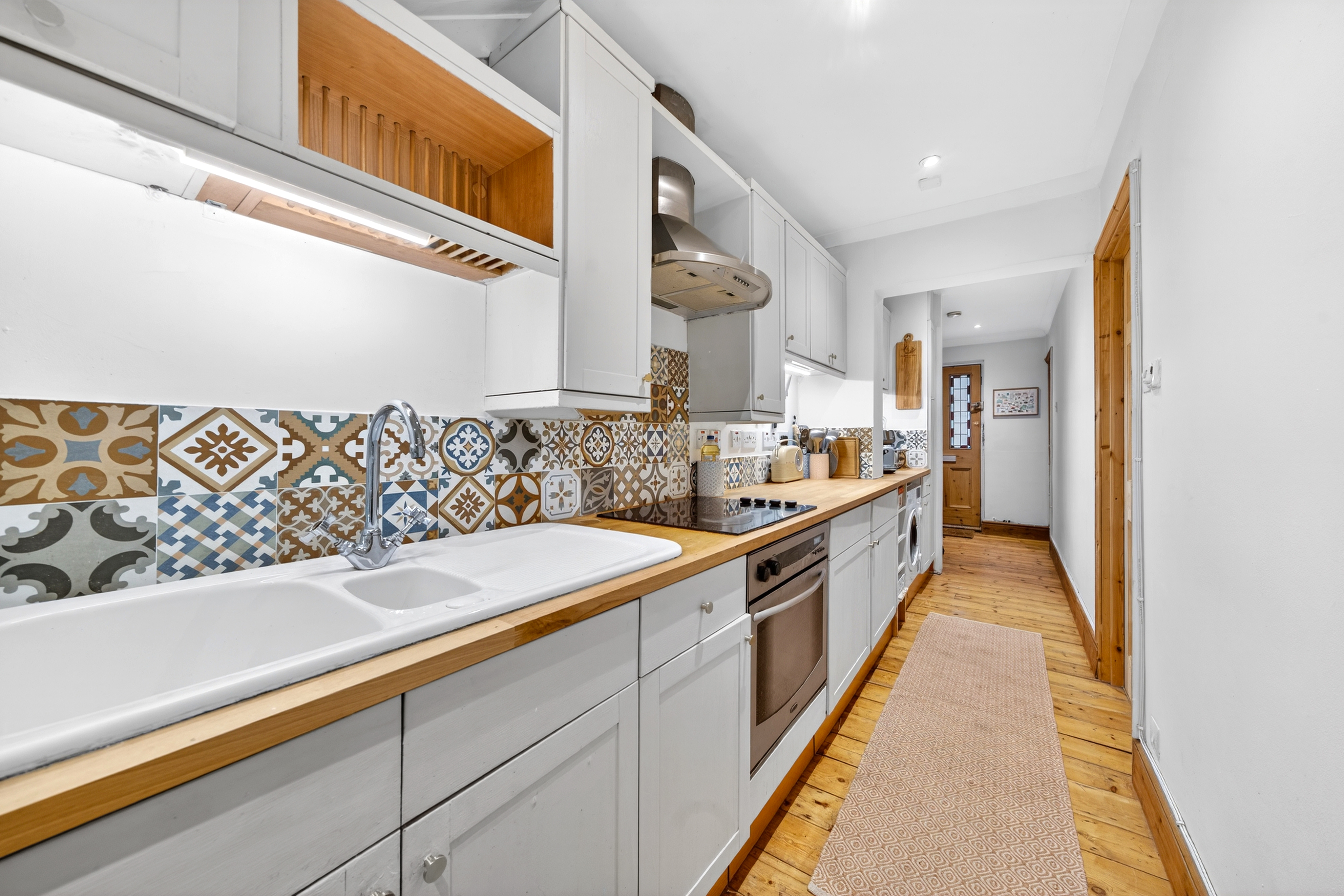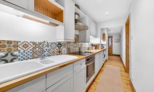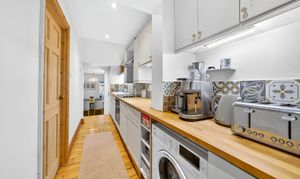 A kitchen with integrated appliances and wooden countertops provides a delightful space for cooking, while the contemporary bathroom offers a shower over the freestanding bath, and stylish mirroring and tilework. The main bedroom is a good size with built-in wardrobes, and there is in addition an office which the current owners have also used as a guest room.