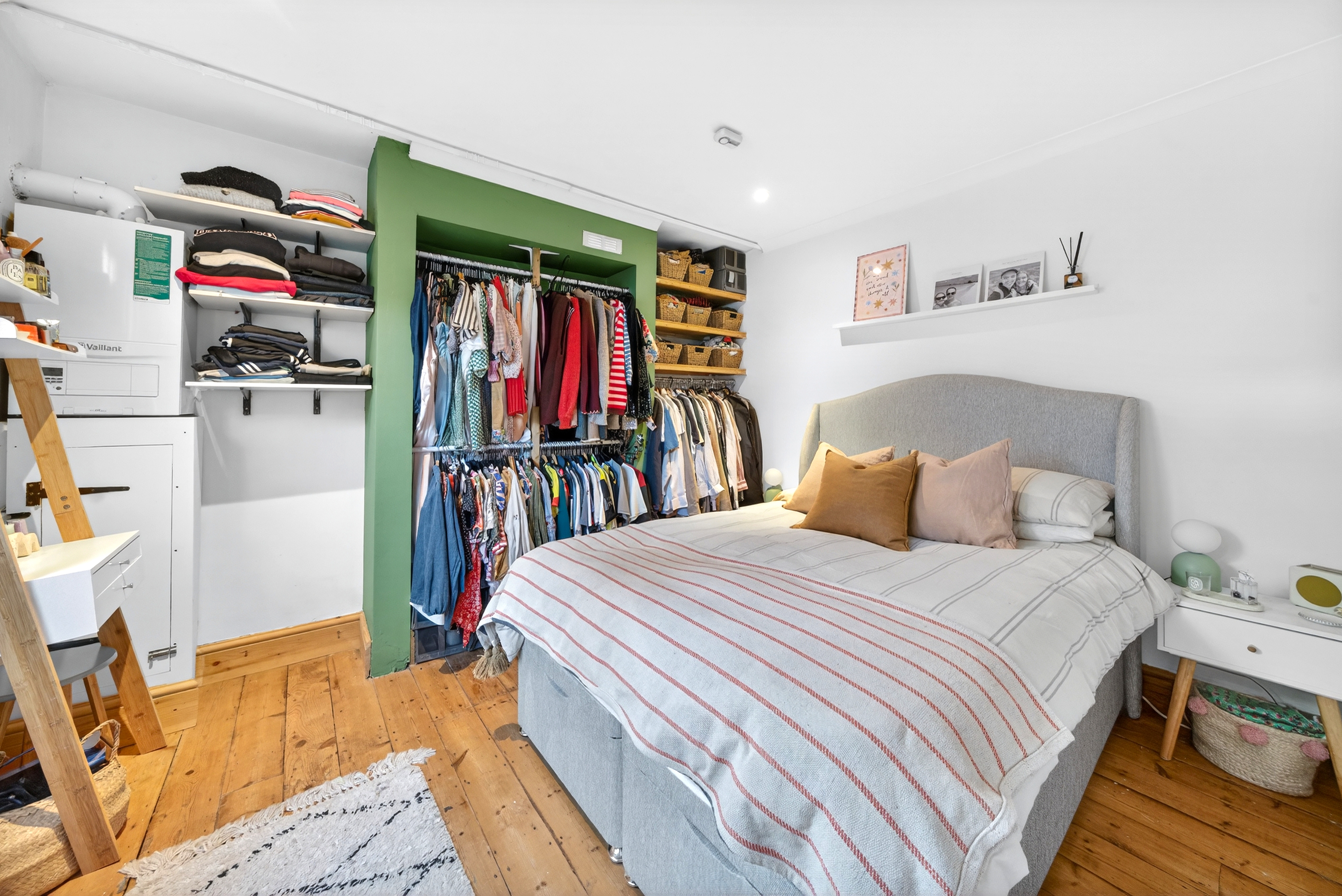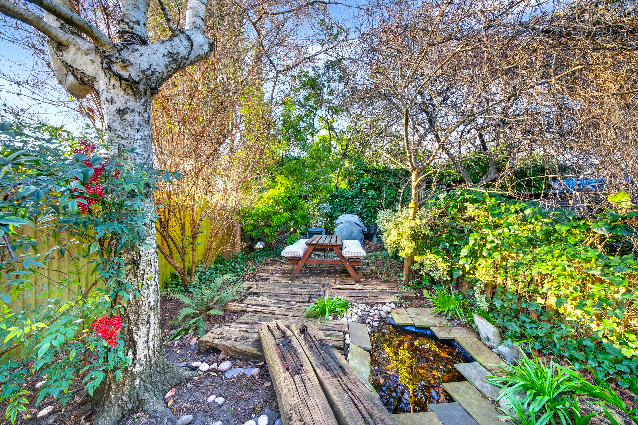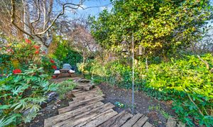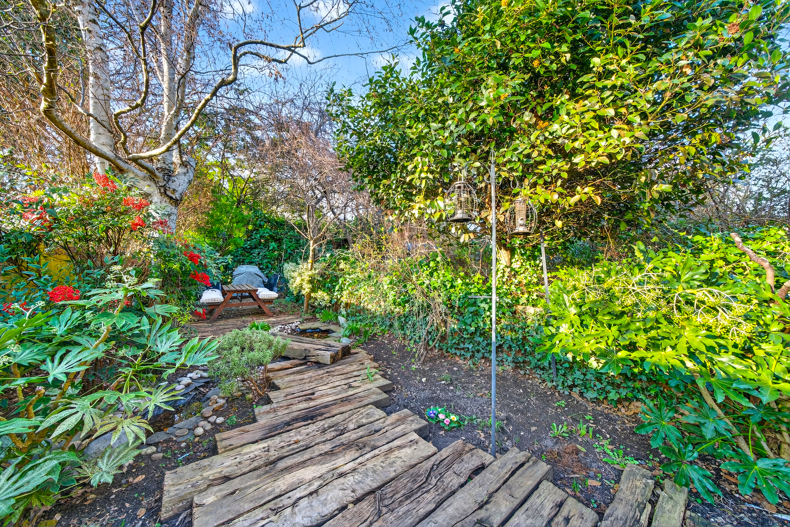 The flat enjoys direct access to its private garden via French doors from the living space, leading to a decked outdoor seating area and a beautiful mature space with trees, lush planting and a water feature. The garden is open to the west, so it receives summer sun during the afternoon and late in the day. The private garden backs onto Luxmore Gardens, enhancing the sense of greenery and tranquillity. These outdoor spaces offer perfect retreats for relaxation or entertaining guests, complementing the indoor comfort with serene, natural surroundings.