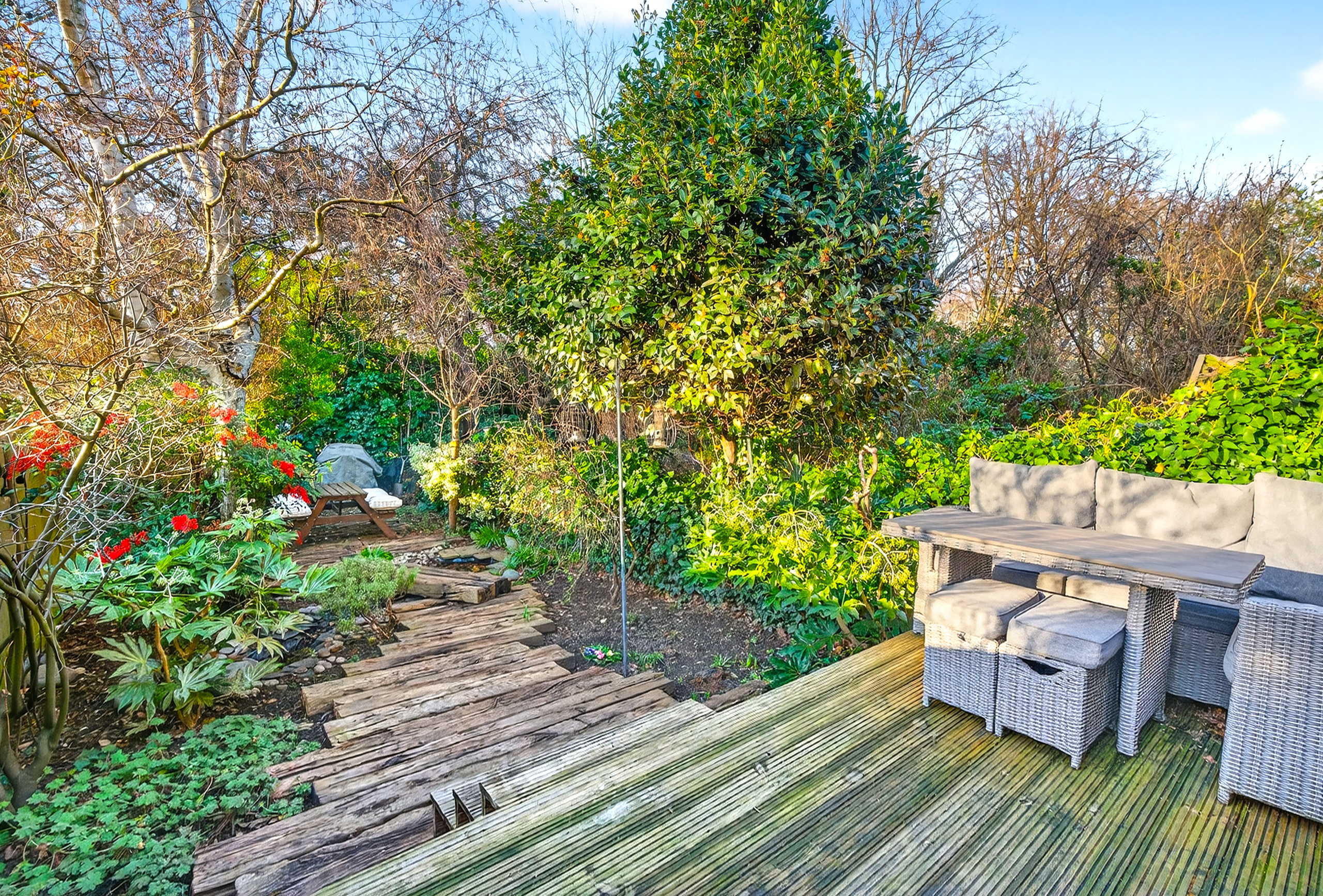 Large mature private garden with decked seating area, open to the west, and backing onto Luxmore Gardens