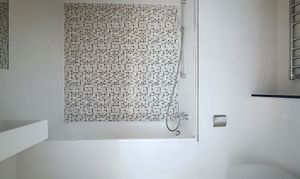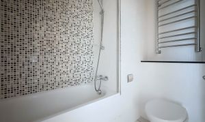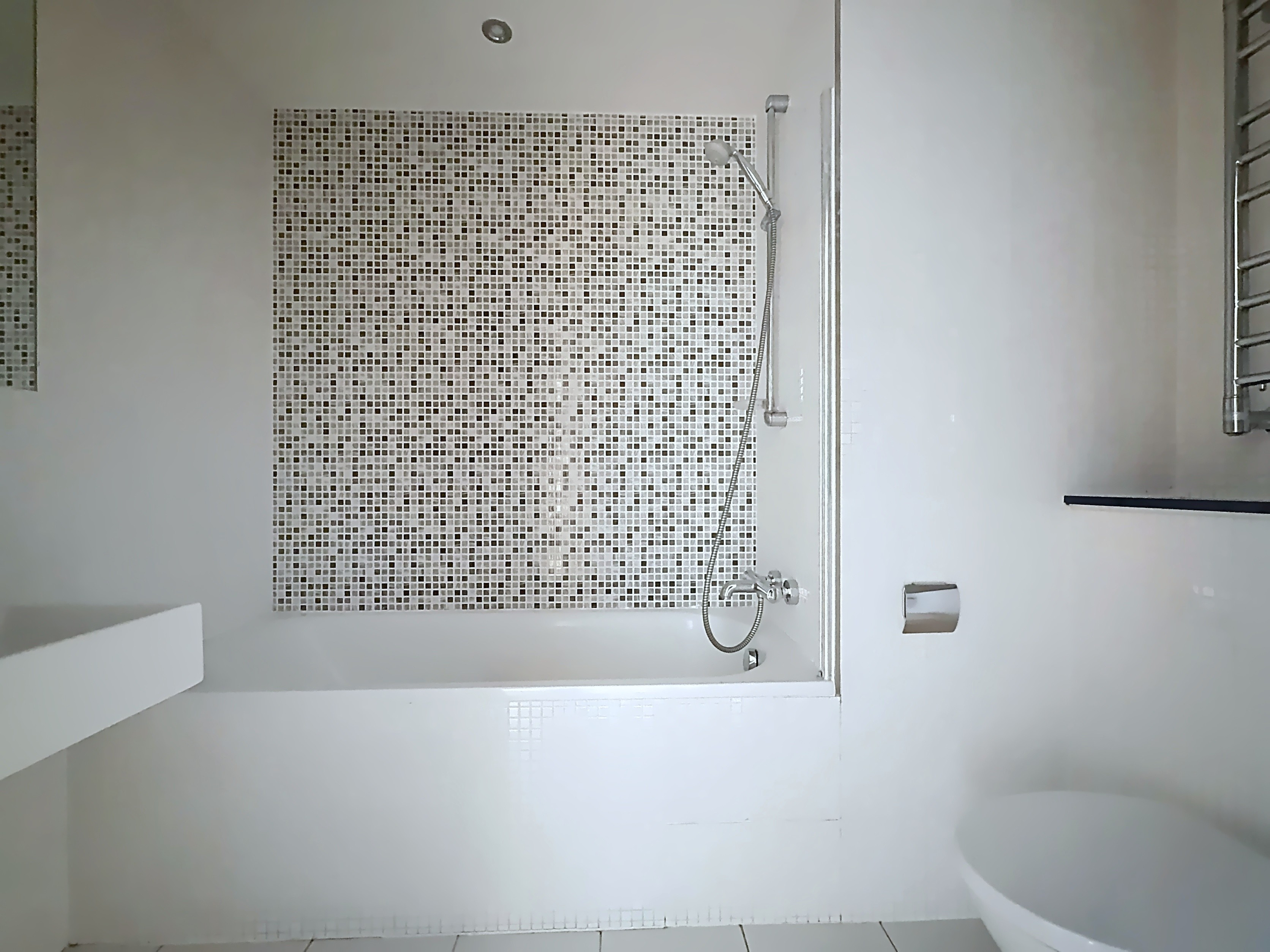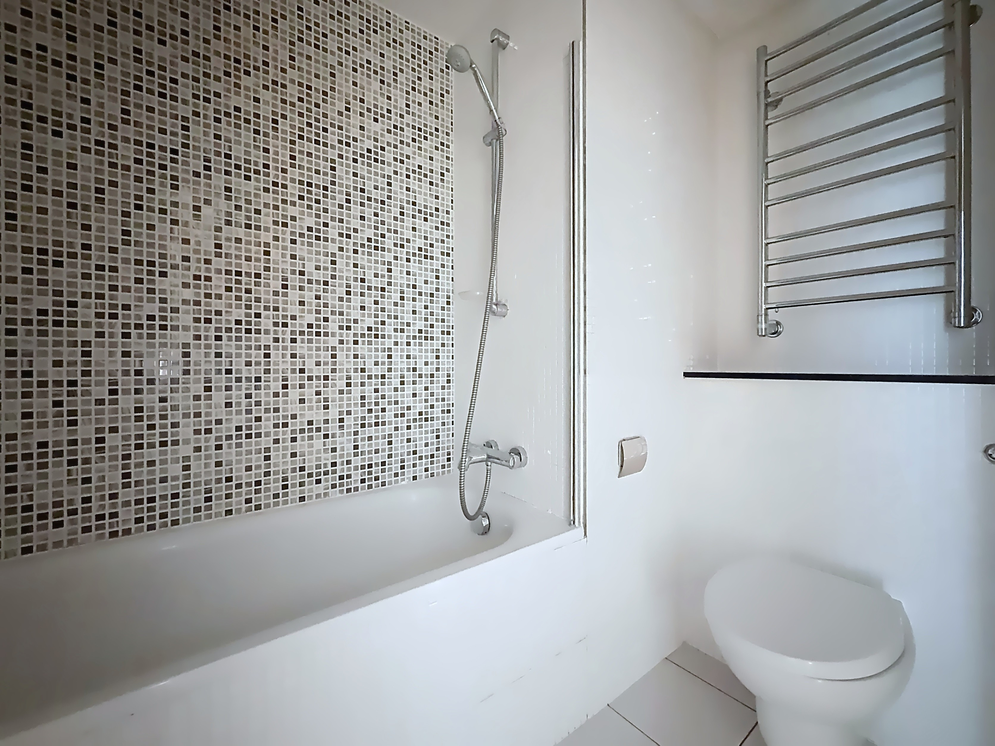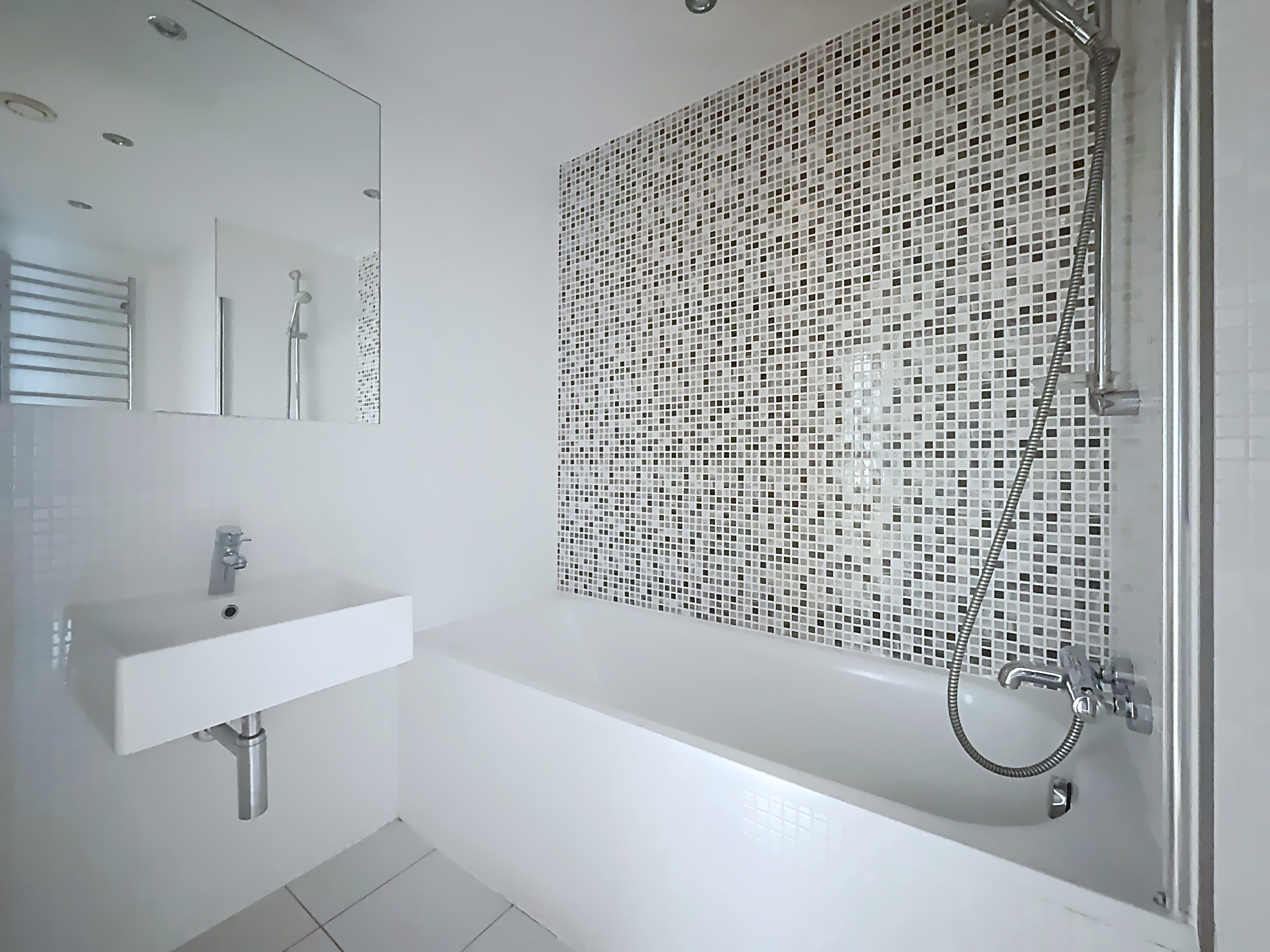 It comprises a bath with shower over, wash basin and WC, creating a practical and functional space designed for everyday use. The neutral décor ensures the room feels bright and clean while complementing the overall style of the apartment.