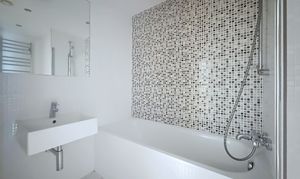 BathroomThe bathroom is finished with modern tiling and contemporary fittings.