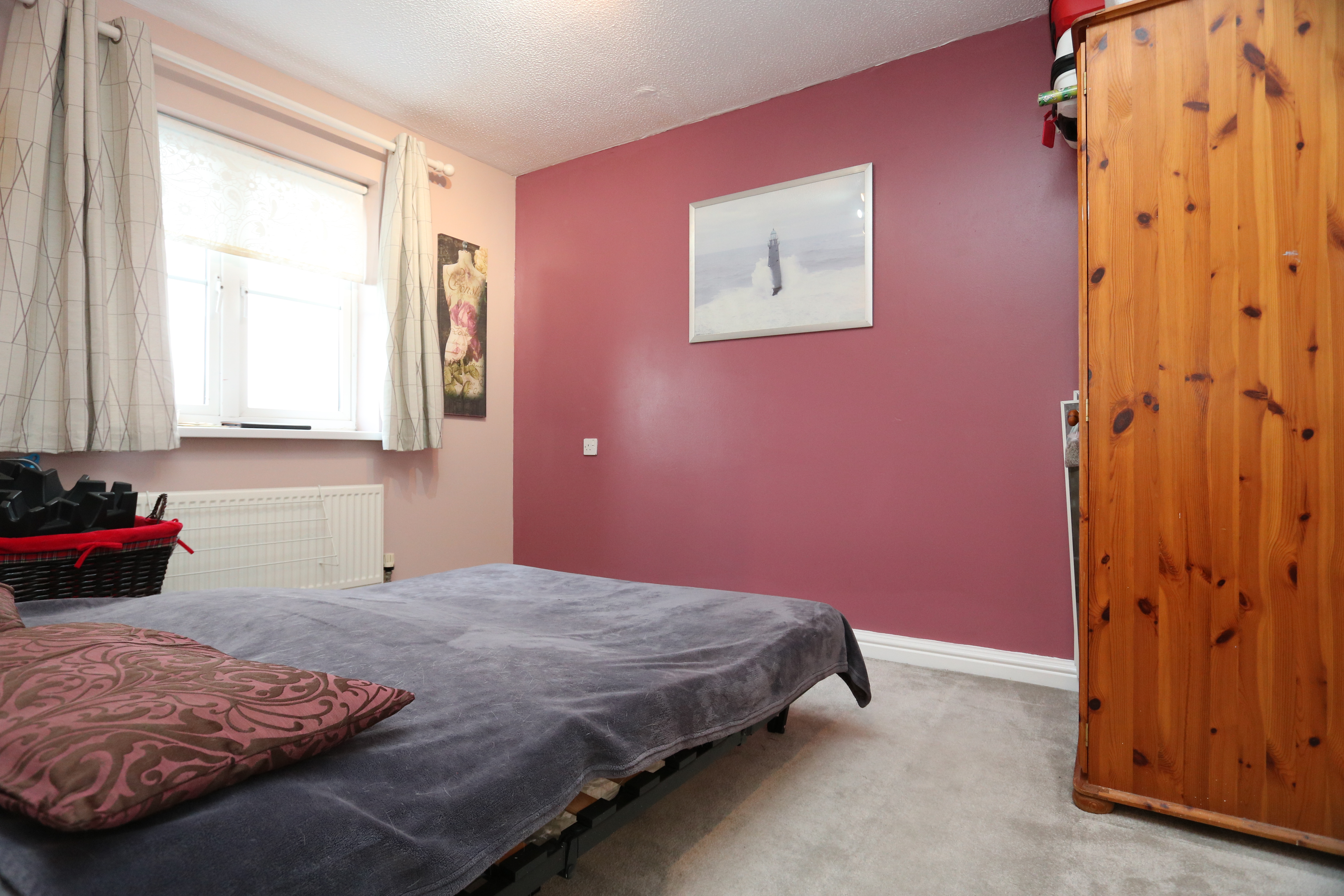 Bedroom two is carpeted with smooth walls and a textured ceiling. There is a front aspect window and a radiator.