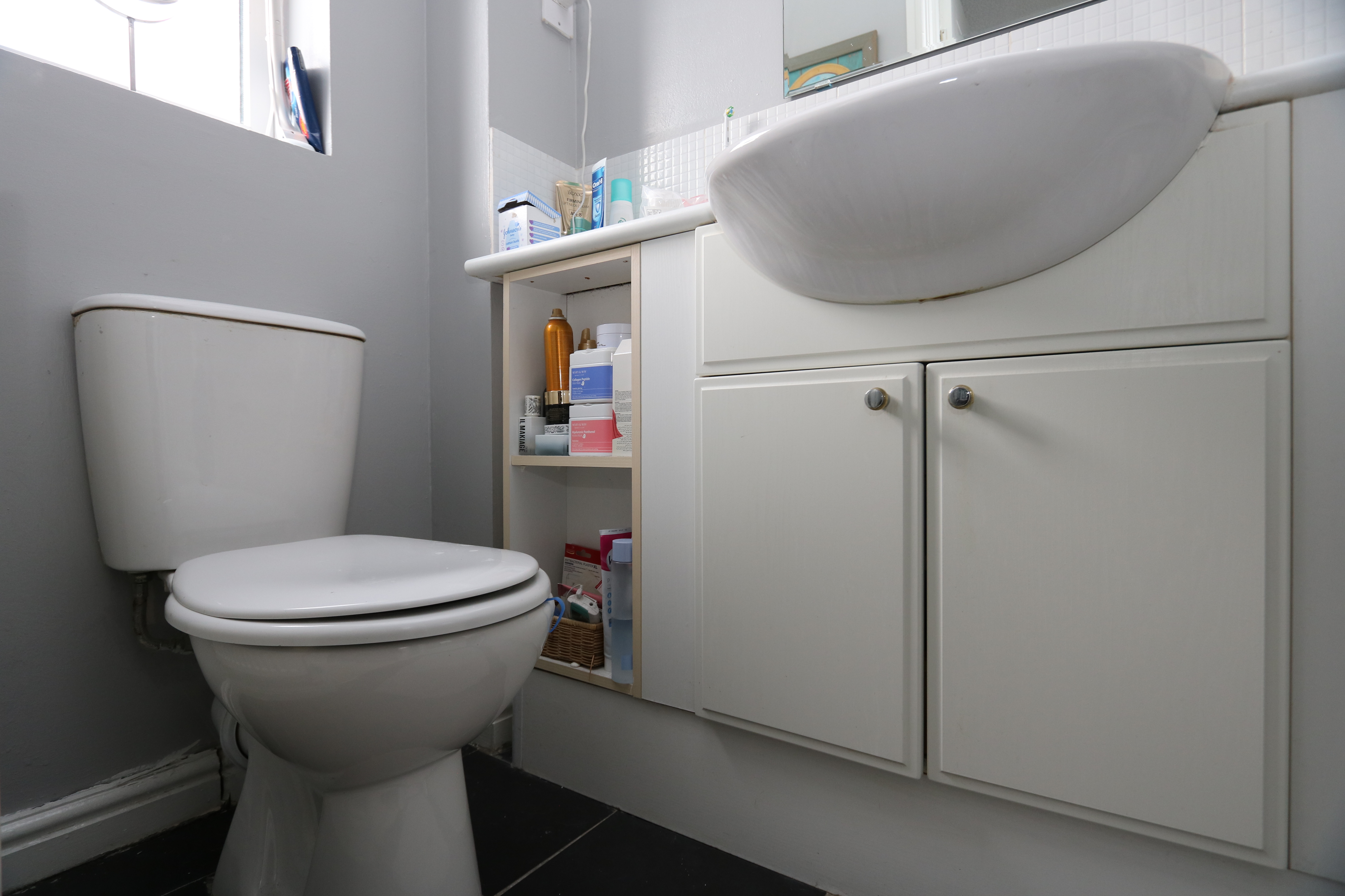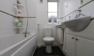 The family bathroom has tiled flooring, smooth walls and a textured ceiling. There is a three-piece white suite comprising a WC with a push button flush, a washbasin with a stainless steel mixer tap overtop mounted onto a wooden vanity unit and a bath with a stainless steel mixer tap over top. There is full-height tiling within the bath and a matching splash back behind the sink. There is also a radiator, an opaque side aspect window, a shaver point and an extractor fan.