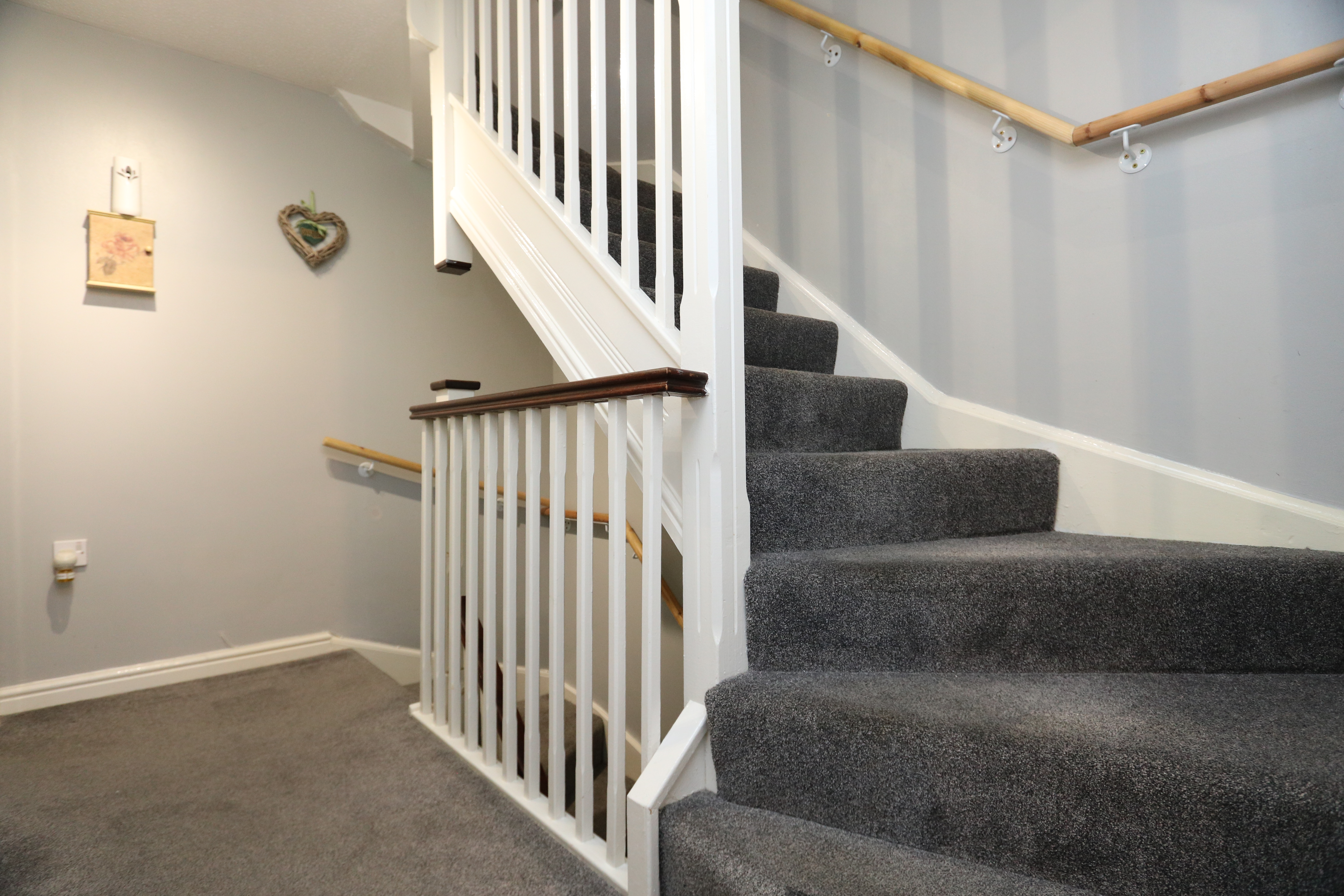 A carpeted staircase leads up to the first floor landing. The landing is carpeted with smooth walls and a textured ceiling. There is a radiator and doors giving access to the lounge and kitchen/diner.
