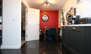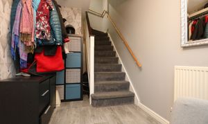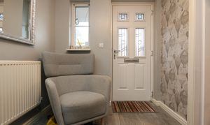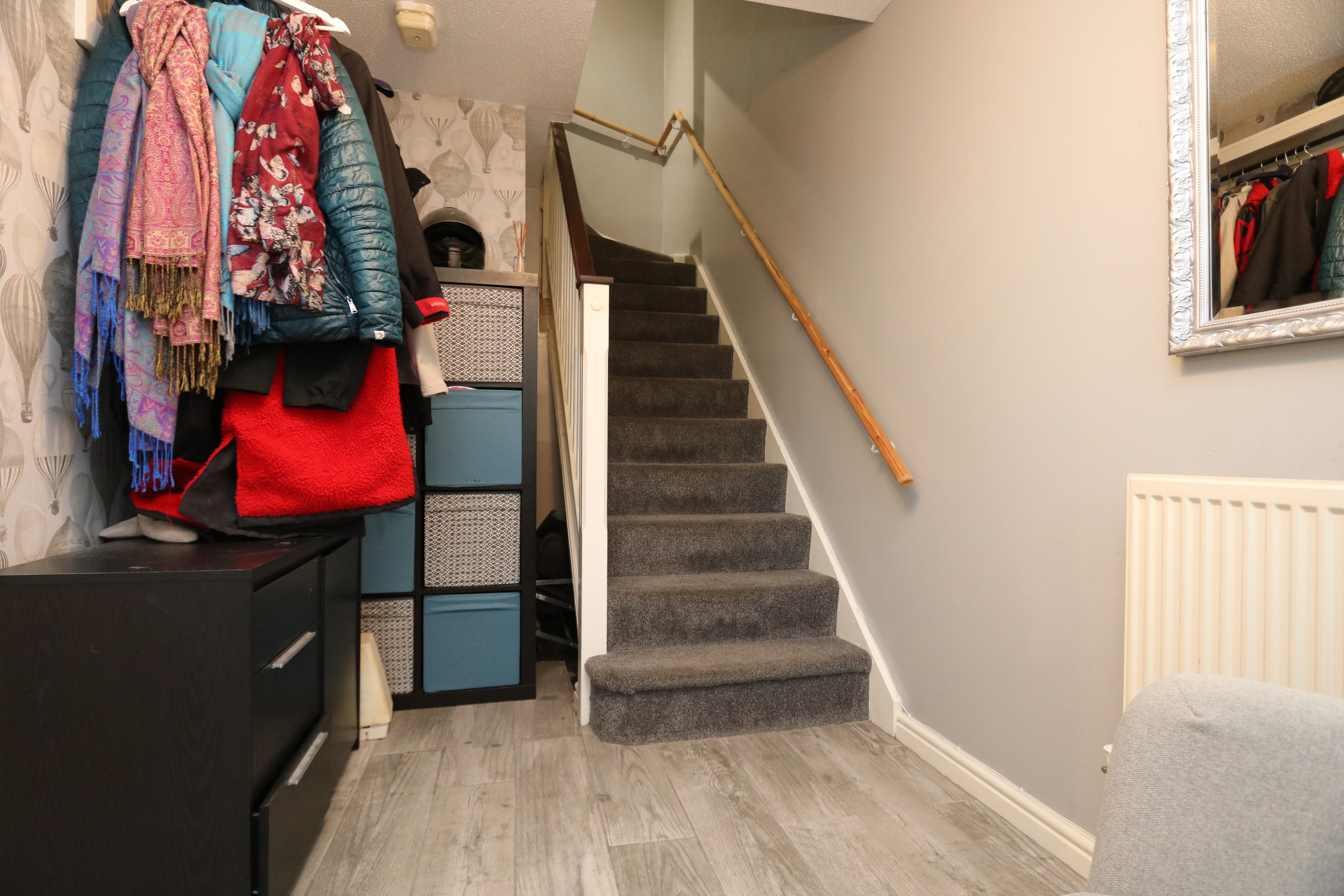 Entrance into the property via a composite front door with opaque glazing into an entrance hallway. The hallway has wood effect floor tiling, papered walls and a textured ceiling. There is a carpeted staircase giving access to the first floor, a radiator, a front aspect window and a door giving access to bedroom four (garage conversion). There is also storage space beneath the stairs.