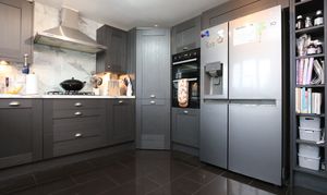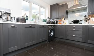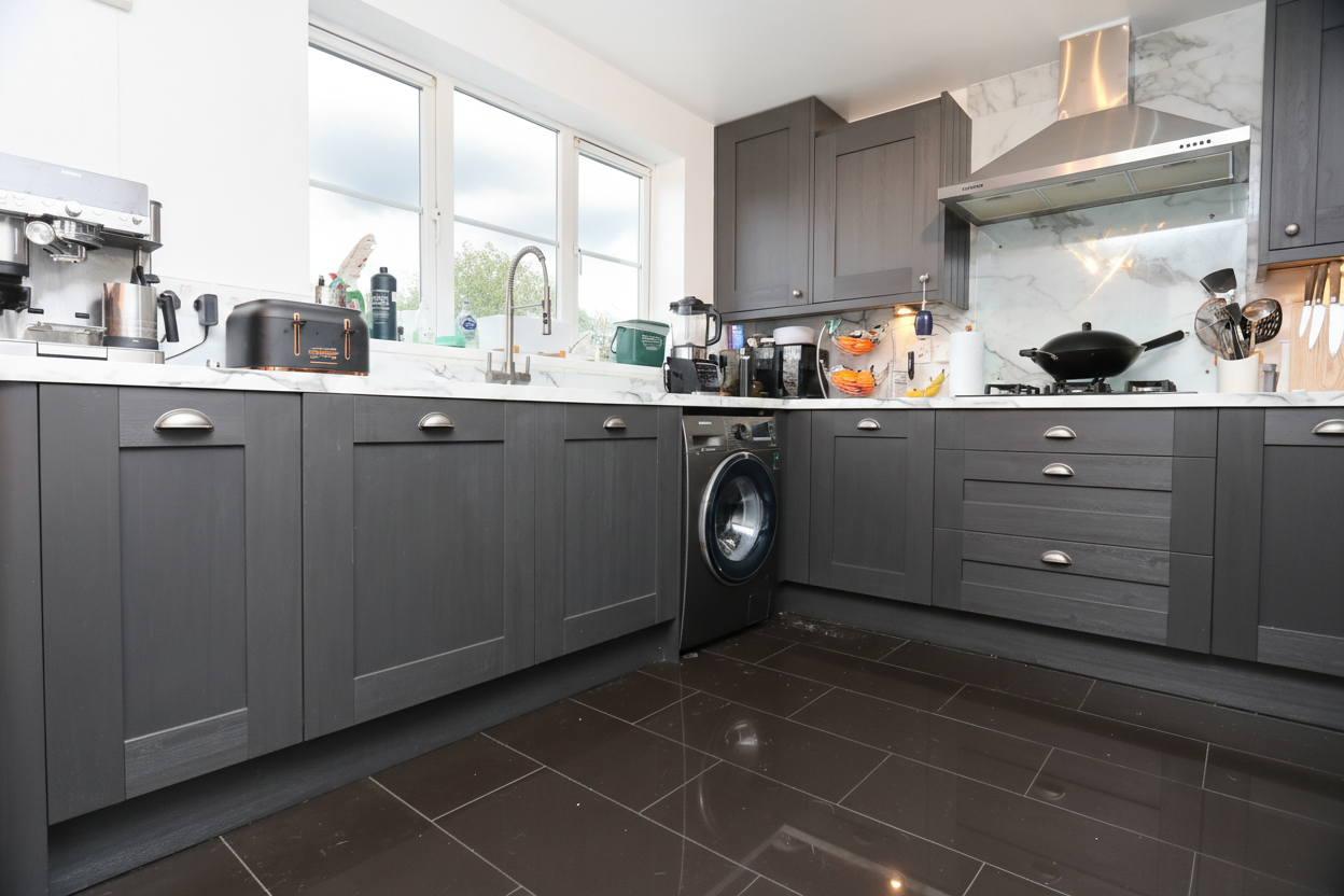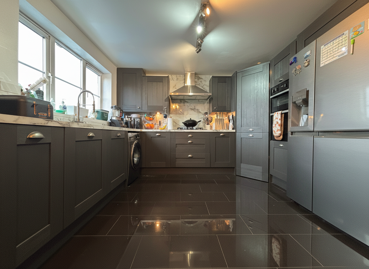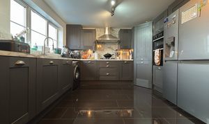 The kitchen/diner has tiled flooring, smooth walls and a smooth ceiling. Two front aspect windows, a radiator and ample space for a dining table and chairs. The kitchen comprises a good range of matching eye and base level units with complementing marble effect work tops. There is a stainless steel sink inset with a stainless steel rinser tap over top. There is space for a large American-style fridge/freezer and space/plumbing for a washing machine. Integrated appliances include an eye-level double oven, a five-ring gas hob, a large stainless steel extractor hood and a dishwasher.