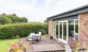 Glazed doors from the main living space open directly onto a decked terrace, offering a sheltered spot to sit out and enjoy the view across the private garden, neighbouring woodland and the delightful rural setting. The space is low-maintenance and neatly enclosed, with dedicated private parking for several cars.
