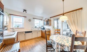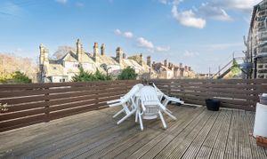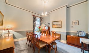 Fronted by a neat forecourt patio, the house opens via an entrance porch into a welcoming reception hall. To the front elevation, the bay fronted living room retains a wealth of period charm including a central fireplace, decorative ceiling rose and well preserved cornicing. Adjoining is a formal dining room large enough to accommodate a family sized table, ideal for entertaining. To the rear, the fitted kitchen with a range of units leads through to a garden room with access out to the raised decked seating area.