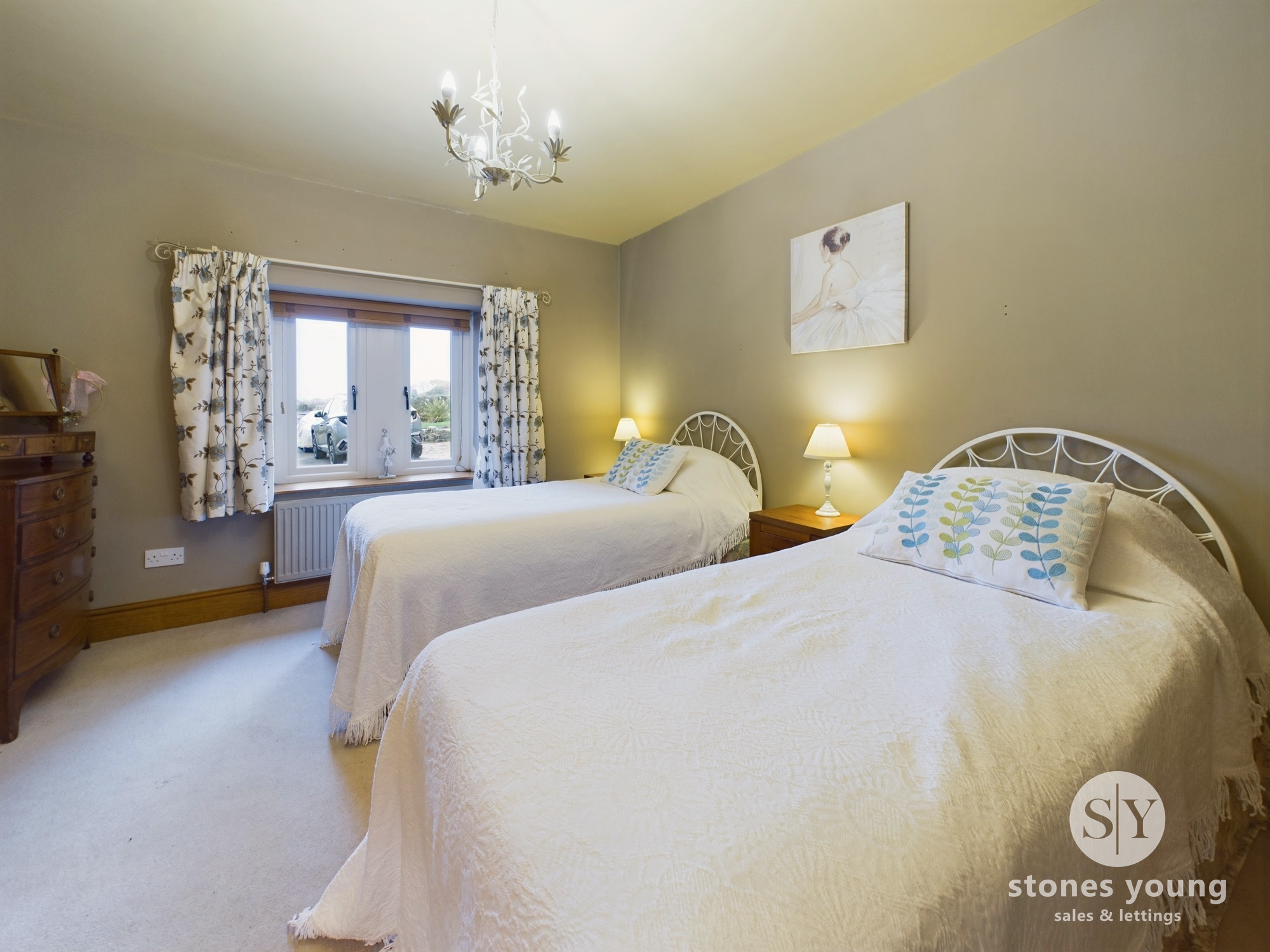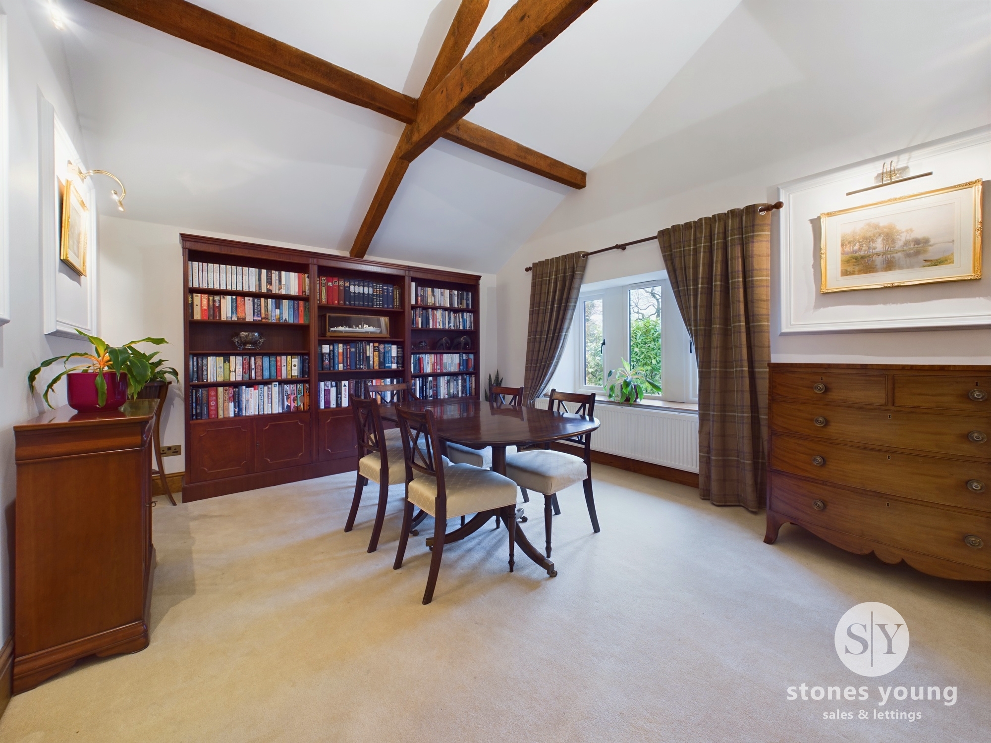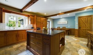 This prestigious property is entered through a spacious vestibule into a statement entrance hall, brimming with grandeur. The main reception room provides the perfect space for the family to relax around the multi-fuel burning stove set in a stunning stone Inglenook fireplace. The living room flows into the spacious dining area with a vaulted ceiling, through a rustic stone archway adding a touch of charm. The dining-kitchen acts as the heart of the home with surrounding Oak wall and base units and complementary granite work surfaces with a central island and breakfast bar ensuring plentiful worktop space. The kitchen opens into the bright and airy orangery with beautiful views of the garden and fields beyond. The Orangery benefits from 2 sets of bi-fold doors, which allow the room to be opened up into the garden, providing a perfect balance of indoor-outdoor living; the ideal space for entertaining. Just off the kitchen, a conveniently located utility room, larder and airing cupboard provide the essential space of any family home. Also on the ground floor, accessed from the main hallway is Bedroom 4, a centrally located bathroom with 3 piece suite, an office, with bespoke built in desk and shelves, a gym, and 3 large walk-in cupboards. One further reception room, with views of the garden is currently being utilised as a snug, and leads into the 5th bedroom. The house boasts plentiful storage space with a garage, easily accessible under-stair storage and two separate boarded loft spaces.