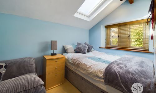 Single bedroom with carpet flooring, velux window and double glazed uPVC window, panel radiator.