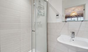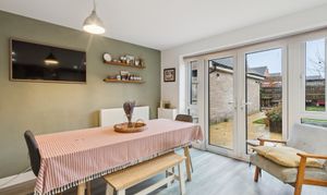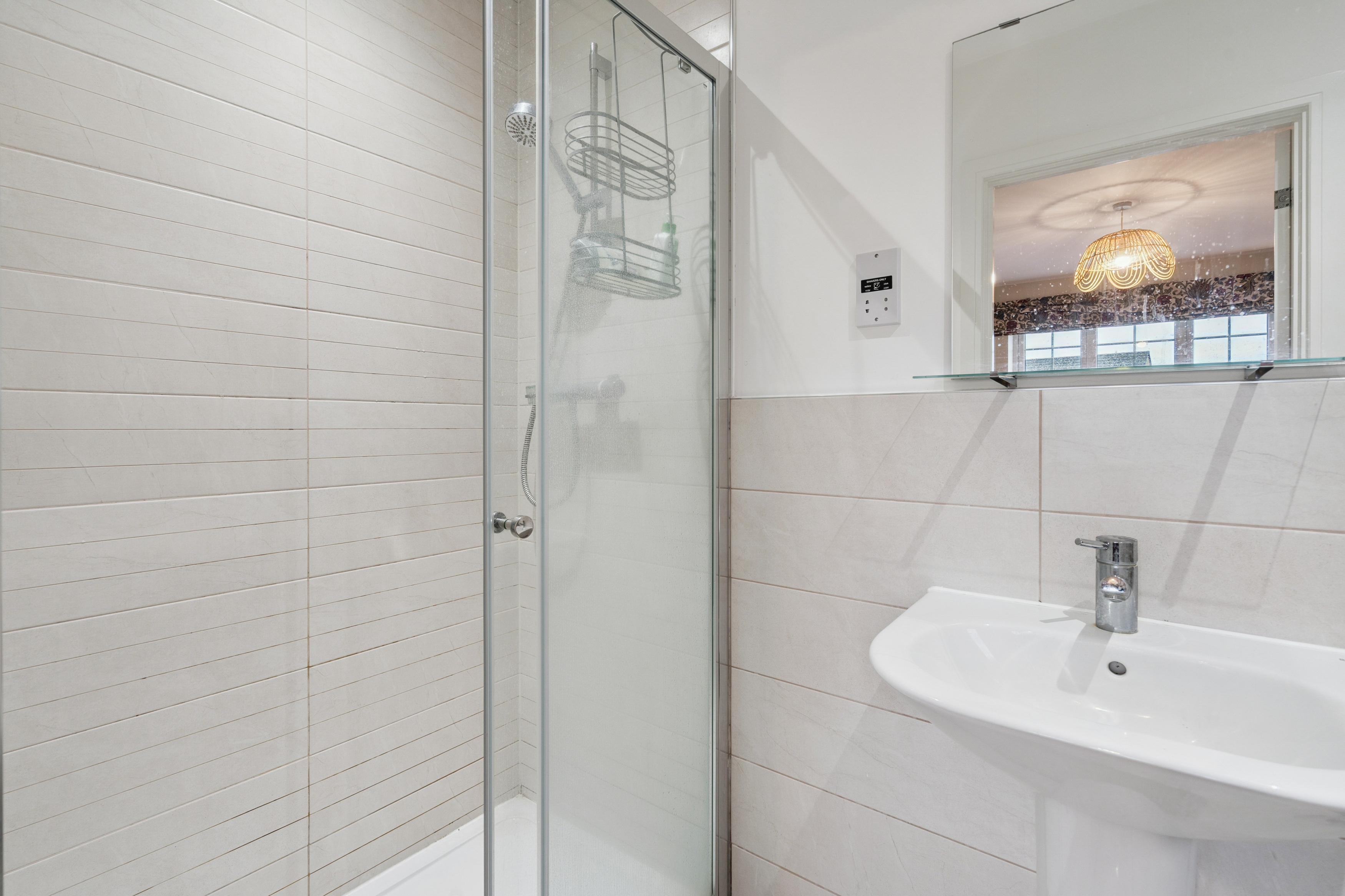 Upstairs, there are three well-proportioned double bedrooms. The principal bedroom includes built-in wardrobes and a private en-suite shower room, while a modern three-piece family bathroom serves the remaining bedrooms.
