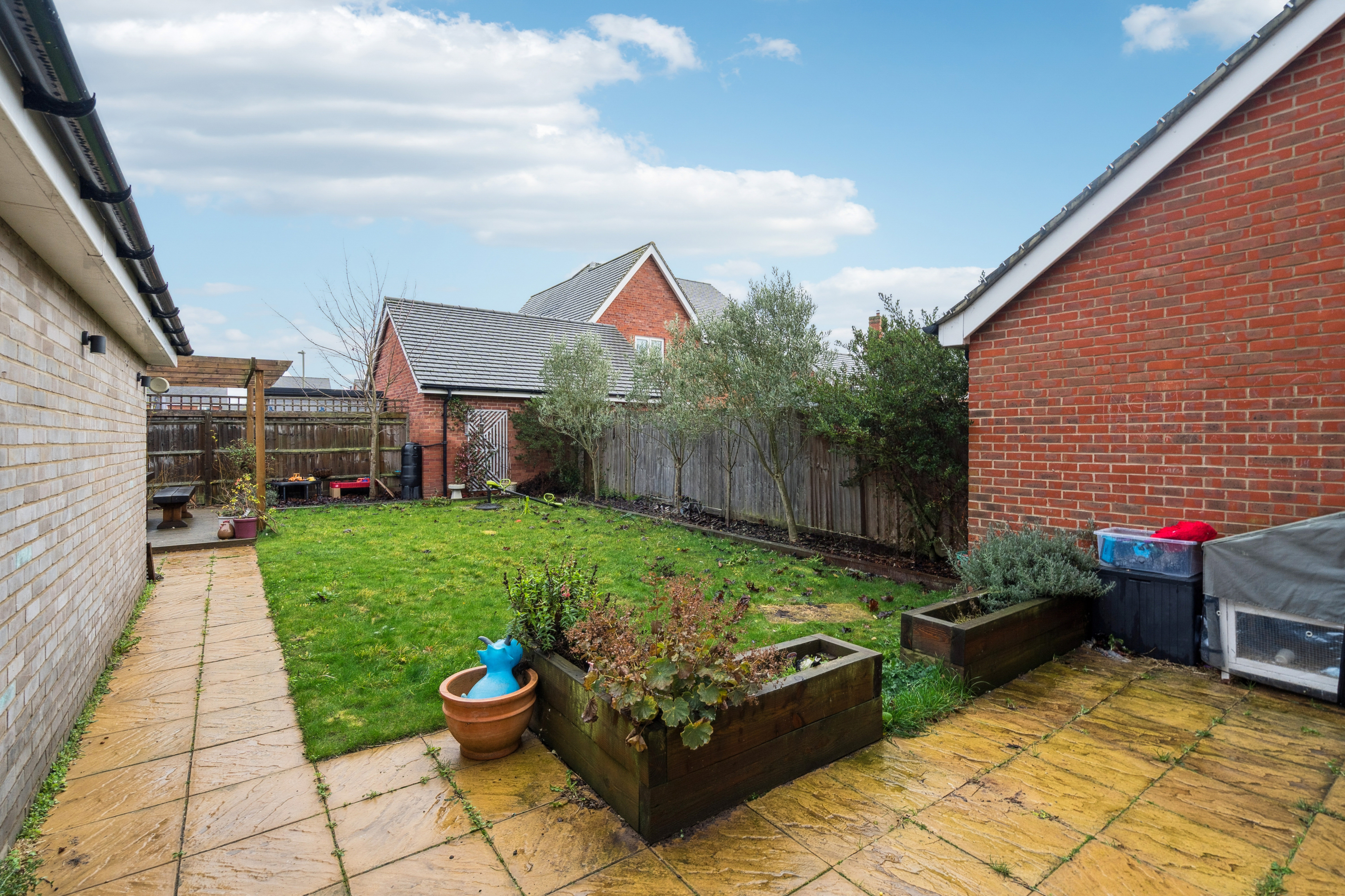 - Block-paved driveway for 2–3 cars, garage, front lawn with planting, and landscaped rear garden with patio