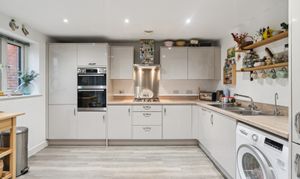 The ground floor features a welcoming entrance hall giving access to the generously sized living room and an impressive kitchen/breakfast room. The kitchen is superbly proportioned, with French doors opening onto the garden, an excellent range of eye-level and base units, and a selection of integrated appliances. A downstairs cloakroom and useful under-stair storage complete the ground floor accommodation.