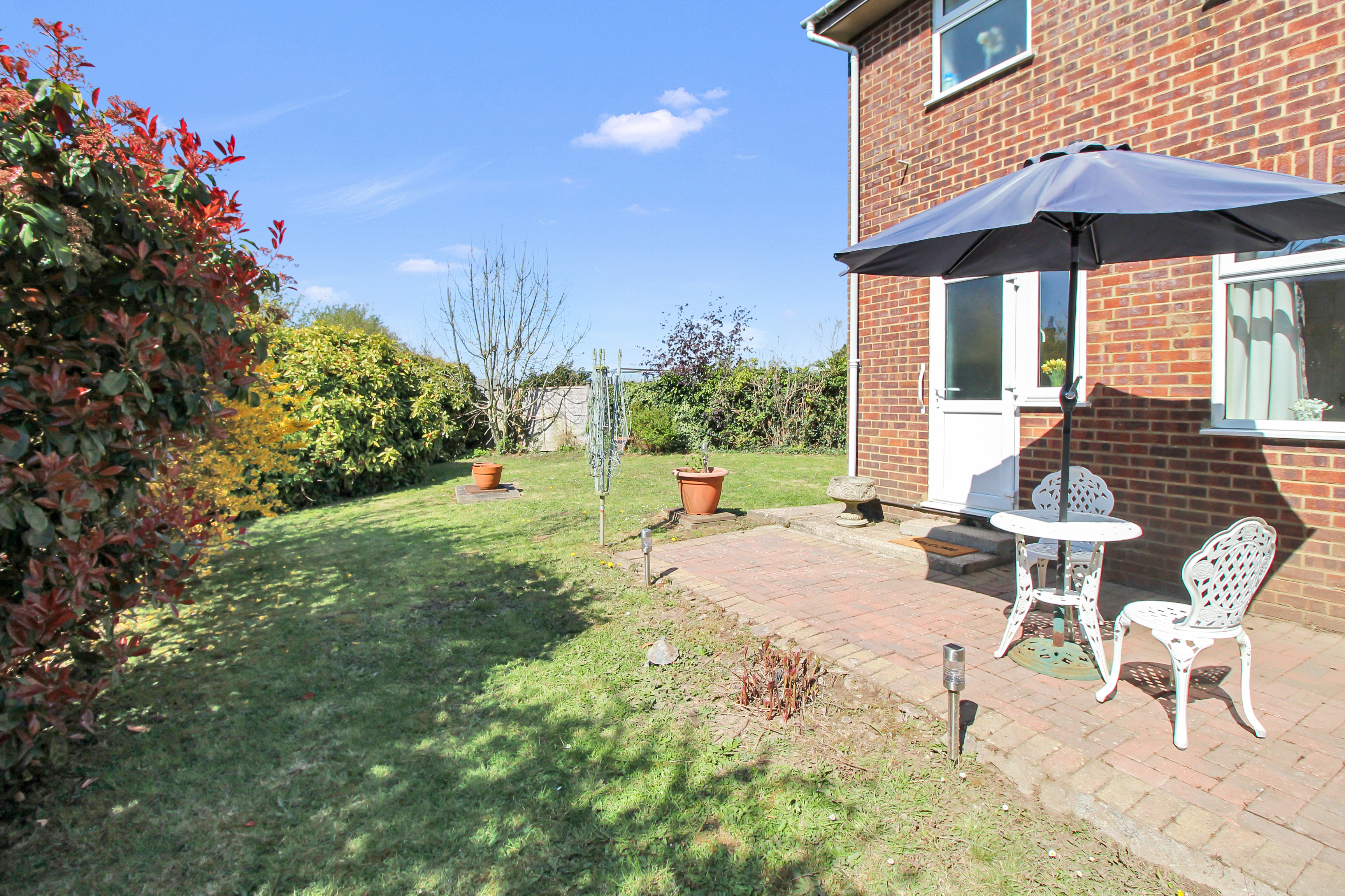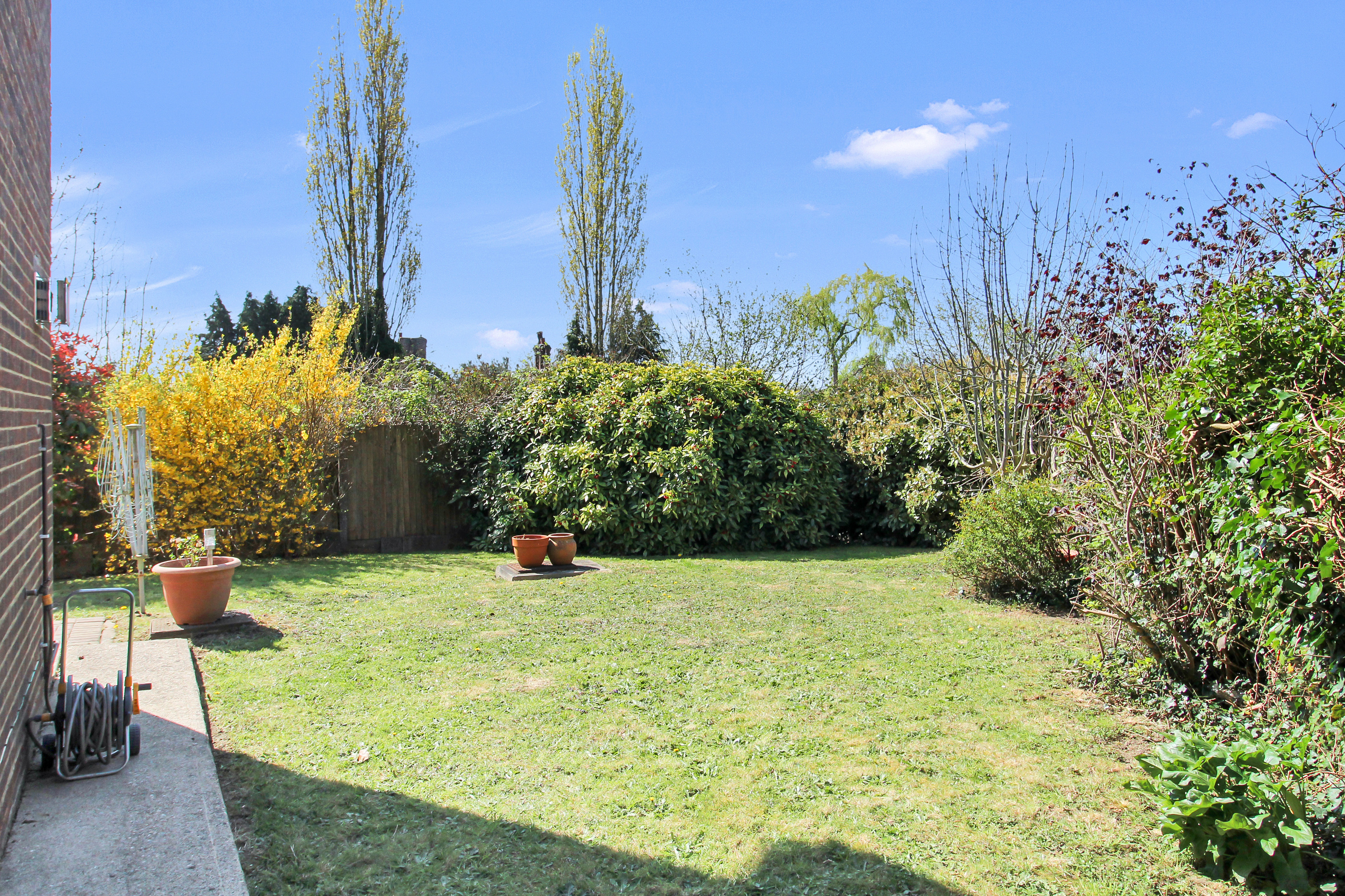 A generously sized, south-facing corner garden, mostly laid to lawn with some planted bushes and shrubs, fenced boundaries with gated side access and paved seating adjacent to the rear of the house.